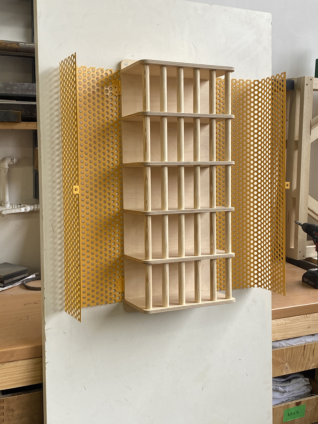 The materials used are: birch pywood and pine dowels for the shelf, and perforated sheet steel for the doors, keeping the shelf open and airflow possible.