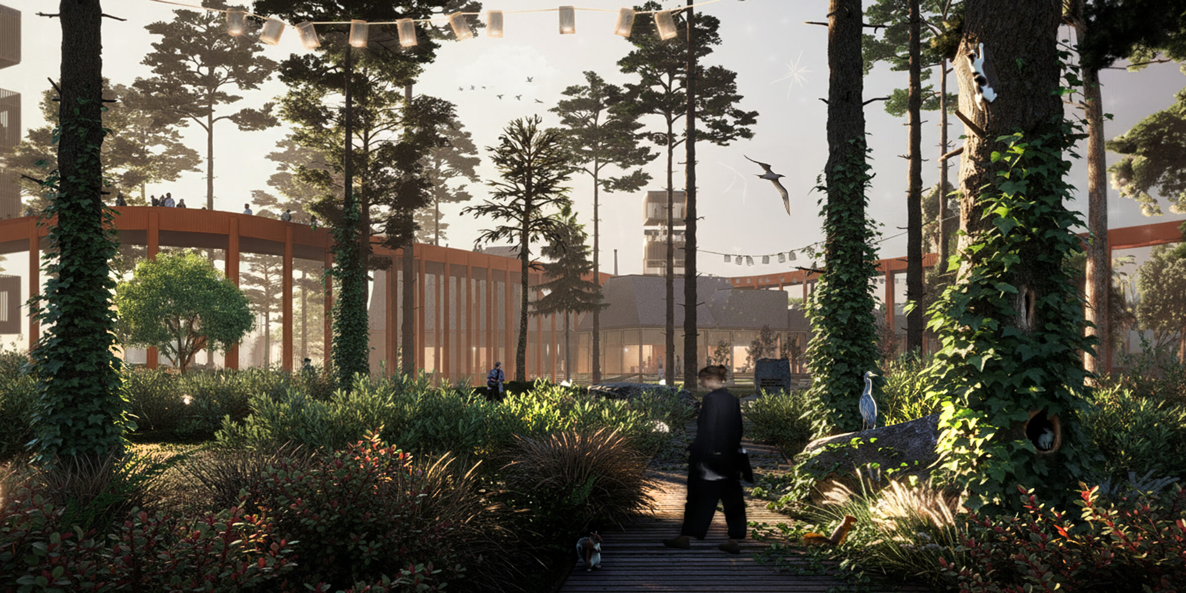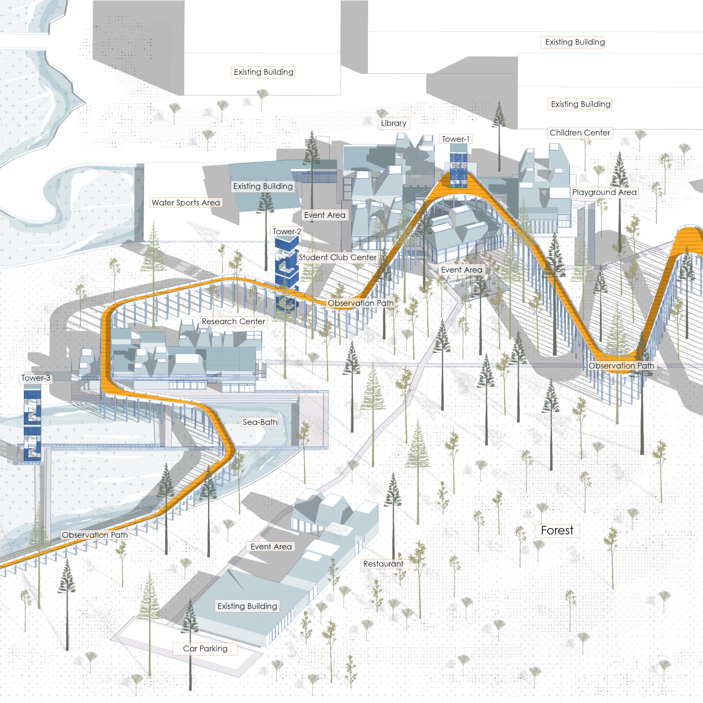 Located adjacent to the former Şişecam industrial facilities, ECOFLOW addresses a post-industrial void left behind by the removal of manufacturing infrastructure. The project proposes the ecological and social regeneration of this abandoned terrain by transforming it into a productive landscape. Rather than erasing its industrial past, the design integrates traces of memory into a new environmental system structured around water cycles, native vegetation, and collective use. Social interaction becomes the catalyst for ecological recovery: pathways, community platforms, and shared open spaces activate the site while reinforcing biodiversity. ECOFLOW redefines the area not as a leftover industrial edge, but as a living ecological corridor that reconnects people, landscape, and memory.