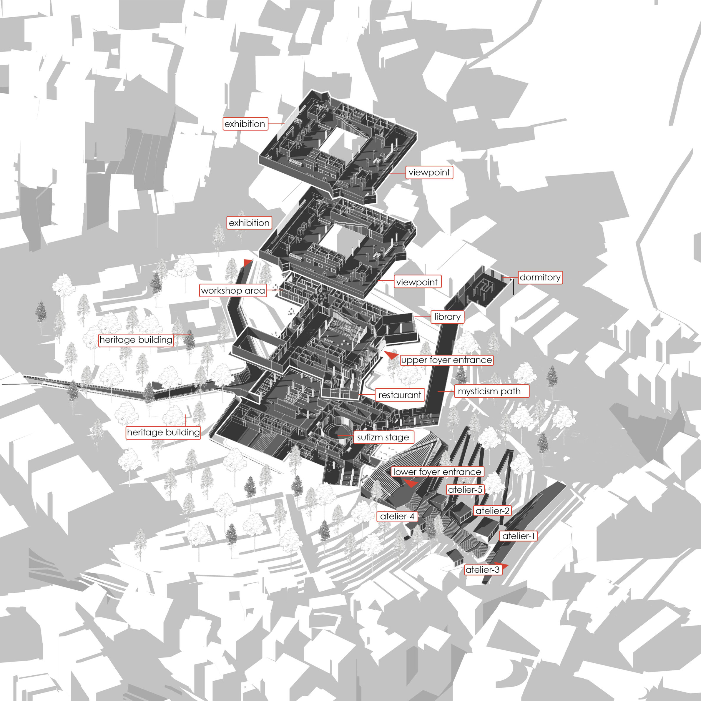 Located in Eyüpsultan, the project responds to the gradual loss of urban identity and spiritual depth within a historically layered district. Rather than proposing a singular object, it constructs a spatial narrative that reconnects fragmented memory, landscape, and collective consciousness. The museum is conceived as a sequence of thresholds carved into the terrain, where light, silence, and movement guide visitors through moments of reflection. By embedding architecture into the topography, the project reactivates the site’s spiritual atmosphere and reinterprets Eyüpsultan not as a frozen heritage image, but as a living urban memory. It proposes architecture as a medium of reconciliation—between past and present, city and landscape, body and spirit.