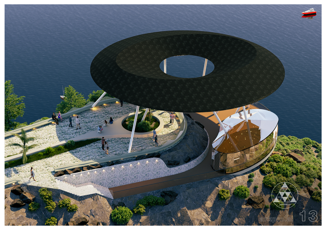 The core form of the structure is inspired by abstract stone sculptures, bringing to life a modern interpretation of nature and materiality. The monumental canopy takes on a Möbius-like shape an infinite loop that evokes a sense of continuity and fluidity. This element symbolizes the union between human and nature, creating an experience of timeless spatiality hovering above the sea horizon.