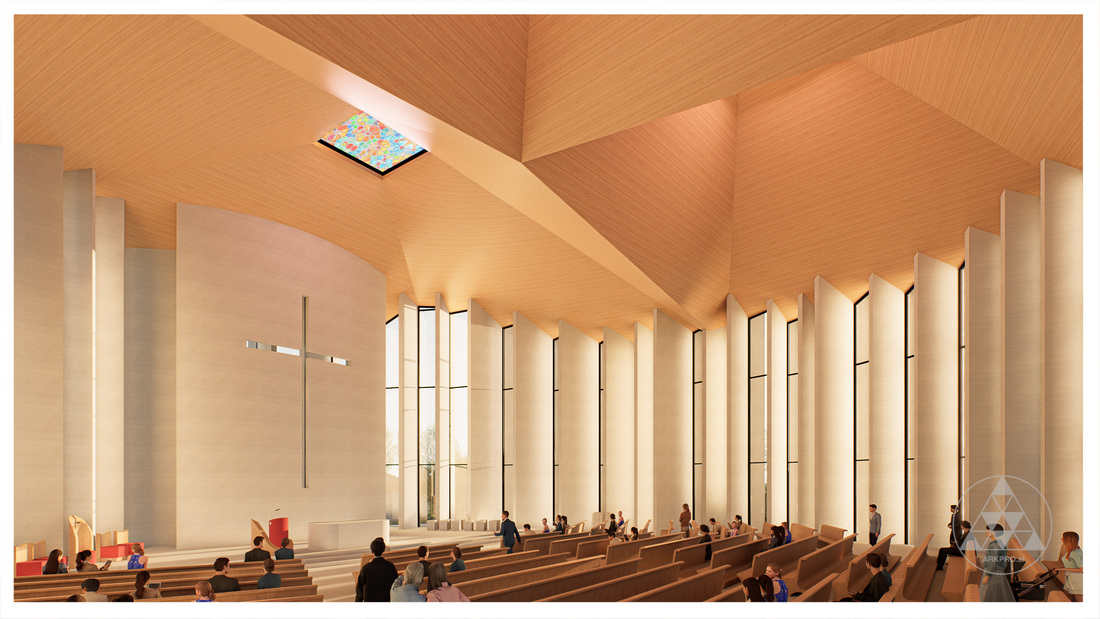 The building's silhouette is defined by a dynamic geometry that culminates in three domes on the roof referencing traditional ecclesiastical forms while reinterpreting them with a contemporary spatial language. The contrast between the vertical stone fins and the curved domes generates a dialogue between lightness and solidity, movement and serenity.