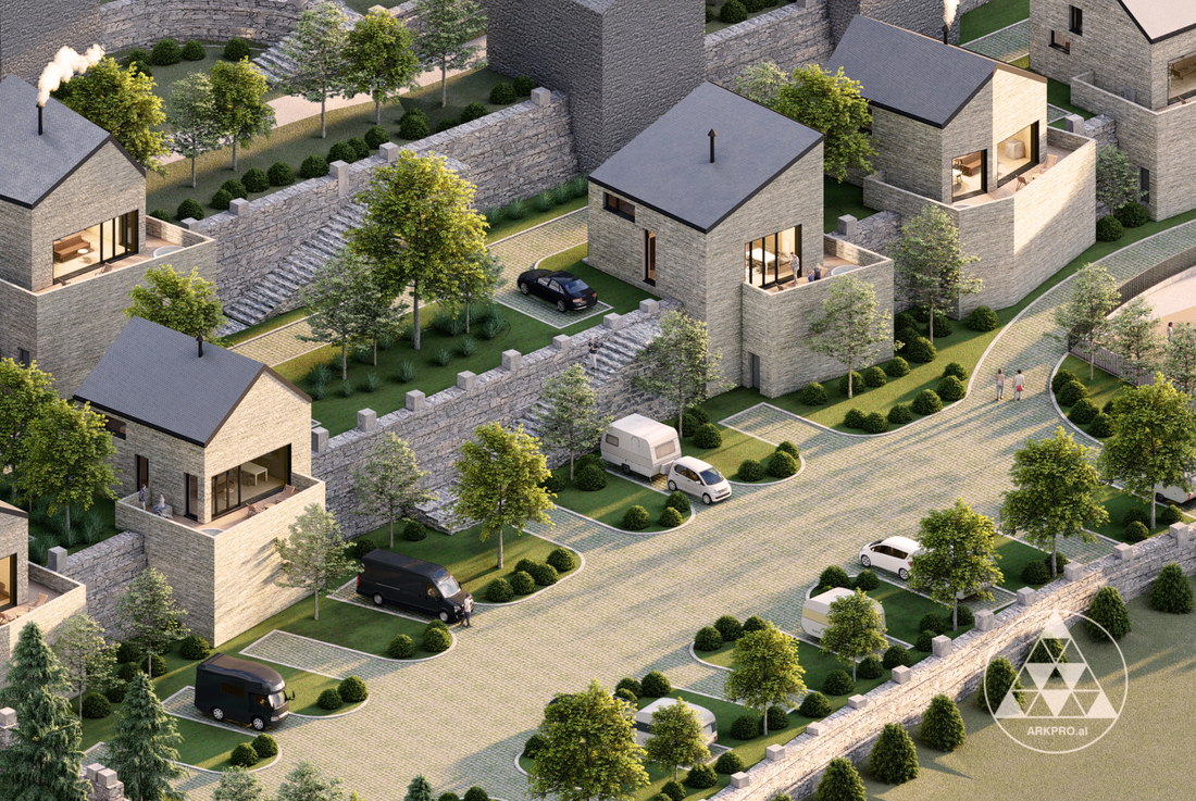The terraced layout is not only a response to the topography but also a key aspect of the social and spatial organization of the project. A network of pedestrian paths, stone stairways, and green terraces weaves the homes into a walkable, community-oriented environment, while vehicular access and parking are discretely integrated at the lower levels.
