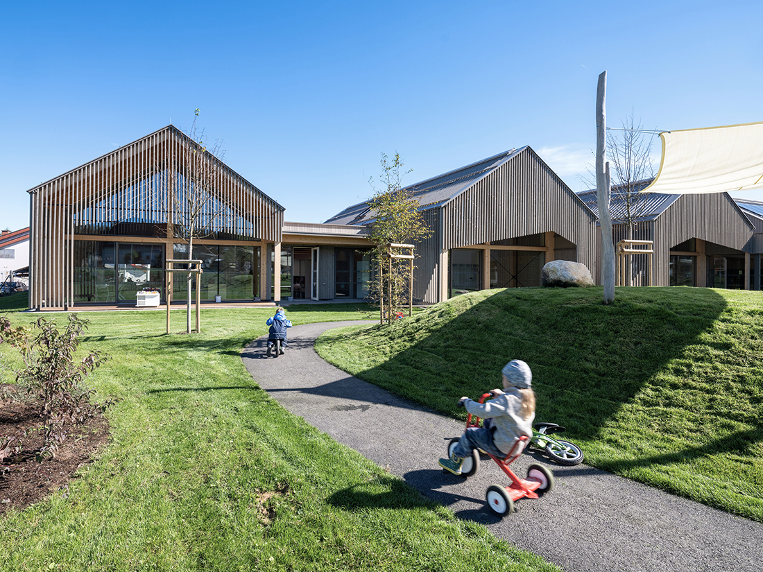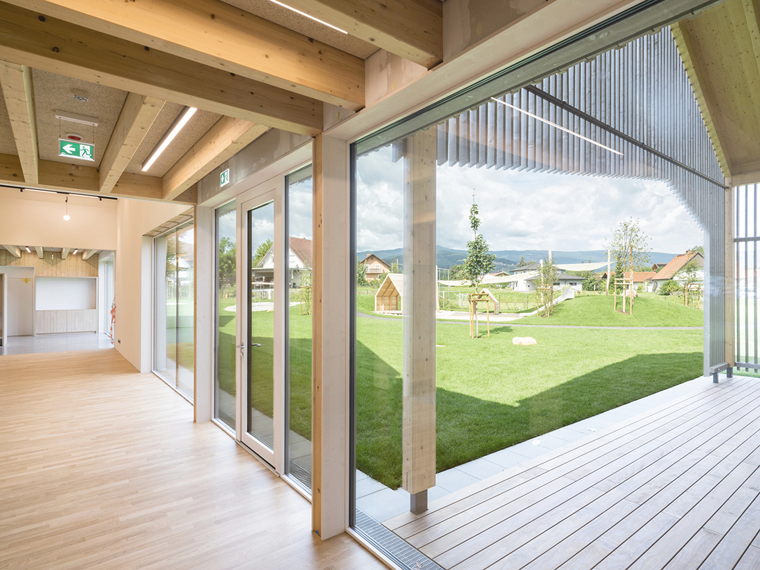 The new kindergarten and nursery for the market town of Stainz sits – beyond the multi-purpose hall and the new bus stop – pleasantly poised at the level of the newly planned car park. The entrance is sheltered at the lower end of the generous forecourt. Its design extends into parts of the car park to the north, creating a loop that allows minibuses to stop and depart safely.
