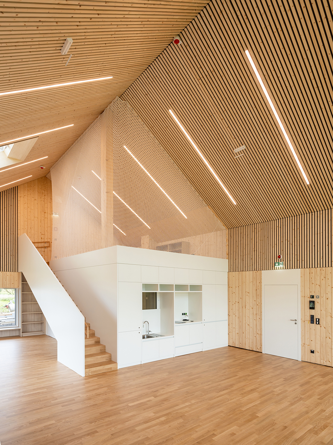 The arrangement of pitched-roof volumes gives the ensemble a village-like character that blends well with the fine-grained fabric of the surrounding settlement. Launched in early 2022 as an invited, single-stage competition, the process selected our scheme as one of eight. In total, the building provides three kindergarten groups and three nursery groups, each accommodated in separate “timber houses” linked by a low, flat connecting volume.