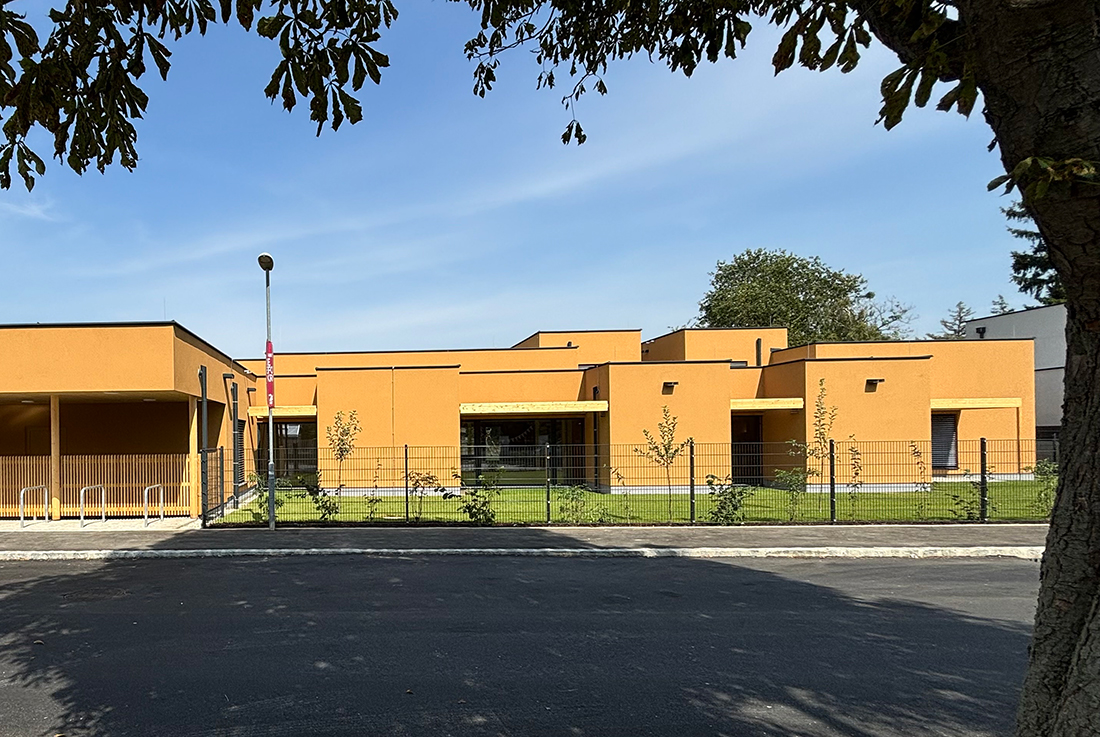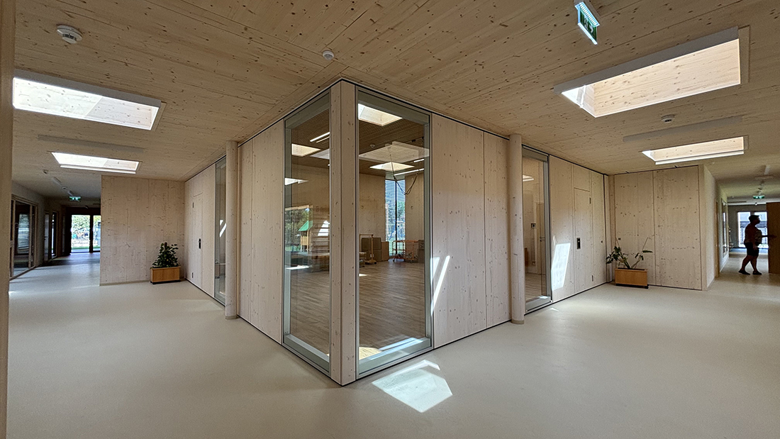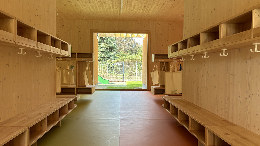 The solid wood kindergarten building consists of modular volumes and blends seamlessly into the scale of the single-family home development on a level building site. The goal is a morphologically ideal kindergarten with child-friendly scale, intuitive orientation, and optimally designed spaces – flooded with light, clearly laid out, and flexible. The cruciform building provides four equally sized, clearly arranged group rooms with natural light on both sides and a strong connection to the outdoors.