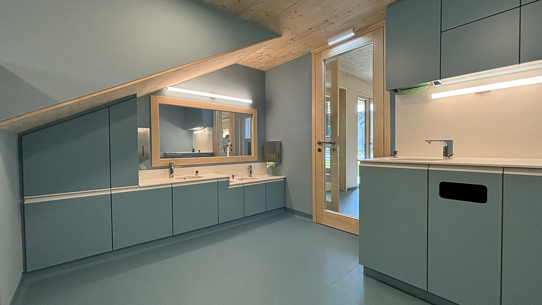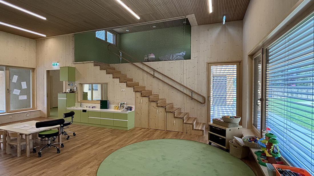 The building features varying ceiling heights depending on the function. The access area with cloakrooms and the office area has a ceiling height of 2,6 m. The group rooms, with a height of 3,6 m, allow for optimal visual connections to the adjacent retreat area, with a ceiling height of 2,3 m – which is located directly above the bathroom, also with a ceiling height of 2,3 m. Adjoining the central, 50 m² entrance hall is the activity room, which can be transformed into a 135 m² communal area by opening mobile partitions. Each group room has a direct view of the vestibule. Visual axes across the group rooms and cloakrooms, as well as diagonally through the entrance / activity room, provide clarity and orientation.