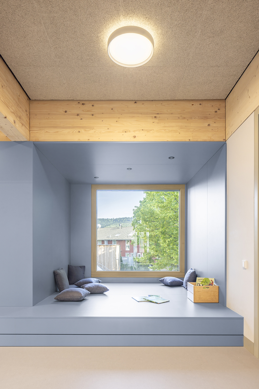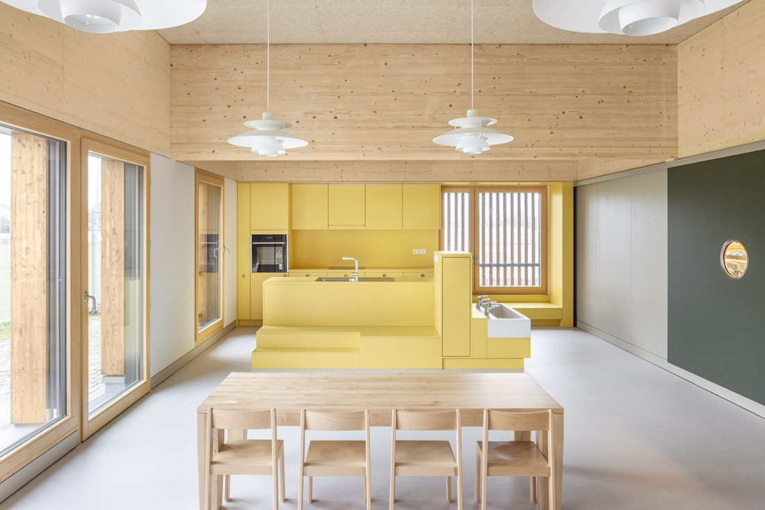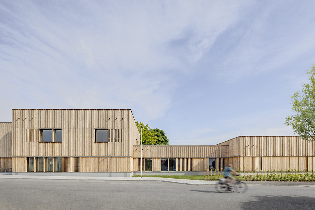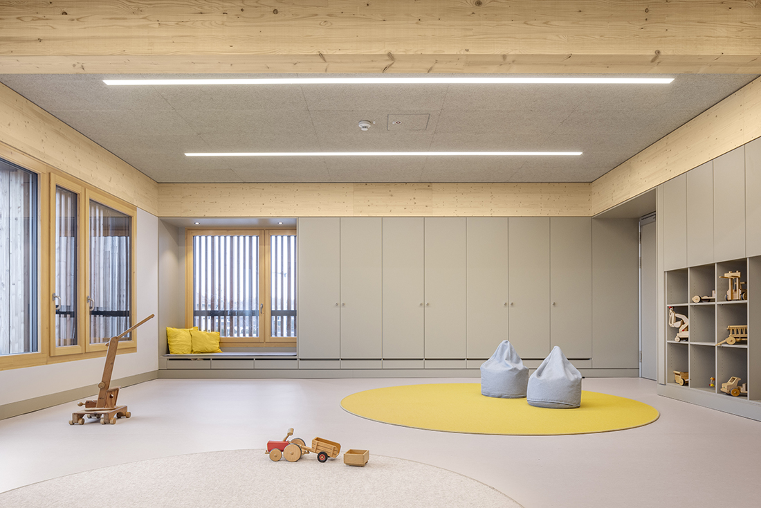 The new Hinter Höfen kindergarten is an architectural ensemble of six playfully arranged timber-frame cubes that stagger along the street edges. With their varying heights, they blend seamlessly into the grain of the surrounding residential area. Their arrangement creates an expanding neighborhood square at the intersection, serving as a public meeting point and a forecourt for the kindergarten.