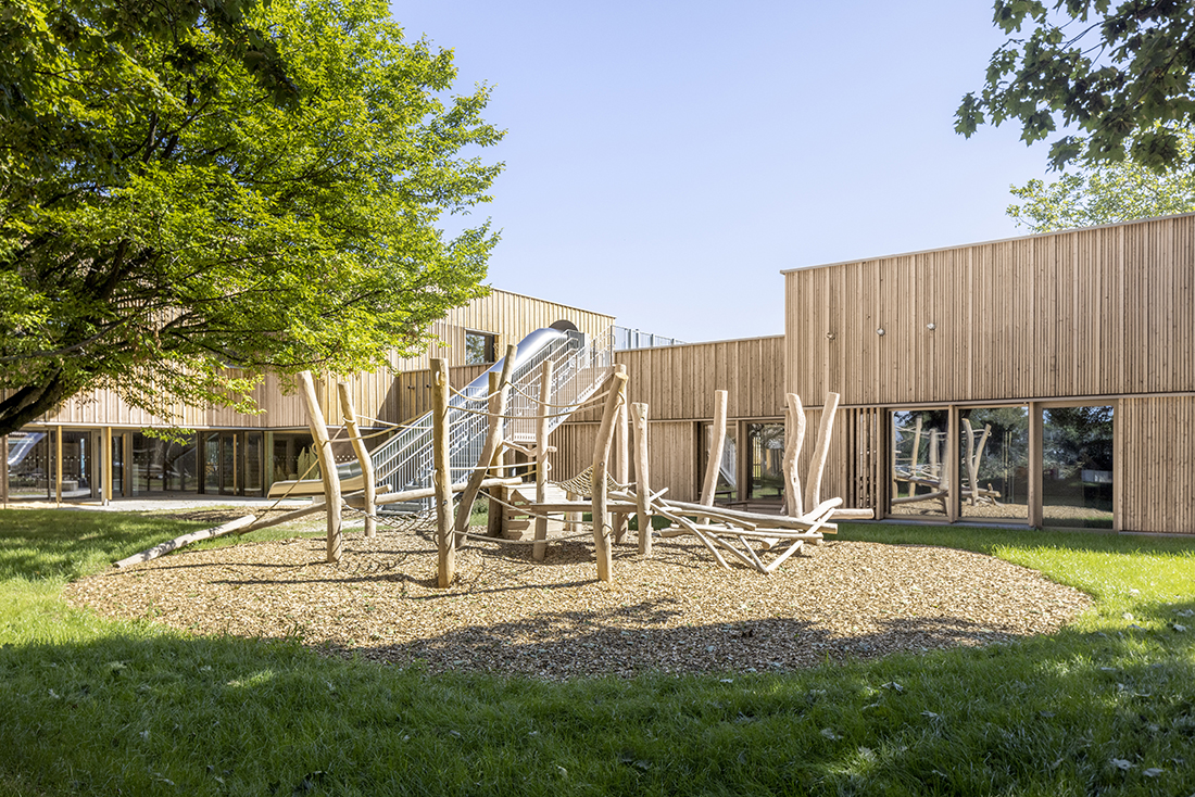 The rear garden area shields the building from the street, providing a sheltered retreat. It features play equipment for children of different ages, shade-providing trees integrated from the existing stock, and a central, particularly beautiful hornbeam. This kindergarten combines sustainable construction, innovative energy concepts, and child-friendly architecture, perfectly tailored to both the needs of the children and the requirements of the site.