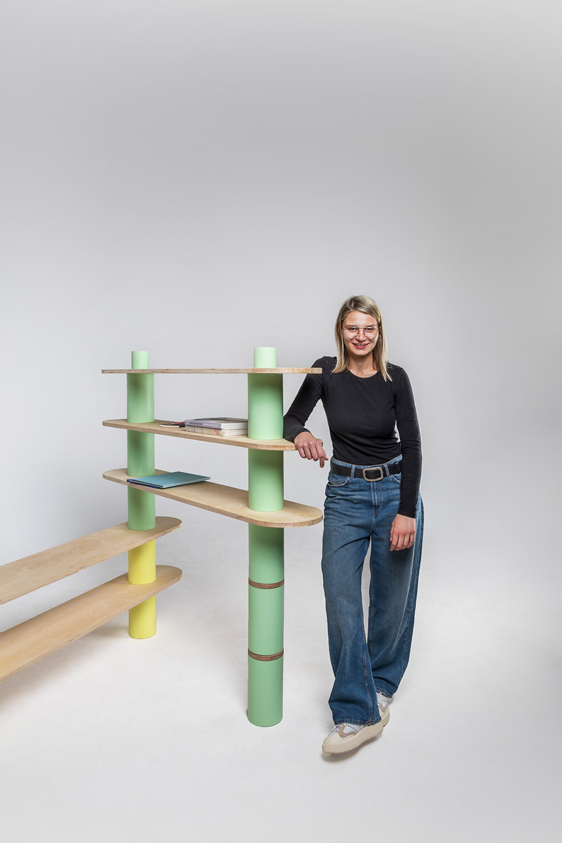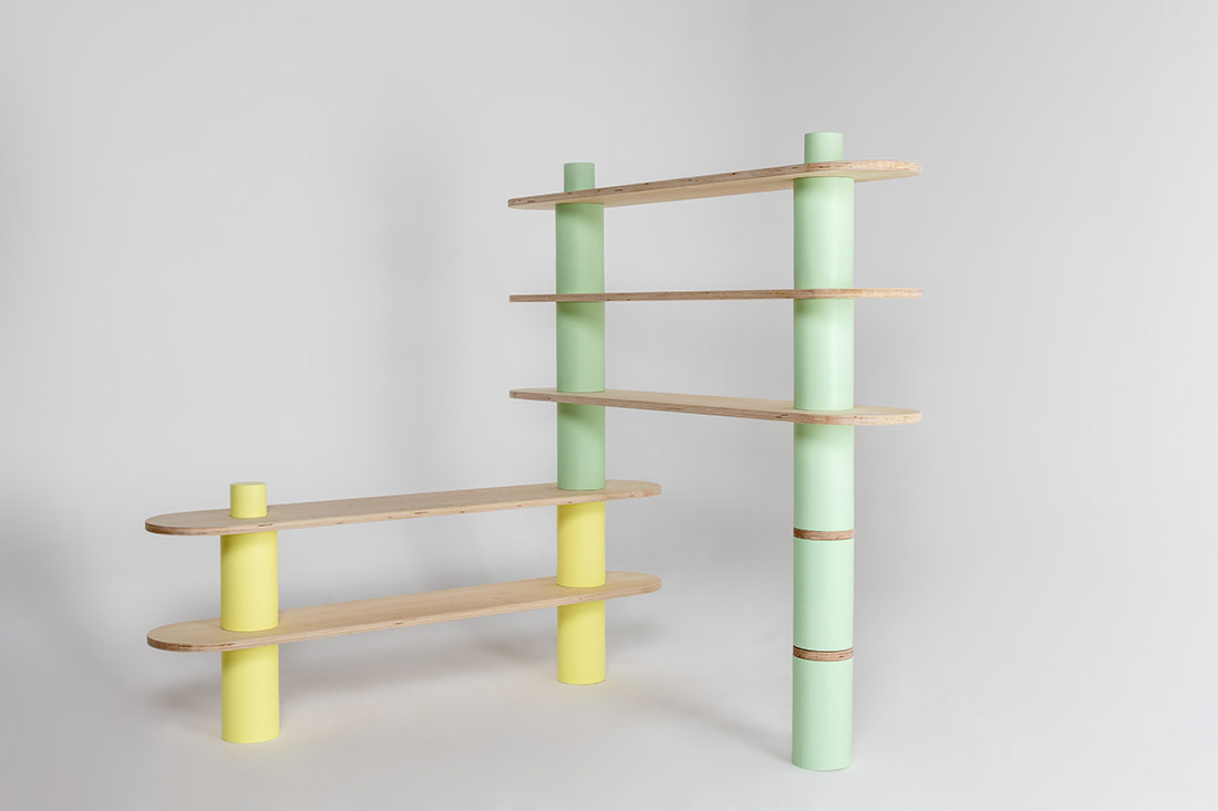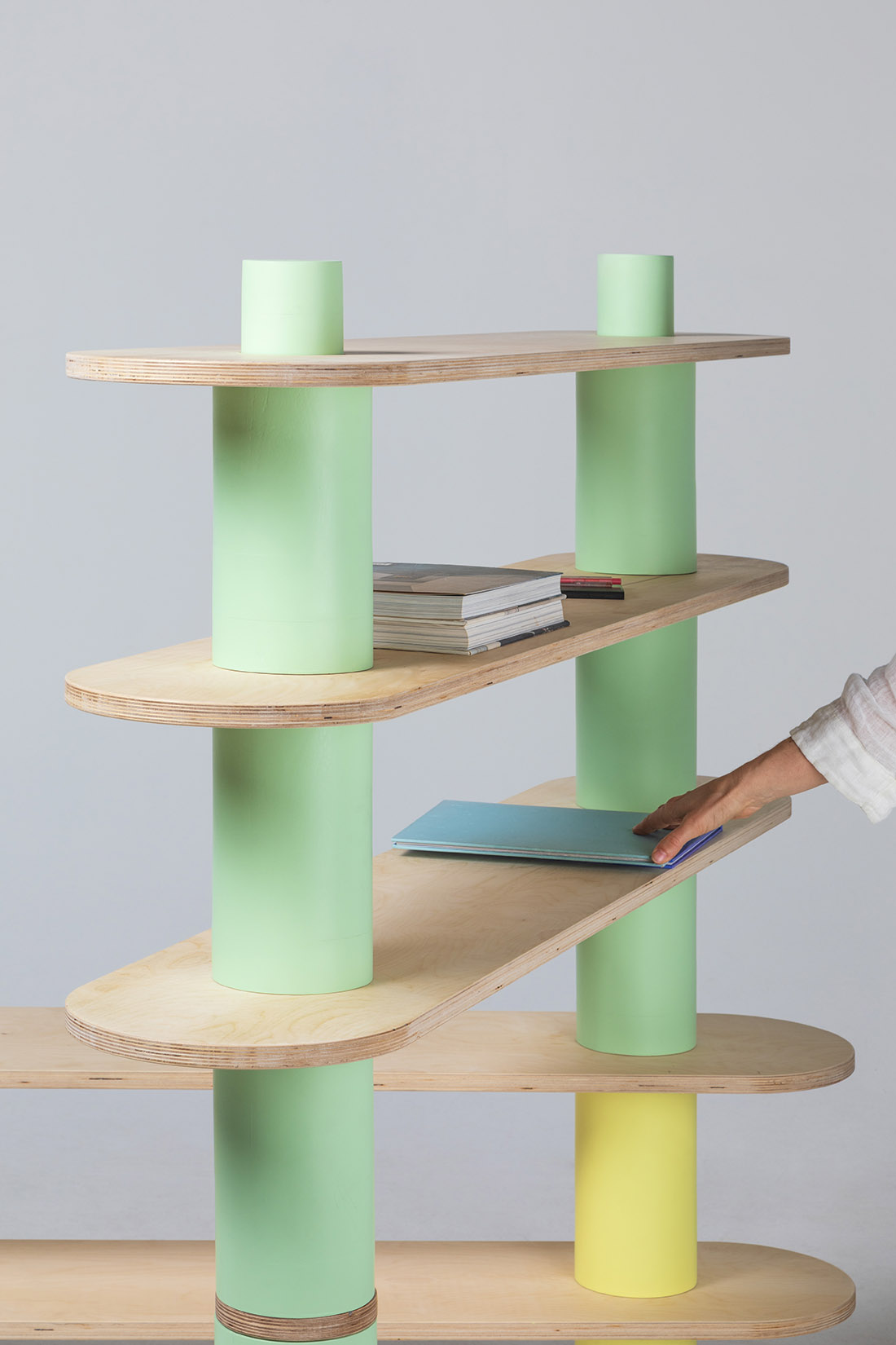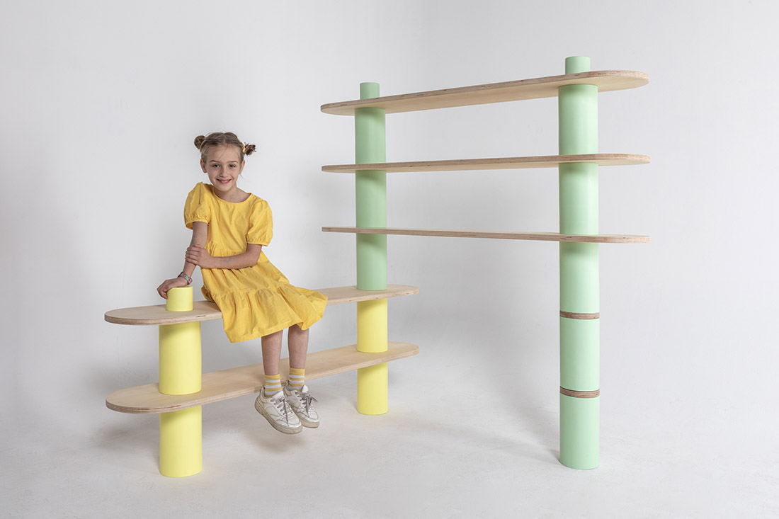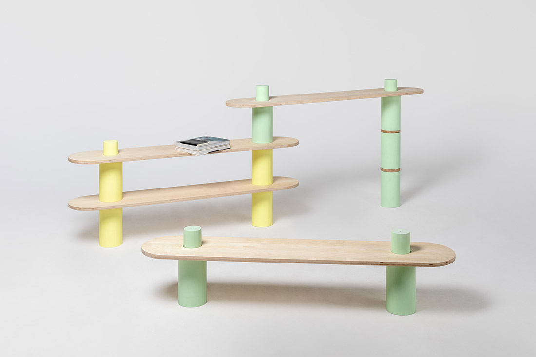 Simple in its design, KITE consists of wooden planks and cylindrical clamps, complemented by an additional wooden ring that enables height adjustment when creating furniture.