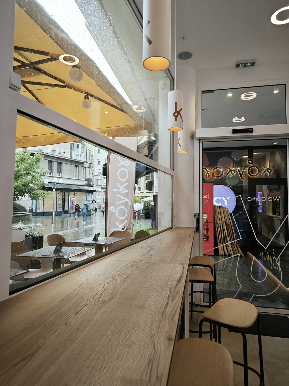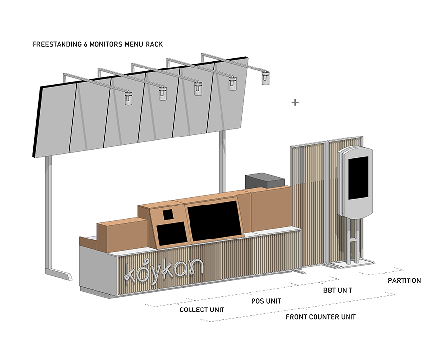 Koykan’s modular serving area is composed of freestanding elements, designed to adapt to any layout. A strong emphasis is placed on self-service ordering, with numerous monitors, touchscreens, and digital displays integrated into the front counter. The minimum front counter setup includes a collection unit, POS unit, BBT unit, partition unit, and a freestanding six-monitor menu rack.