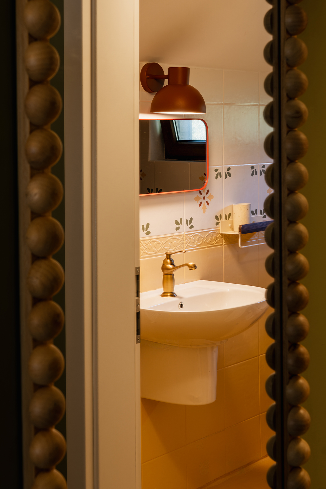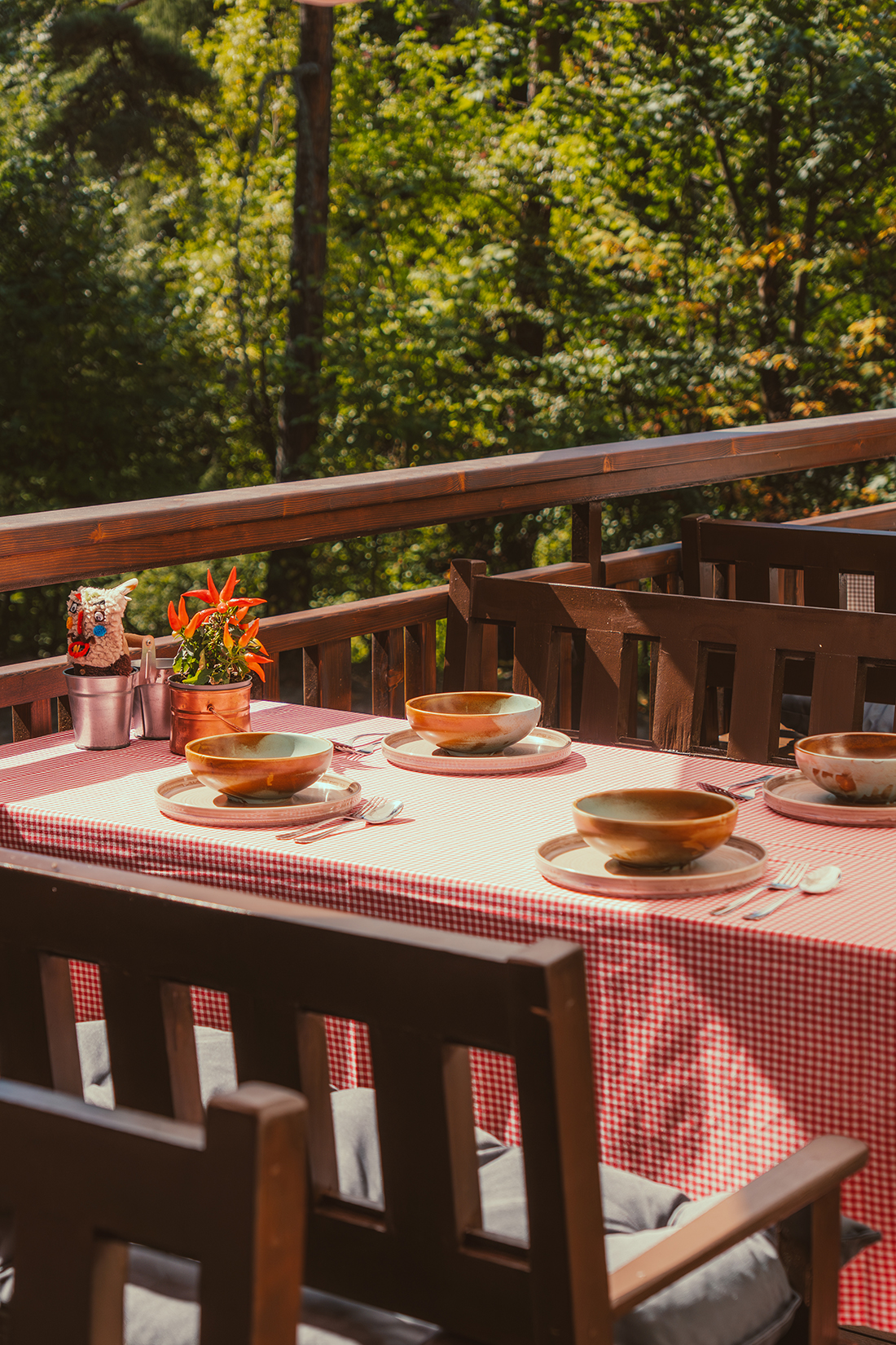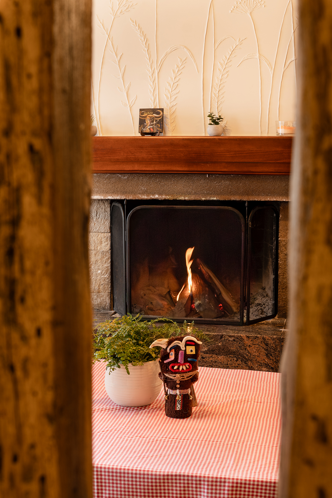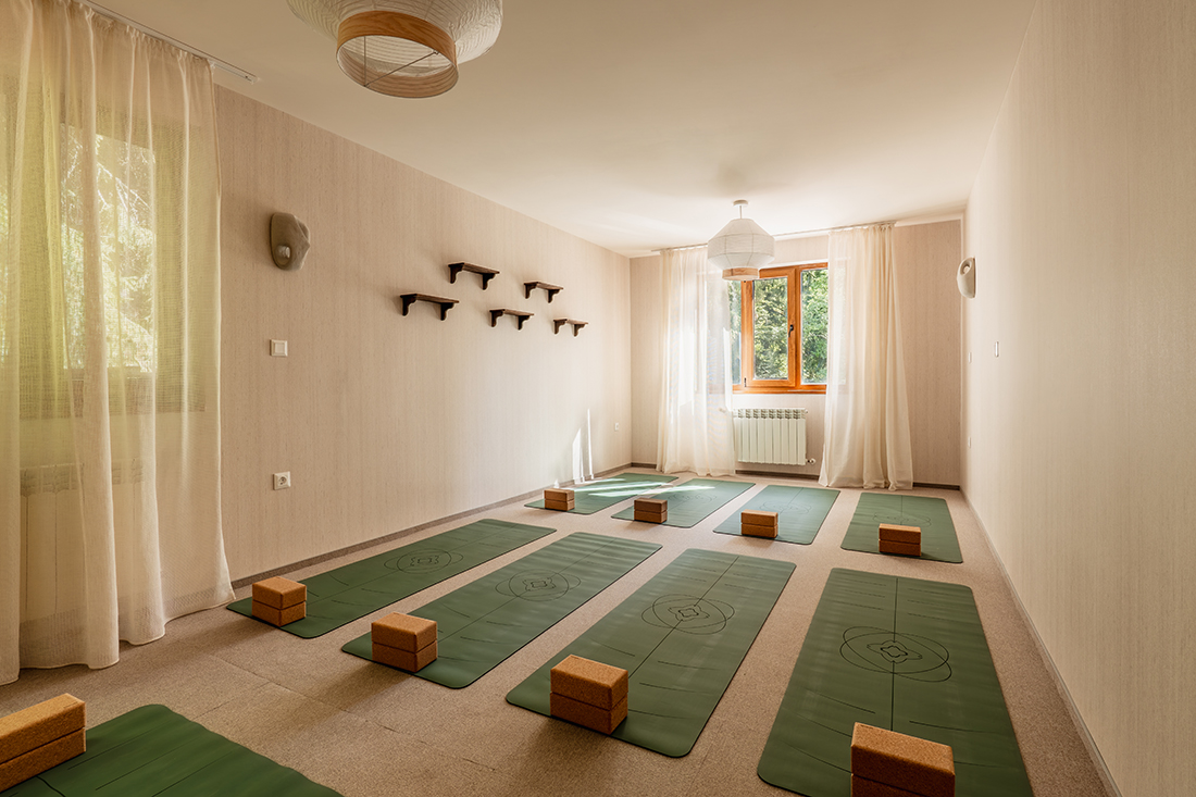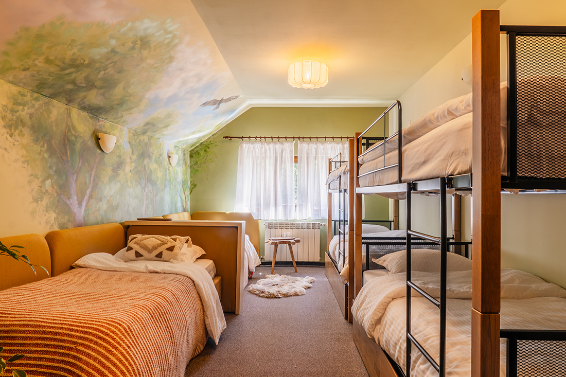 Each of the ten rooms has its own bathroom, restored vintage furniture, and hand-painted tiles with forest motifs. Authentic Kuker masks and costumes bring Bulgarian folklore into the interior, turning the space into a living museum. Murals created by students from the National Academy of Arts give every bedroom a fairytale atmosphere, while a multifunctional studio welcomes yoga, workshops, and creative gatherings. Kuker Hut offers a rare blend of comfort, artistry, and nature.
