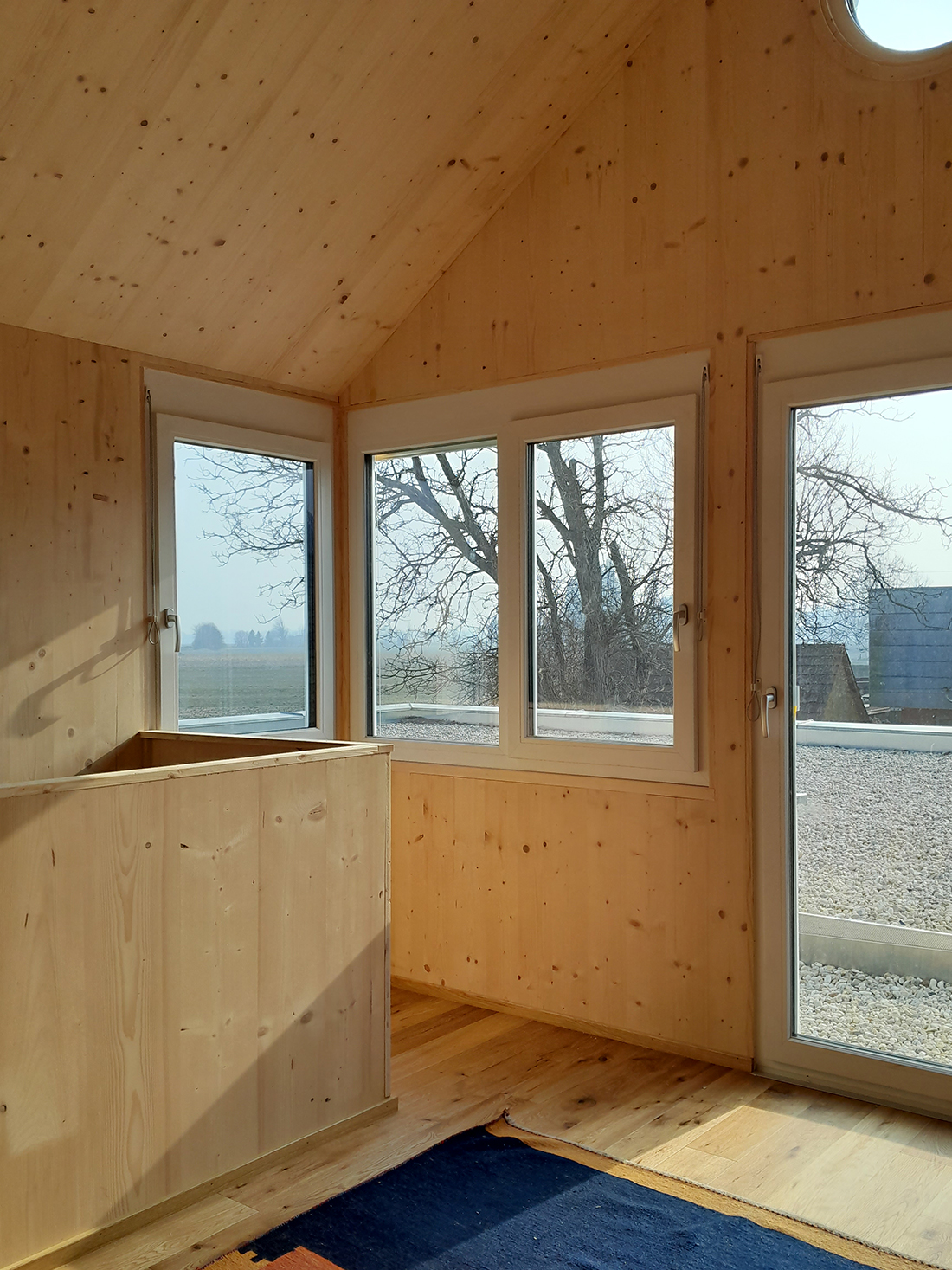 The separation of living and working spaces: Through the building’s form and surfaces. The visual and tactile textures. The spacious, open-plan kitchen/living area, with its pitched roof and dormer window. The shifting incidence of light. The democratic allocation of all bedrooms to the south, featuring larch beams. The office area, with its panoramic views and adjoining wooden terrace. The clear layout of the outdoor spaces and access routes.