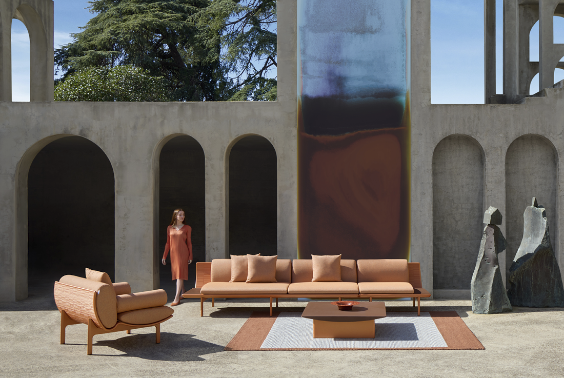The ALTEA tables complement the armchair with a sculptural and distinctive design language. Tapered legs