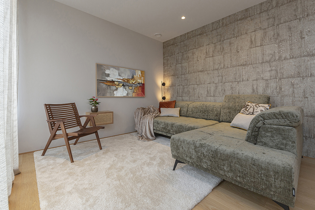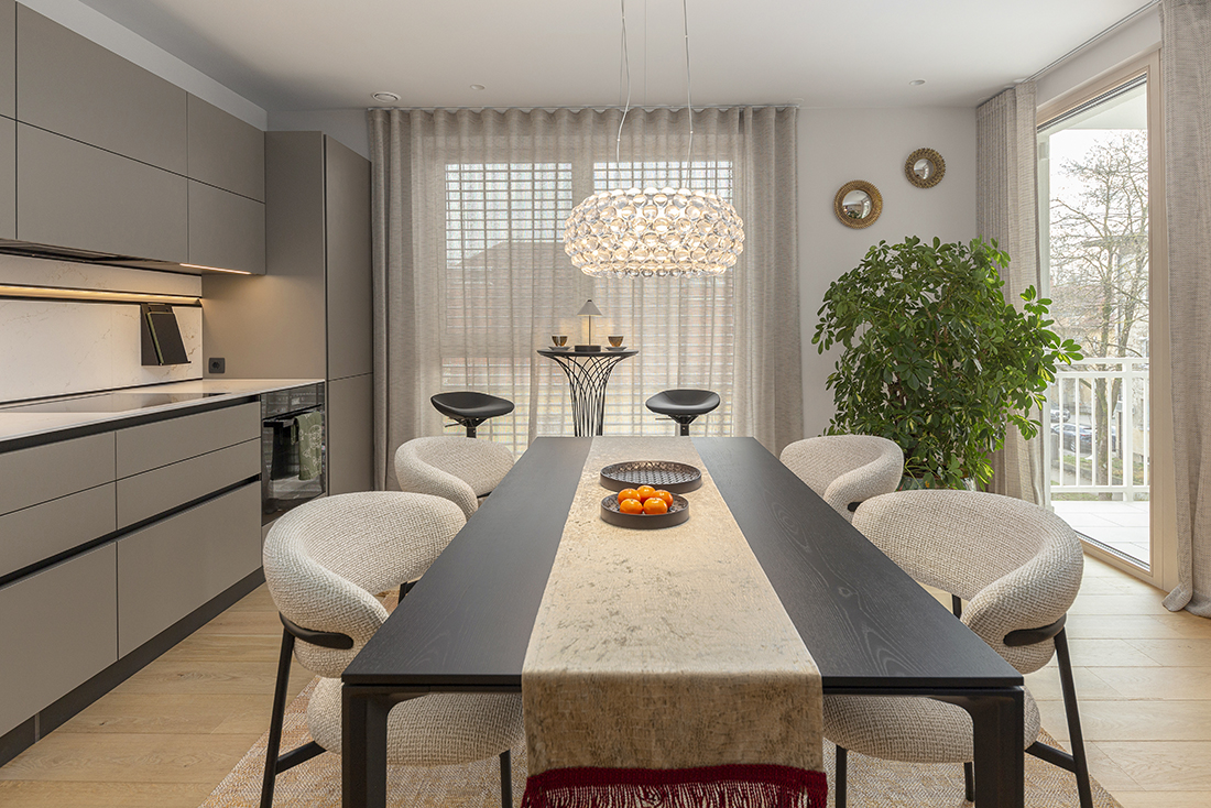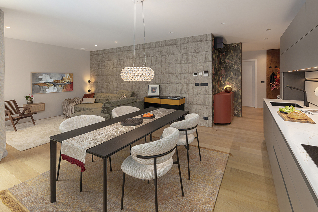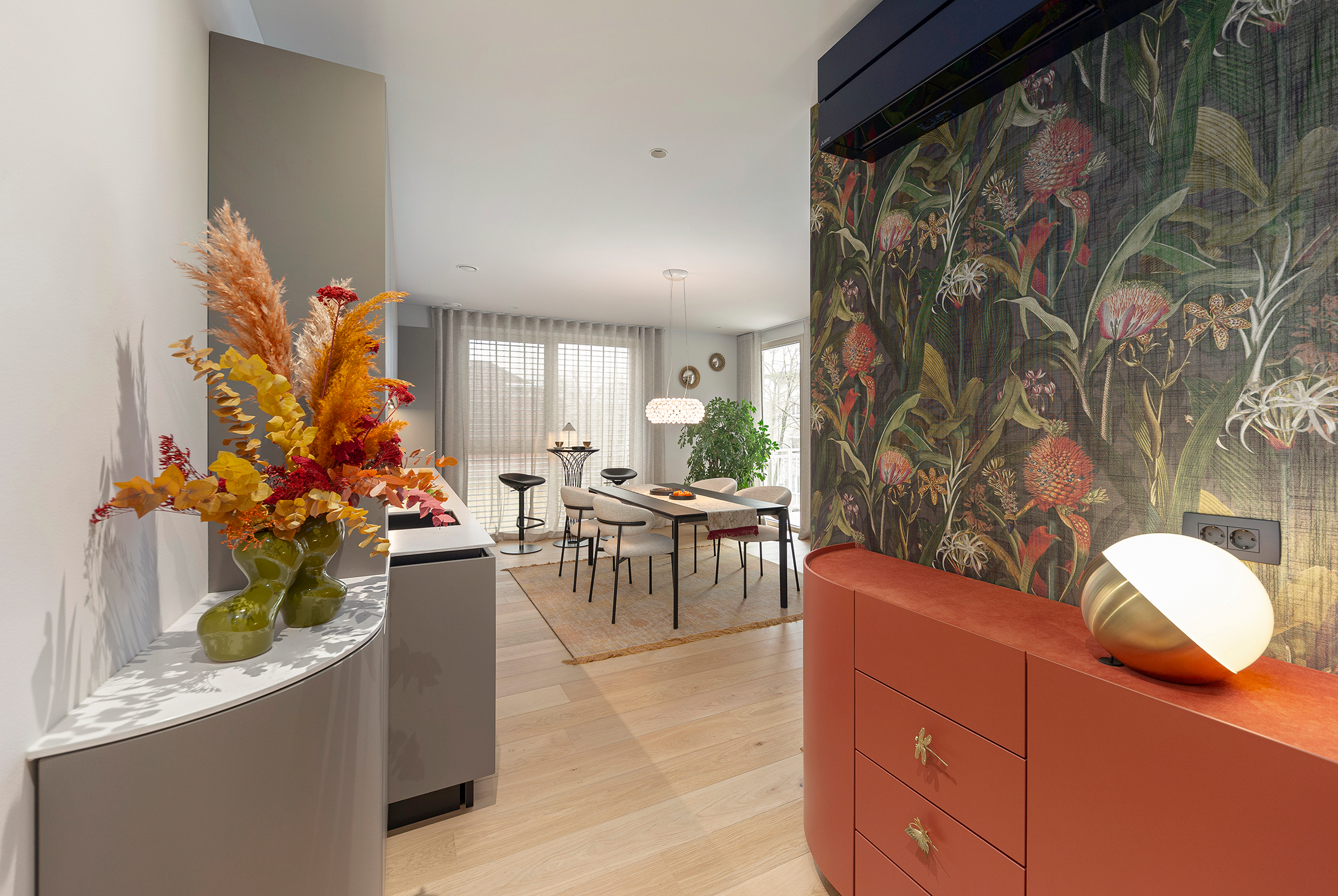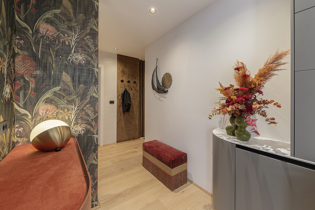 On entering, the hallway feels theaatrical: a narrow space is replaced by a velvet curtain, behind which are shoe shelves and installations. The curtain continues into an upholstered wall panel for hanging clothes; a semicircular niche and an antique mirror form the wardrobe area. We proceed past a rustic-framed mirror and a colorful wallpaper into the main living area. The kitchen is linear, with a semicircular element for soft transitions. The open living space combines several corners for different needs; the furniture is a mix of bespoke pieces and designer items. Standout elements include the comfortably oversized dining chairs, a hanging light above the table, the Rex lounge chair, and a round bar table by the window that forms a breakfast nook with a café-like feel.