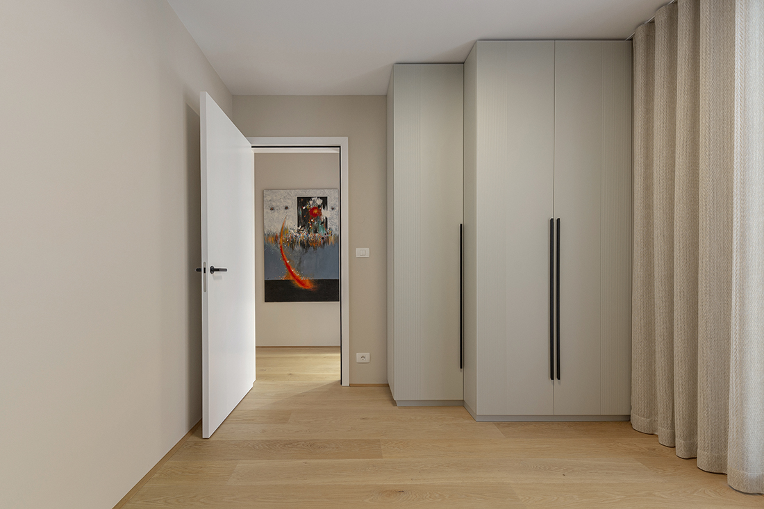 Thoughtful lighting creates an intimate evening atmosphere. Details, such as a large potted plant by the balcony and fringes on table linens, cabinets, rugs, and stools, add dynamism to the space. The bedroom and sanitary areas follow the thematic color scheme; despite the small footprint, there is ample storage. In the bedroom, a calming earth-toned wallpaper sits behind the bed, while the ceiling and the wall surrounding the wallpaper are painted a deeper brown-gray, creating a cocoon-like feeling. The apartment demonstrates that a rich, curated interior can offer more warmth and homeliness than strict minimalism.