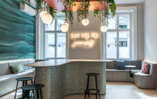 Le Burger is part of a restaurant chain whose design is primarily based on the industrial look in the use of raw materials like steel, bricks, wood, concrete and especially on using real plants, green walls etc. for creating green areas. Probably the biggest challenge of the brand “Le Burger” is that apart of its CI, each location gets its own, individual design and never looks exactly the same. Here in the Auhof Center Vienna, the winter garden is designed as an artificial jungle and forms the heart of the restaurant. The interior impresses with many different used-look and velvet fabrics as well as color accents in fuchsia and azure. It is offering their guests the opportunity, to escape the hustle of consumerism, even just for a while. The paradisiacal winter garden is giving them a cozy holiday feeling while eating delicious food. Offering various seating groups all over the restaurant, especially the swinging benches at the restaurant portal and a swing ring in the winter garden, invite everyone to relax and let their souls dangle…