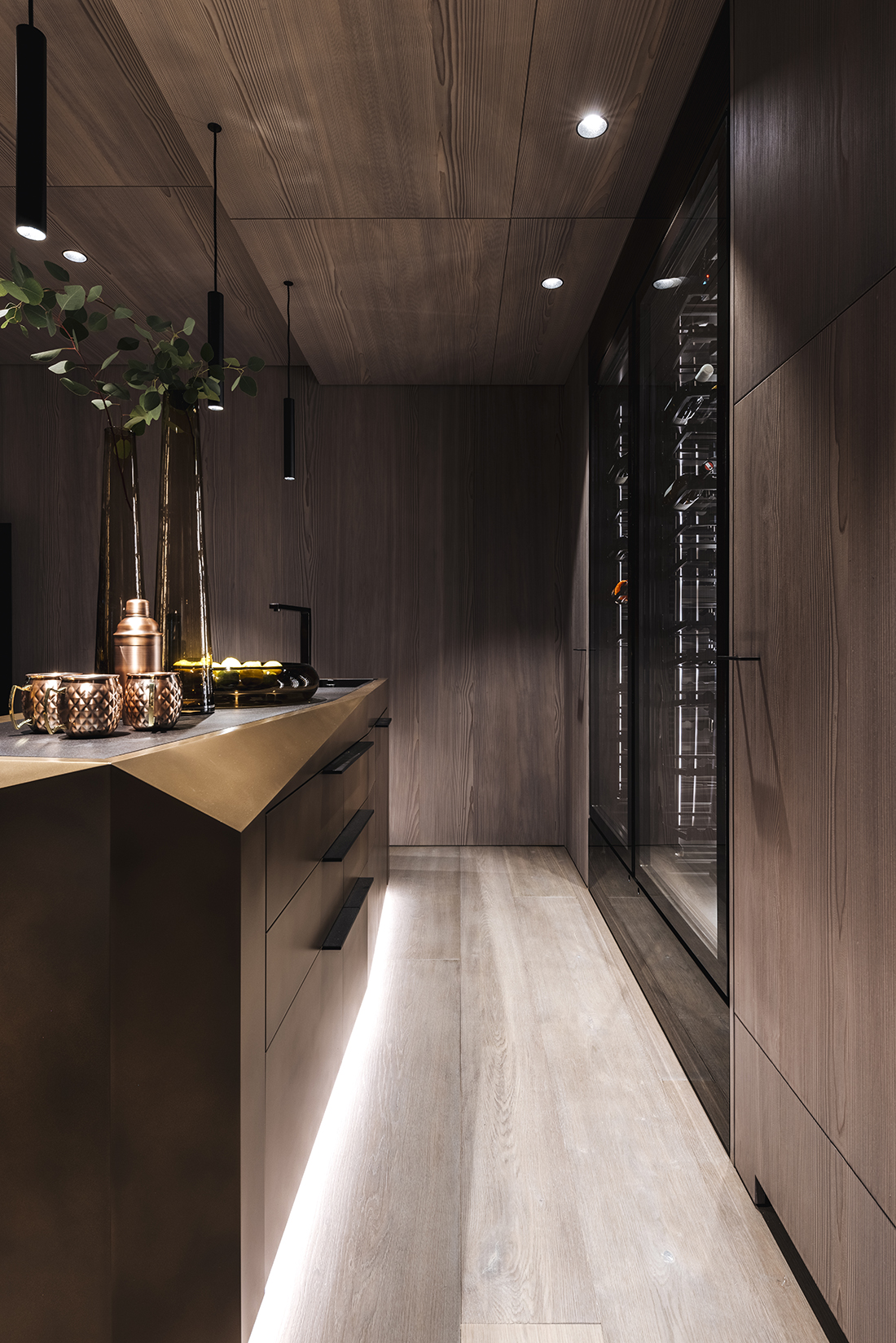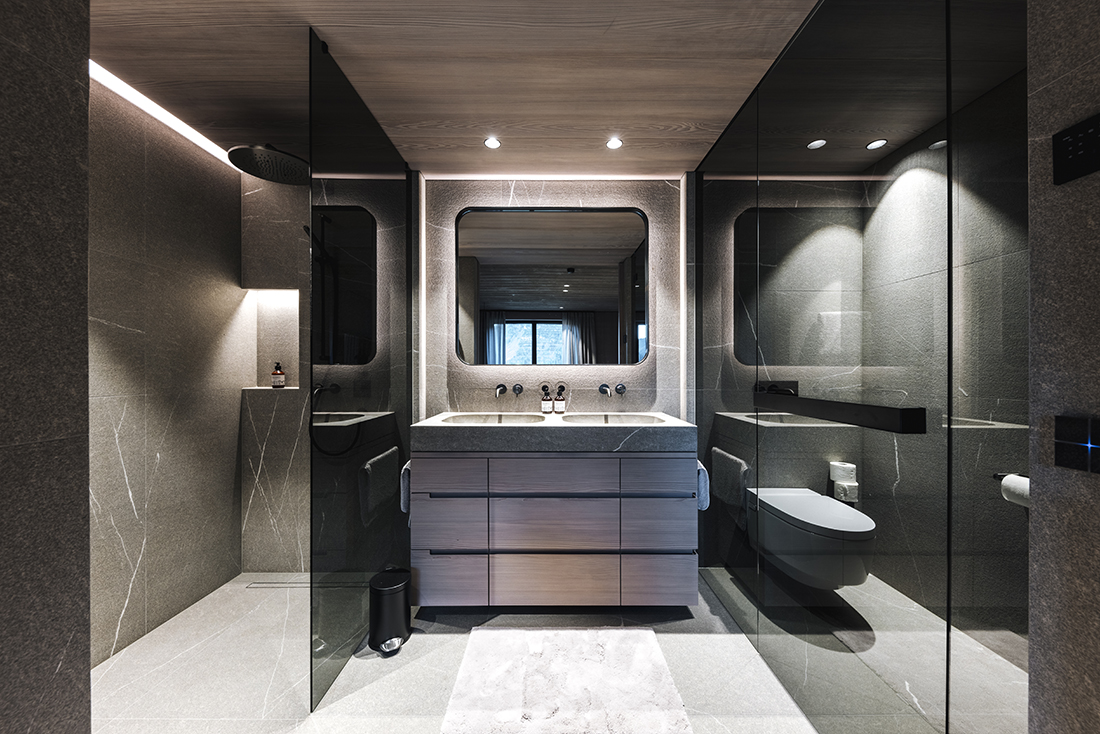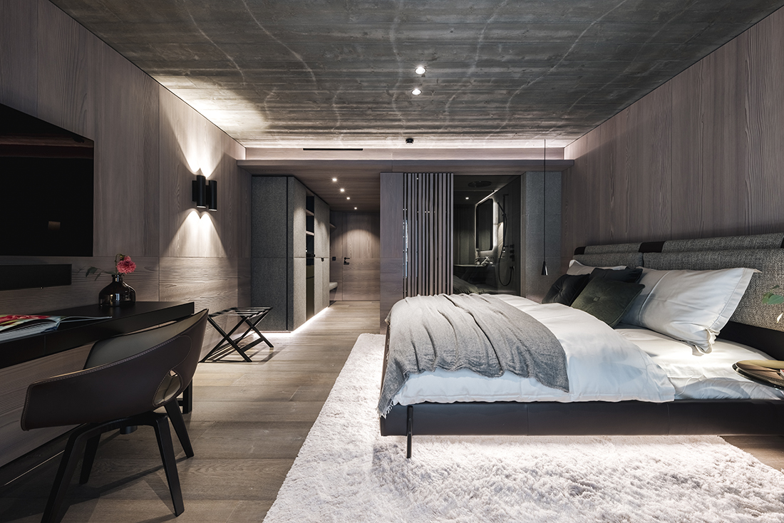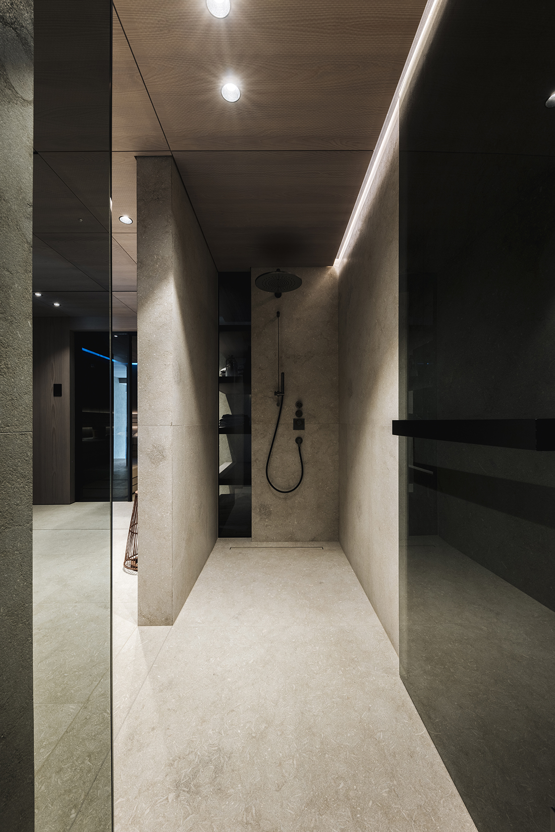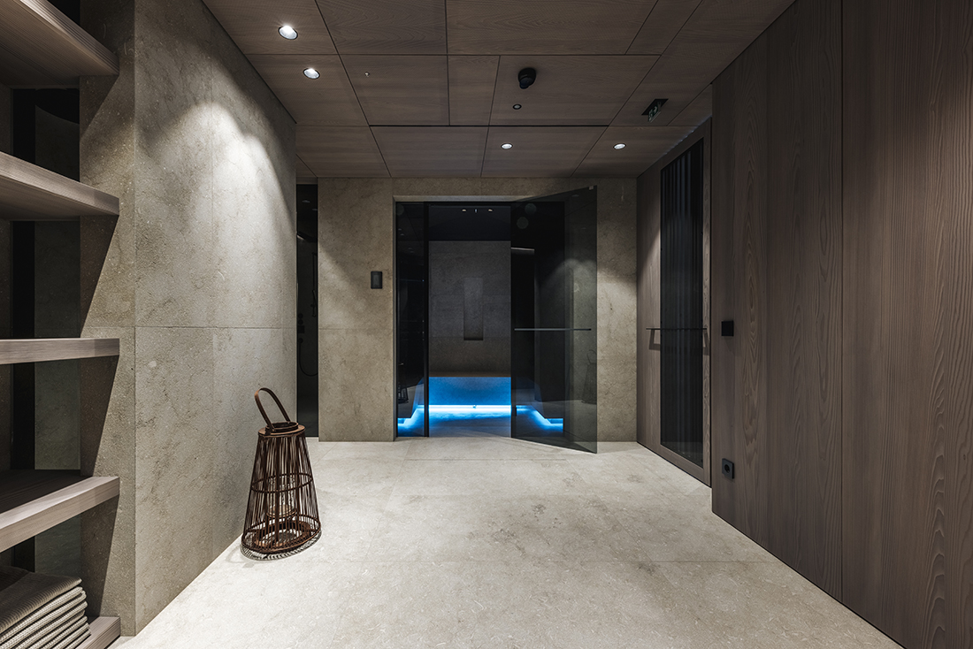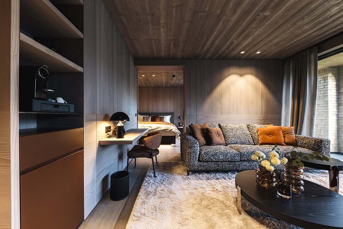 By combining highly textured elements such as brushed fir wood, natural stone, and premium textiles with contemporary architecture, a captivating balance was achieved. This thoughtful approach gives the spaces a clear structure while inviting guests to linger.