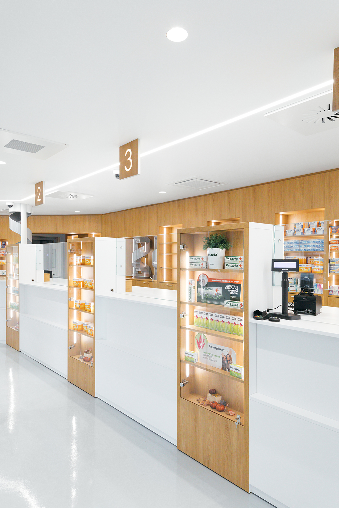 This modern pharmacy serves as a remarkable milestone for our architectural firm. The comprehensive renovation and first-floor expansion have resulted in contemporary spaces that exceed traditional pharmaceutical standards. The integration of a state-of-the-art Rowa automated system for medication storage and dispensing on the first floor ensures seamless pharmacy operations, supported by an efficient queuing system.