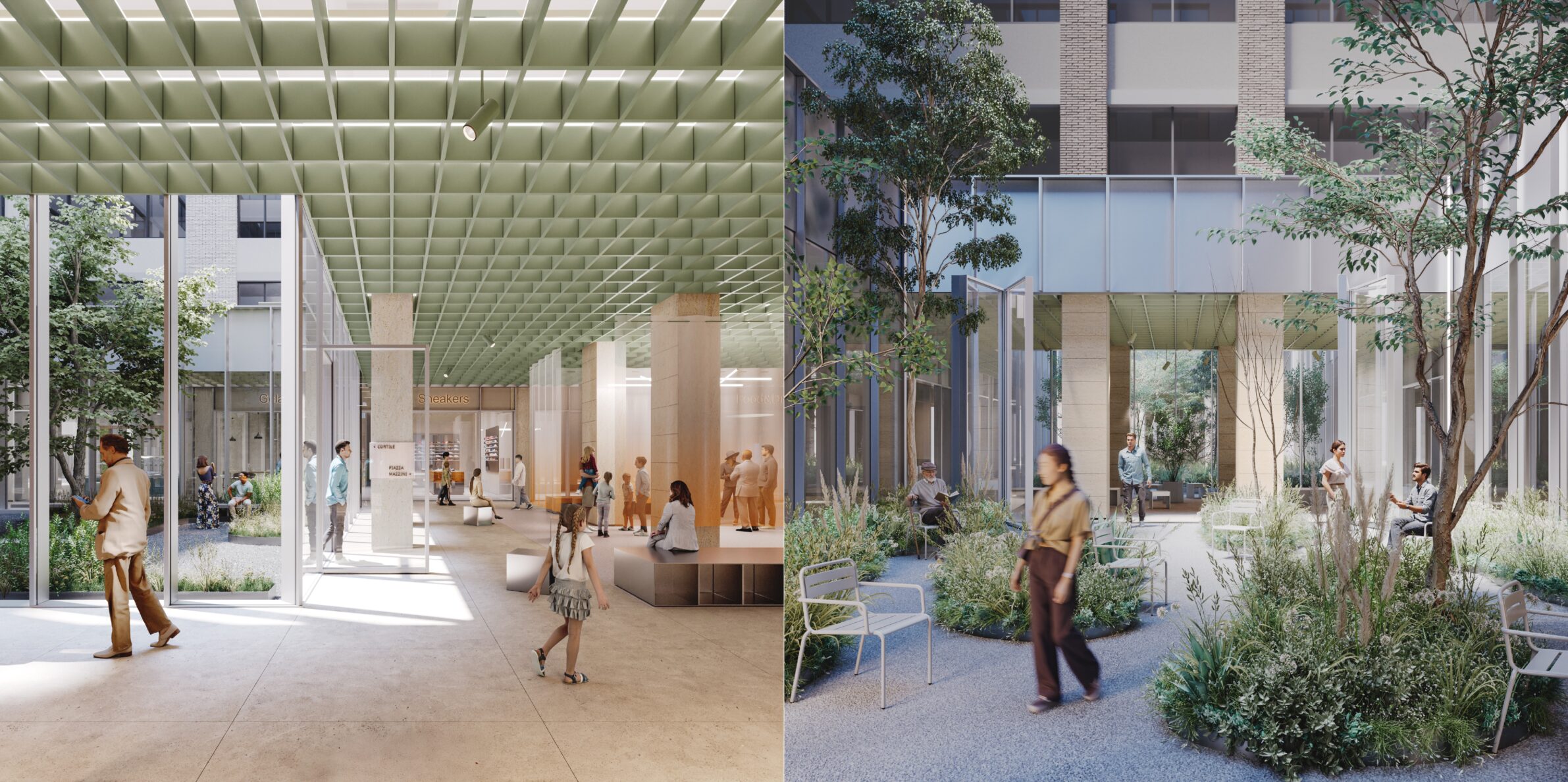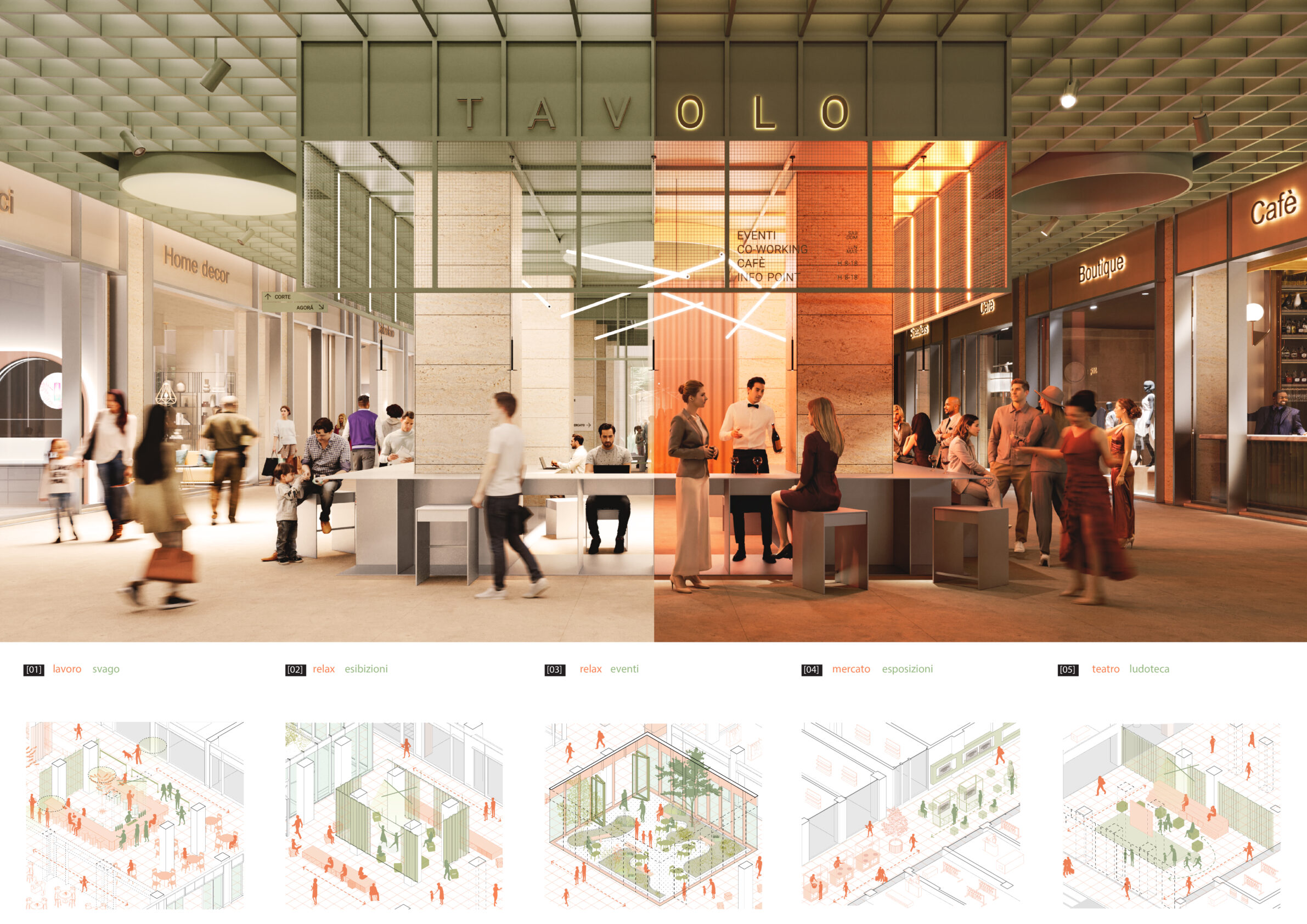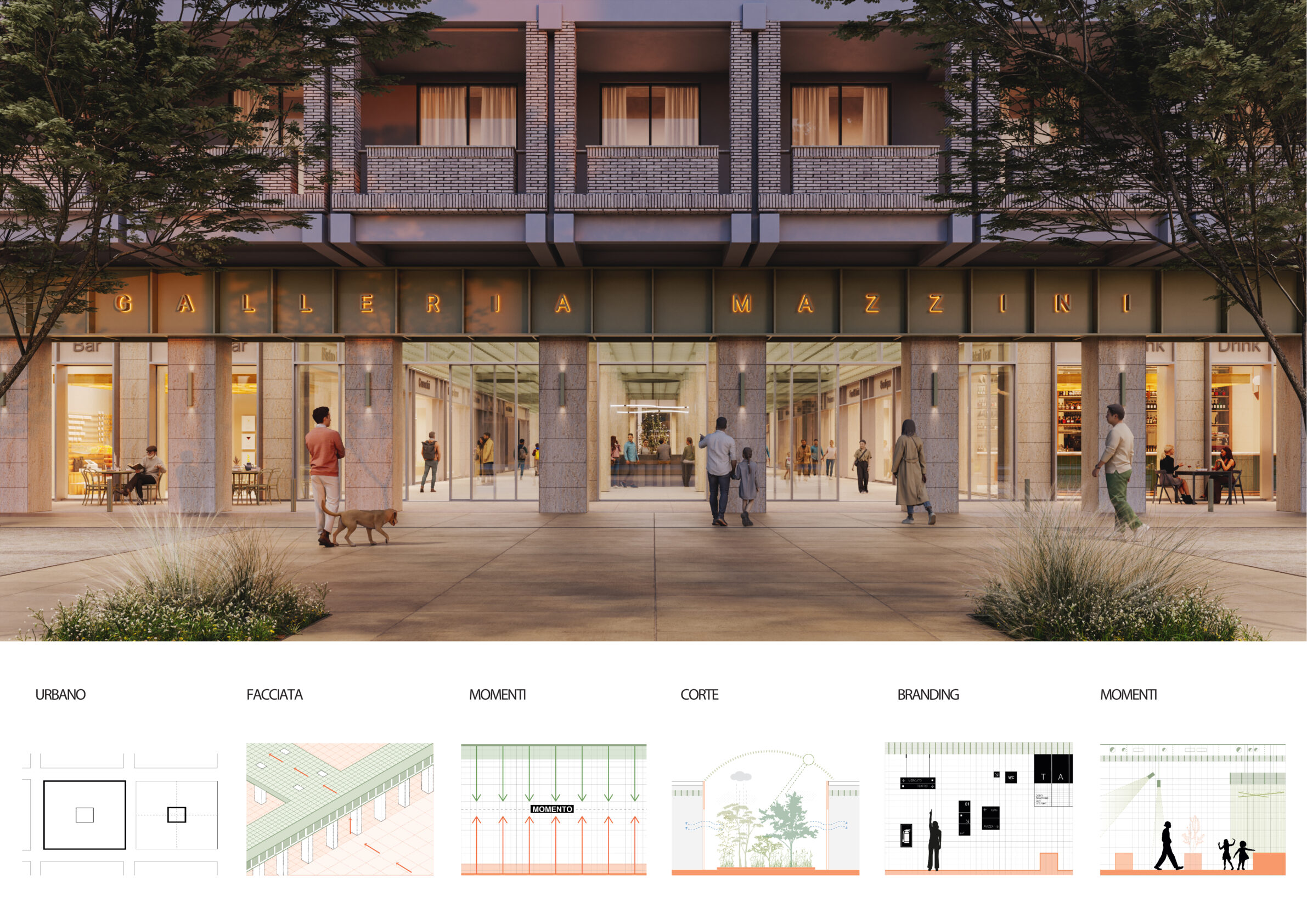 The project reinterprets Galleria Mazzini as an urban passage and civic interior, transforming an underused commercial structure into a flexible public space. By reopening the gallery to light, air, and vegetation, the proposal restores continuity between the surrounding streets and introduces new courtyards as urban rooms. A renewed spatial grid and layered ceiling system reorganize circulation and use, allowing the gallery to host markets, events, exhibitions, and everyday social life—shifting its identity from a transitory space to an active urban place.