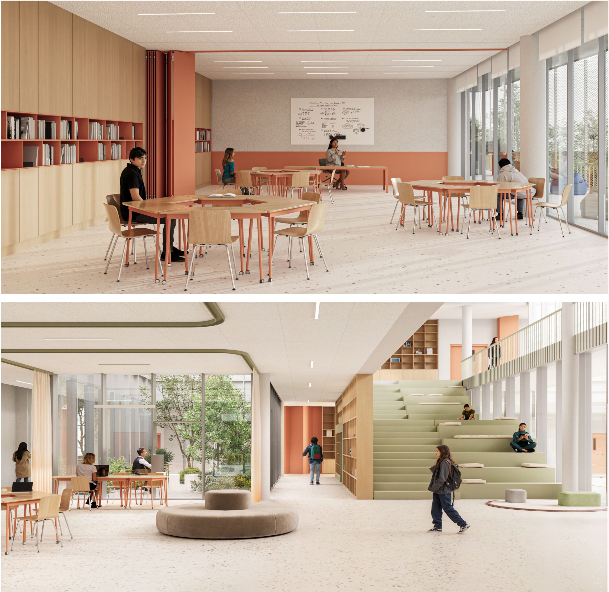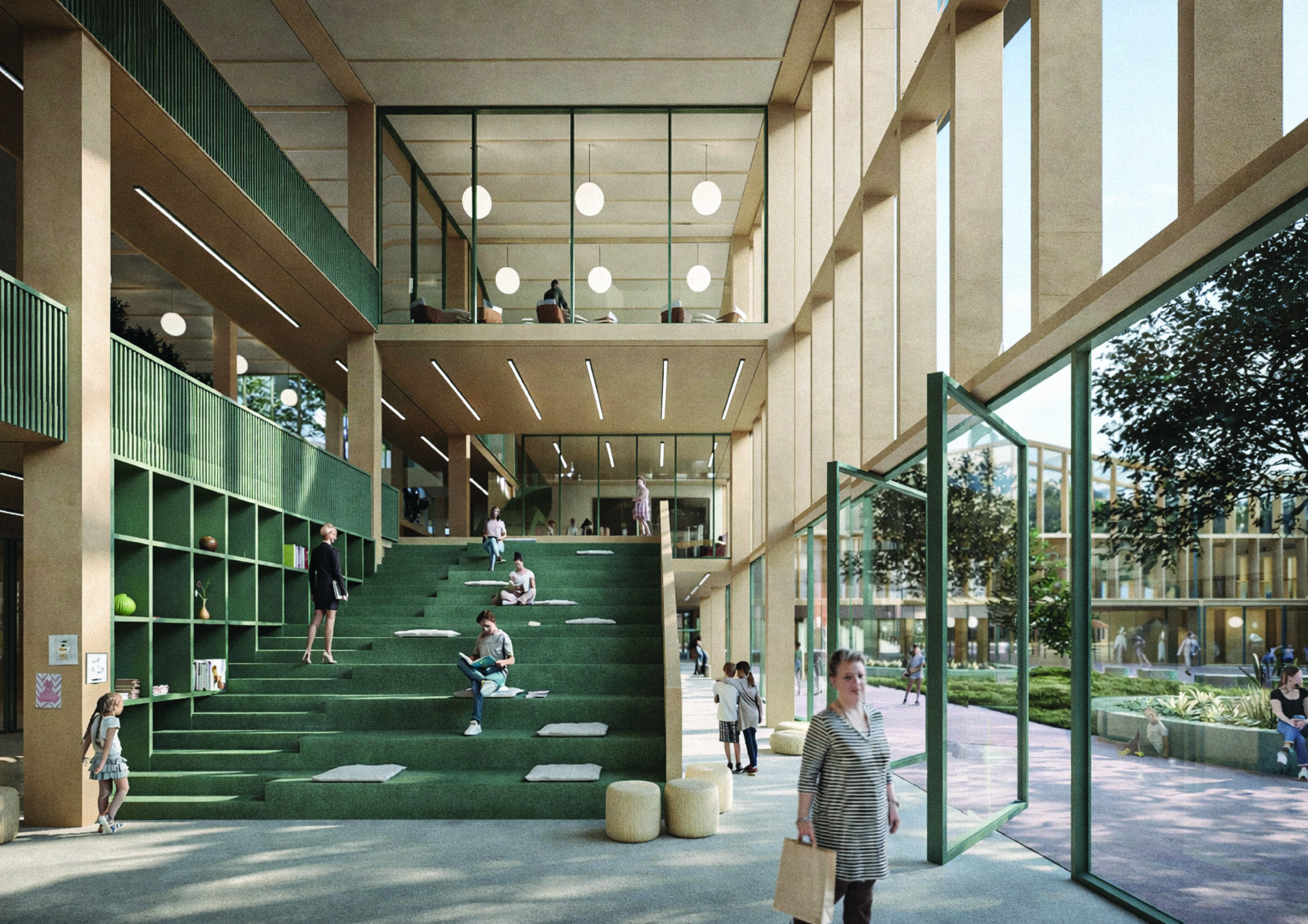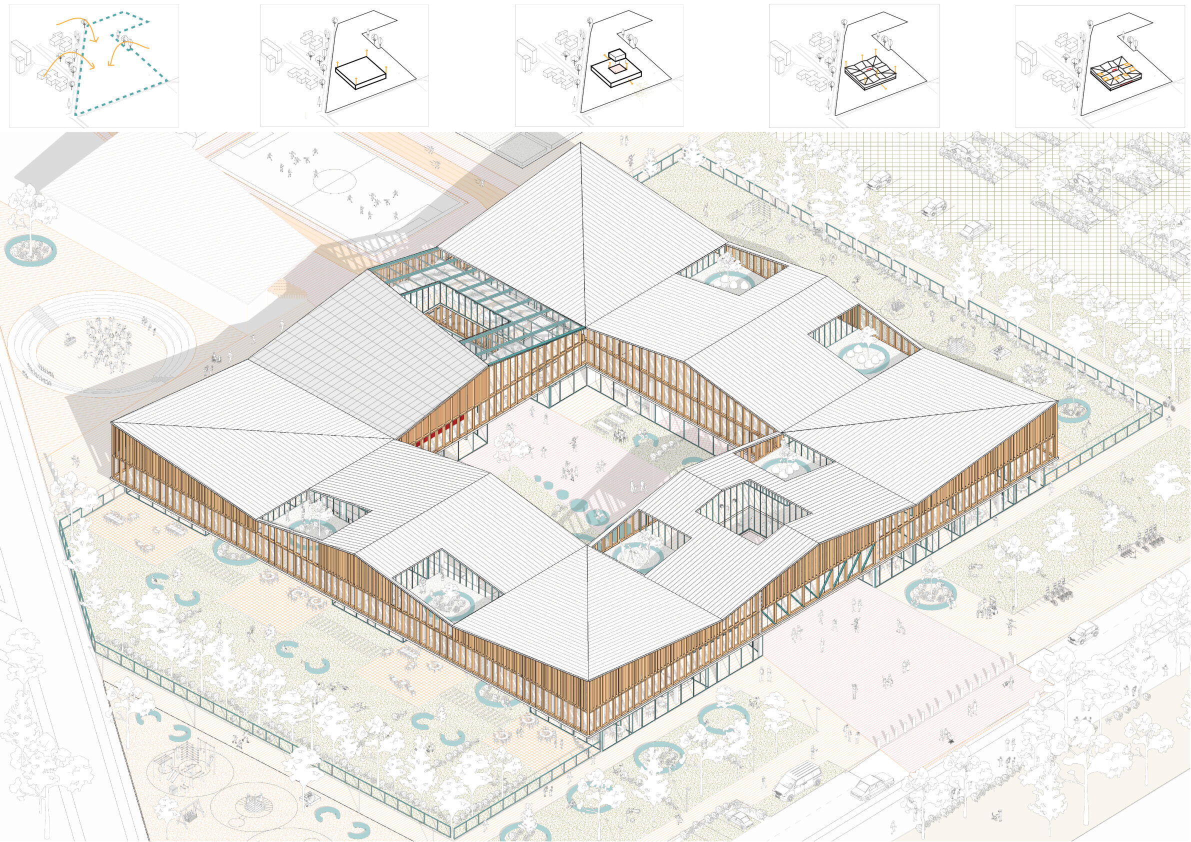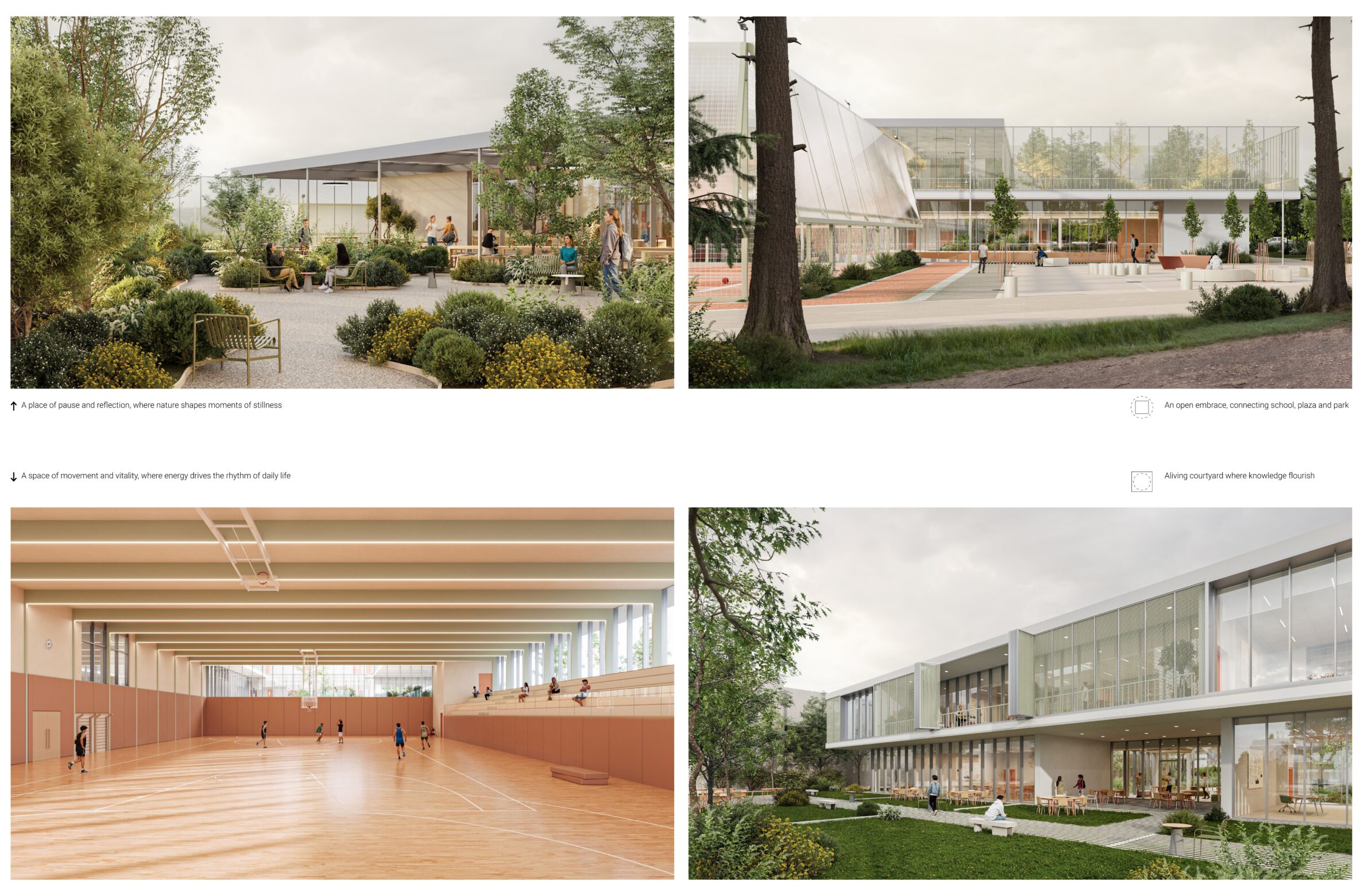 The project proposes a contemporary secondary school organized as a compact architectural volume structured around a series of internal courtyards. The spatial layout prioritizes daylight, orientation, and clear relationships between teaching spaces, collective areas, and outdoor environments. By integrating landscape, sports facilities, and shared social spaces within a coherent plan, the school supports informal learning and everyday interaction, while establishing a clear civic presence that balances educational function with openness toward its urban context.
