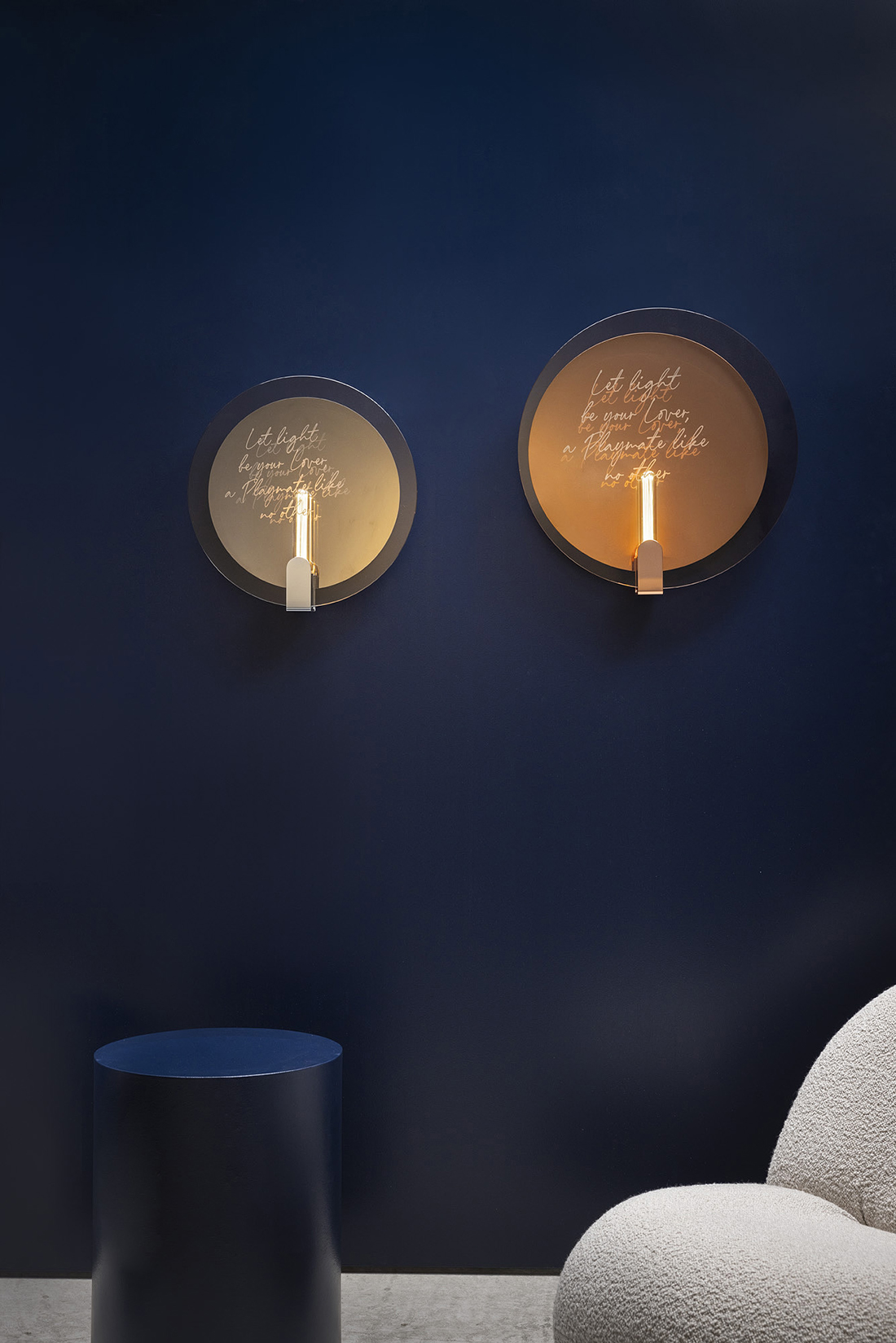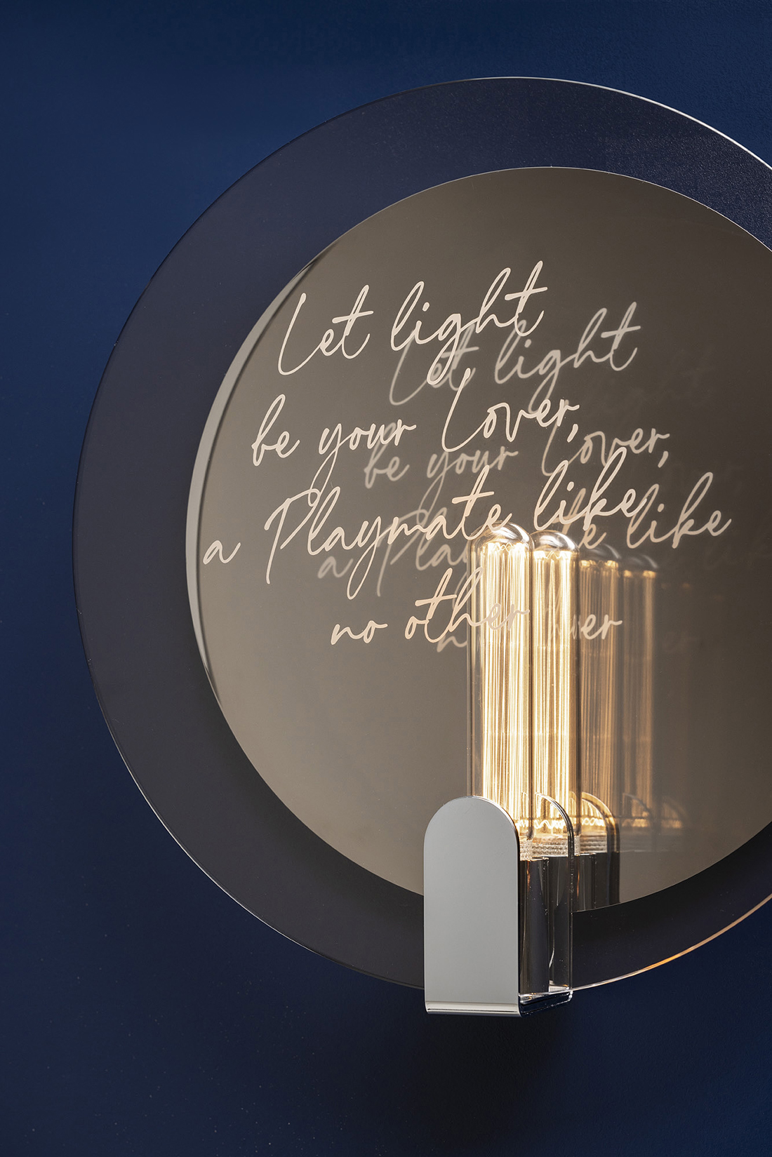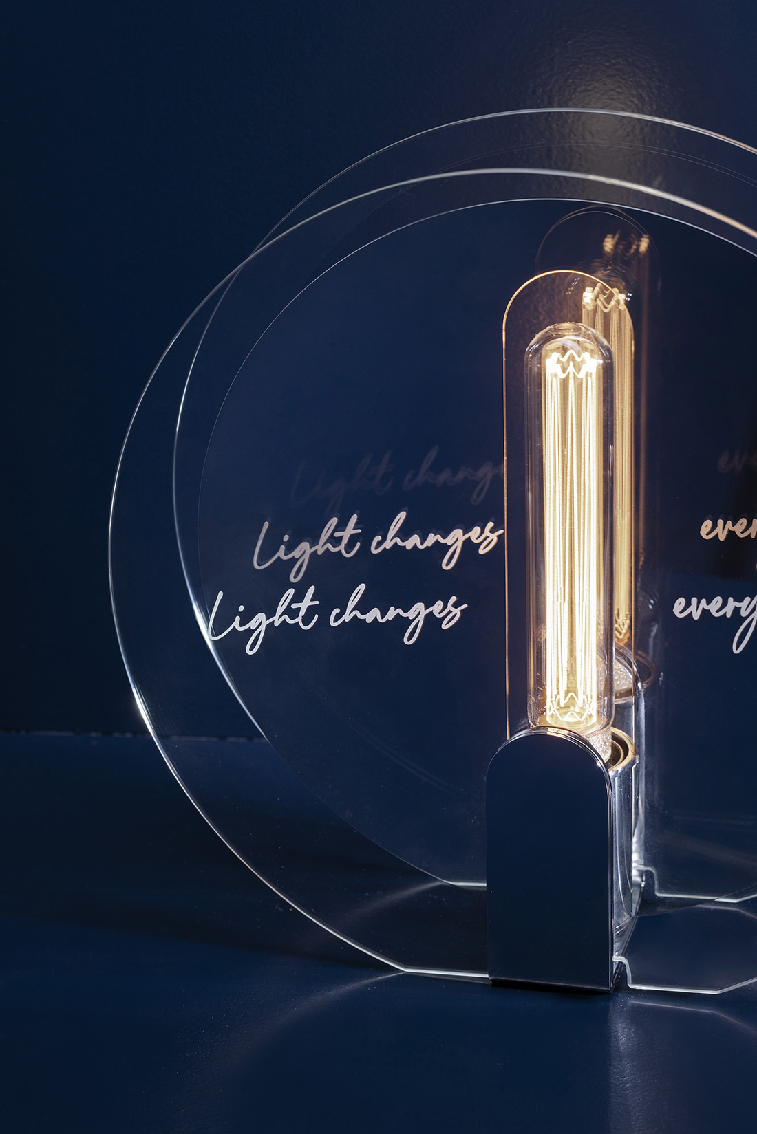 The wall lamp offers soft, diffuse lighting and displays messages visible from various angles, thanks to the combination of the front glass and rear lamp element. The table lamp, featuring a central chrome or copper disc, includes two glass panels that carry messages reflected onto the disc. Glass panels with or without text can be swapped out effortlessly, and hand-crafted colored glass can be used to add a personalized touch.
