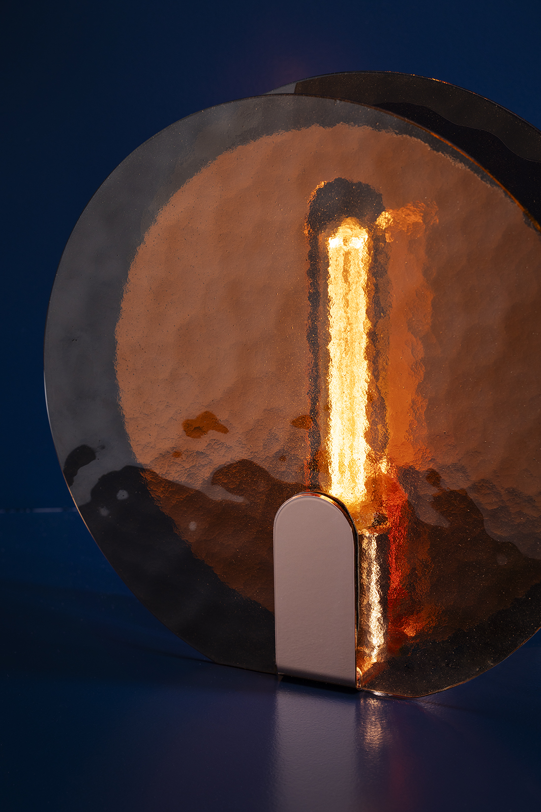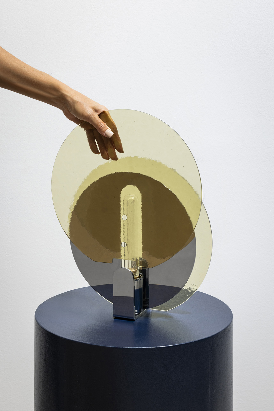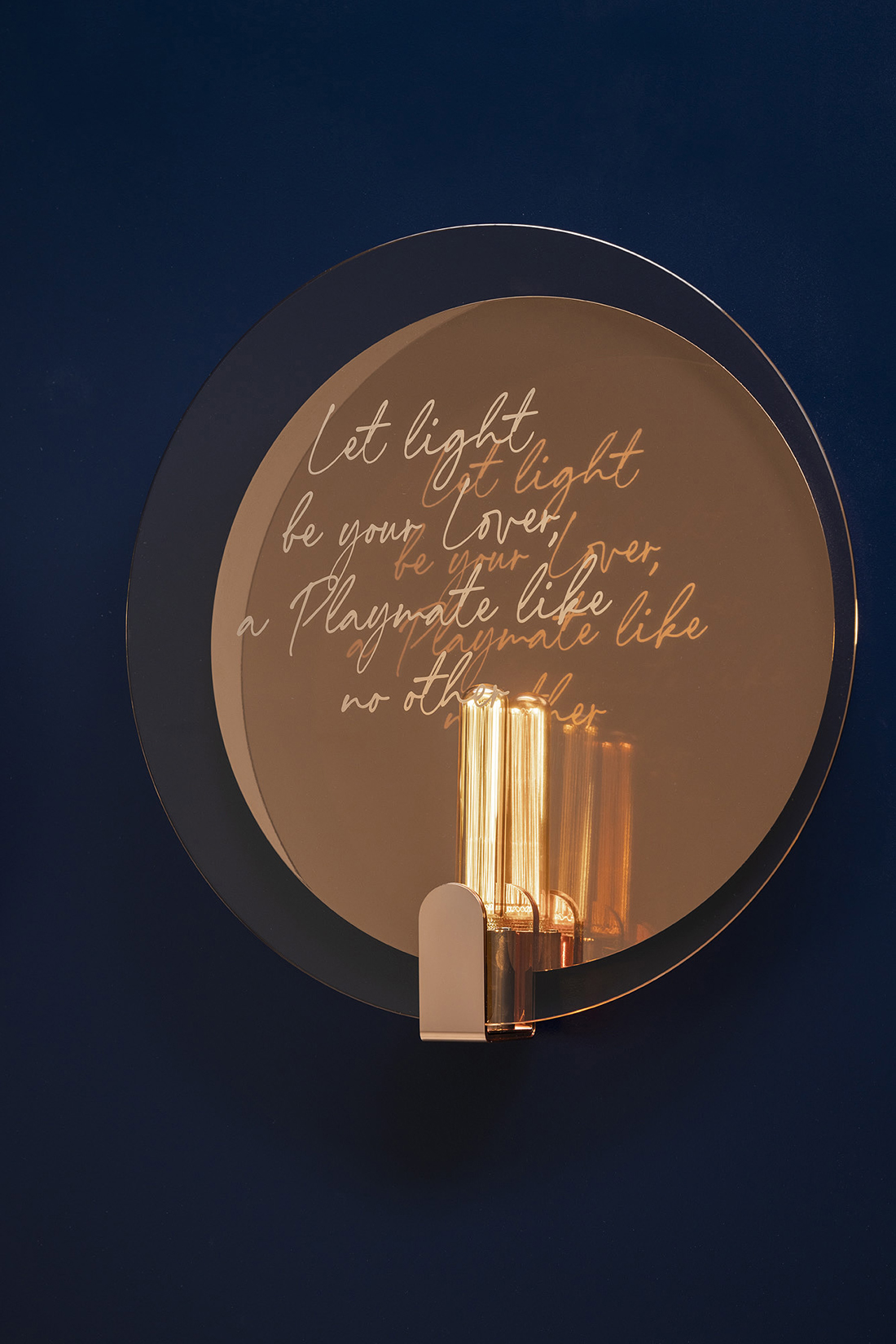 The wall lamp offers soft, diffuse lighting and displays messages visible from various angles, thanks to the combination of the front glass and rear lamp element. The table lamp, featuring a central chrome or copper disc, includes two glass panels that carry messages reflected onto the disc. Glass panels with or without text can be swapped out effortlessly, and hand-crafted colored glass can be used to add a personalized touch.