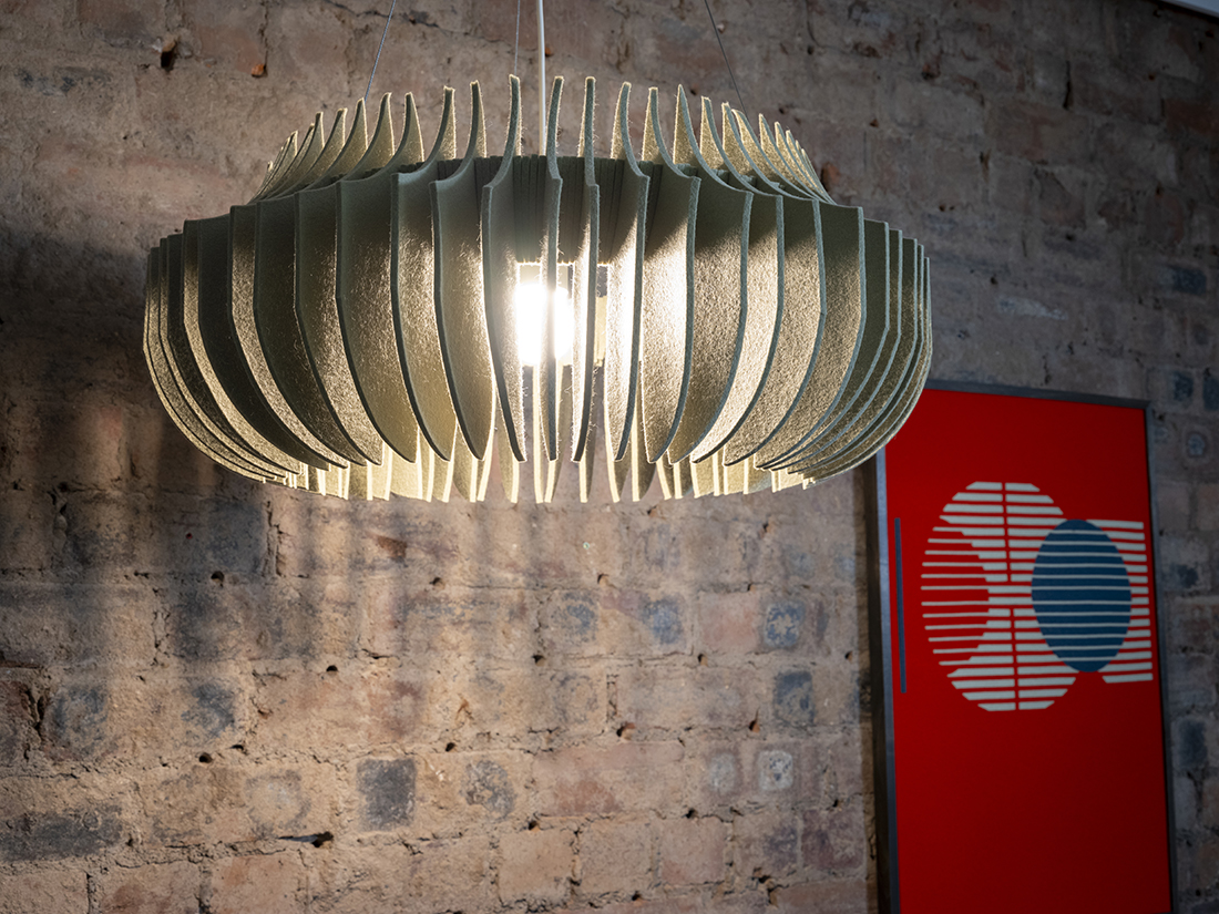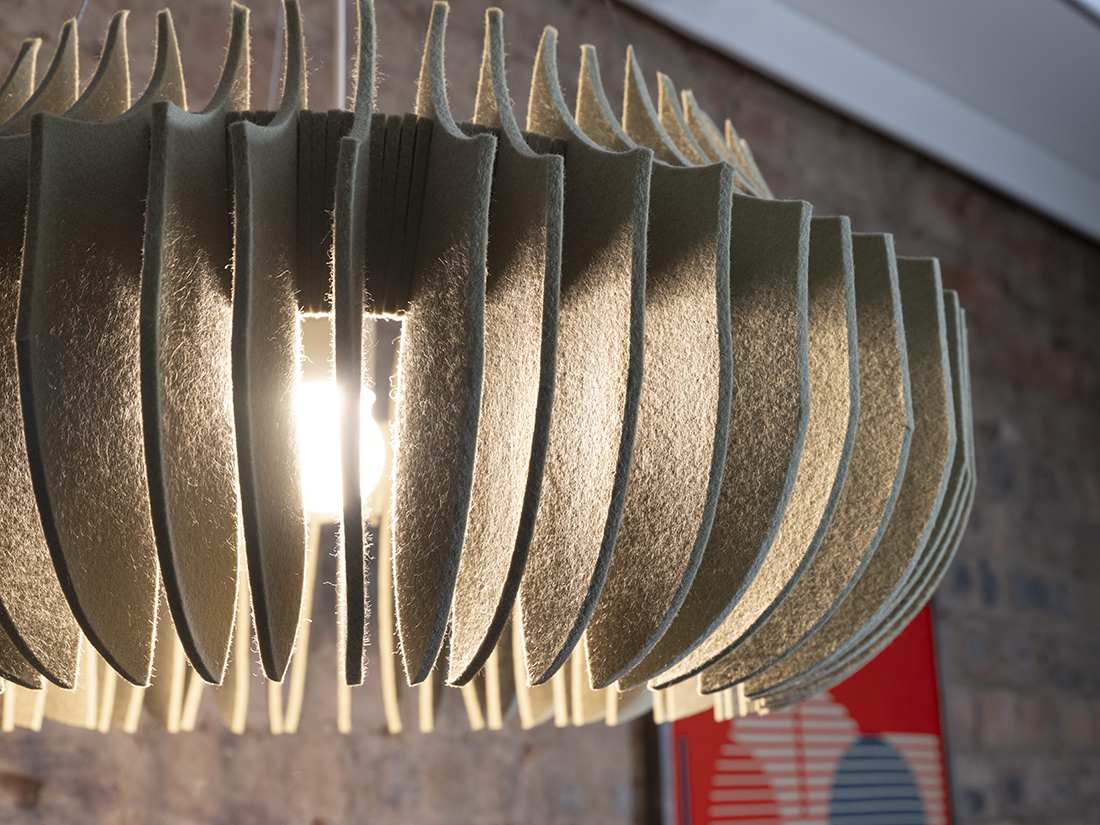 Linear is an elegant and functional light made from naturally sound absorbent, 100% pure wool felt that exudes a soft, warm illumination. Linear’s simple construction, and interchangeable, modular parts allow it to be disassembled, repurposed, reused, and ultimately recycled. Made from part-recycled natural materials and a zero waste pattern, it demonstrates our studio’s commitment to sustainability and design for the circular economy.