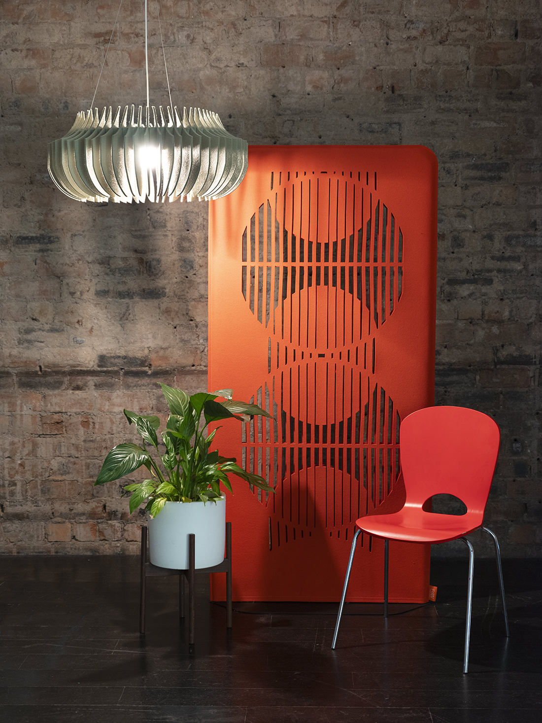Constructed from a single, repeated wool felt modular element slotted onto a circular aluminum frame, Linear’s sculptured, elegant silhouette is enhanced by the material’s richness of form and the shadows its light creates. Hang Linear individually, as a pair or triptych, or layered at different heights, to create a unique design statement that beautifully blends art, design, and acoustics.