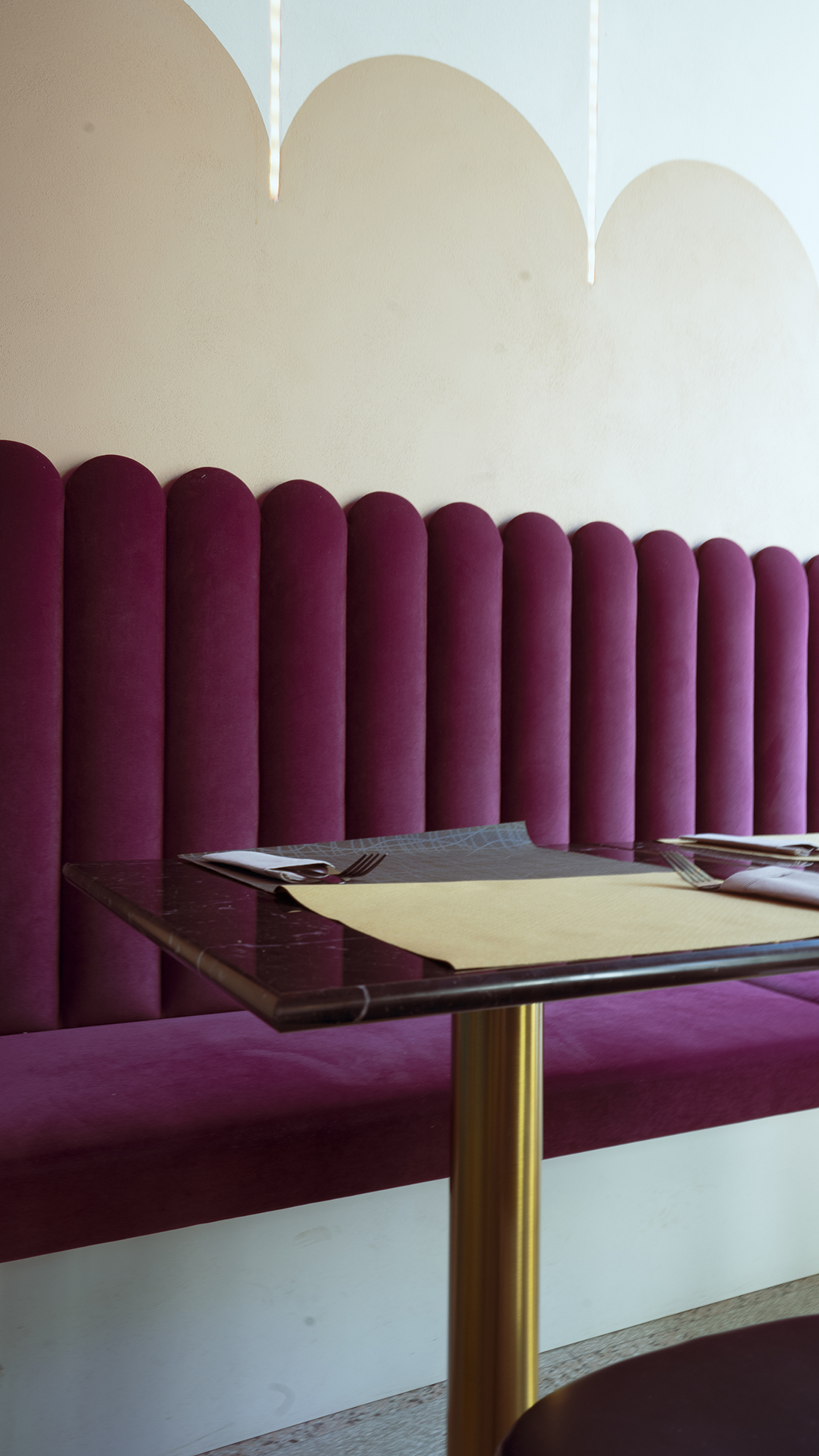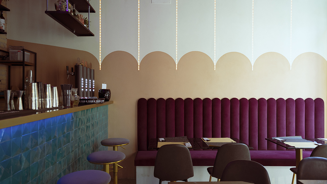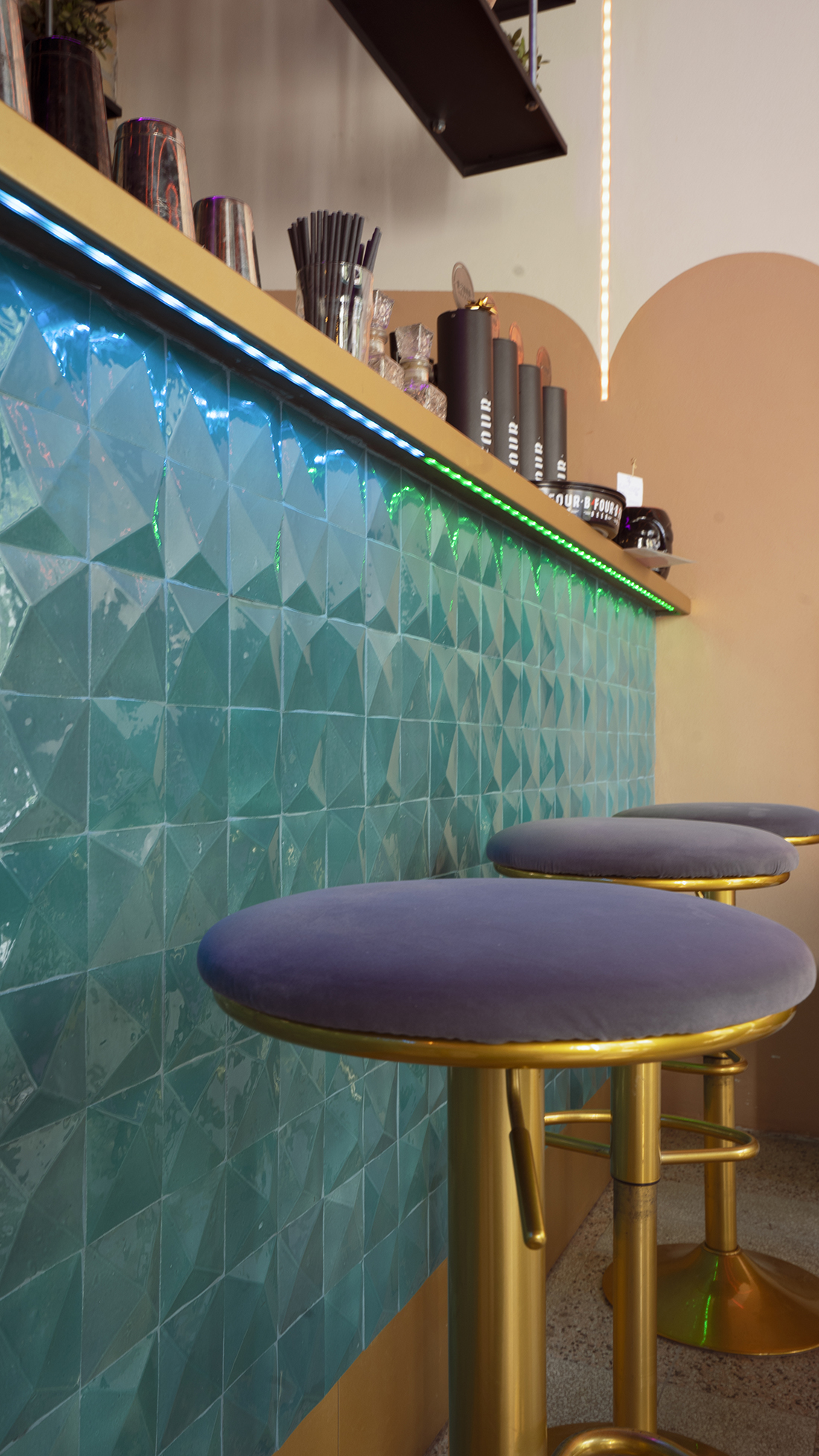 A carefully curated palette of colors and lighting, custom iron furnishings, glazed tiles, and brass accents enhance the bar’s distinctive identity. Thoughtful attention to bespoke furniture design creates a space that is both vibrant and inviting, offering a joyful yet intimate atmosphere.
