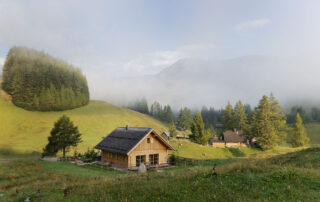 A residential building was designed for two brothers and their partners, which realises the different living concepts of each party in a compact structure. Above the village centre of Alberschwende in the Bregenz Forest, the property is located on a green slope that extends down to the village. The aim of the design was to keep the building mass towards the village to a minimum and to have little visual impact on the green space. The result is an elongated building at the edge of the site parallel to the access road. The residential building is almost hermetically closed to the access road and the narrow sides on the slope, with only decidedly placed openings framing the views like a picture. In contrast to these reduced façade surfaces, the living spaces open up to the landscape to the west through large glazed areas. The two flats are organised in storeys and accessed via a shared staircase. What both flats have in common is that a serving span along the length of the floor plan programmes the different living areas.