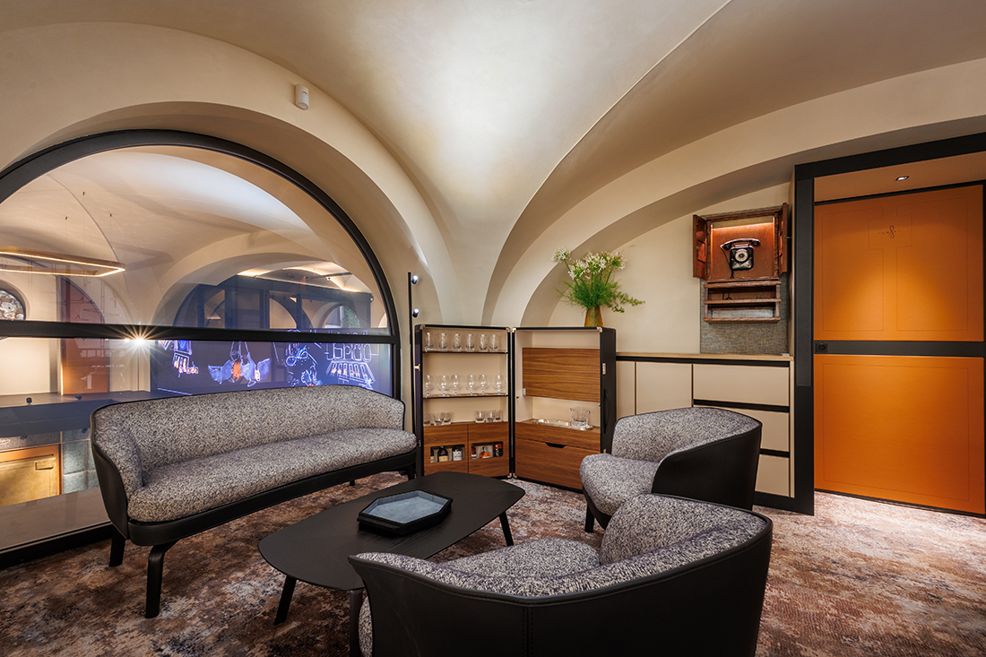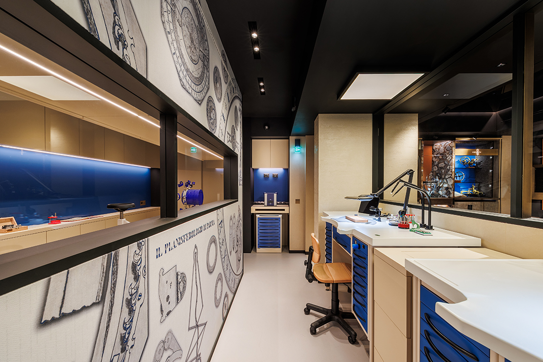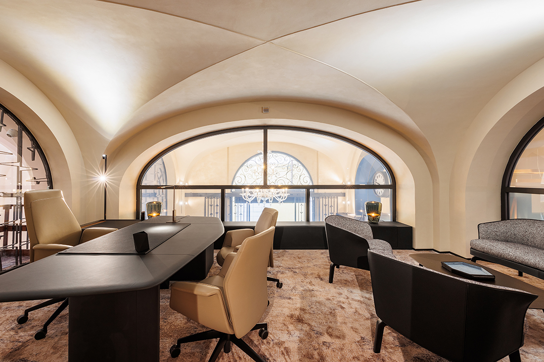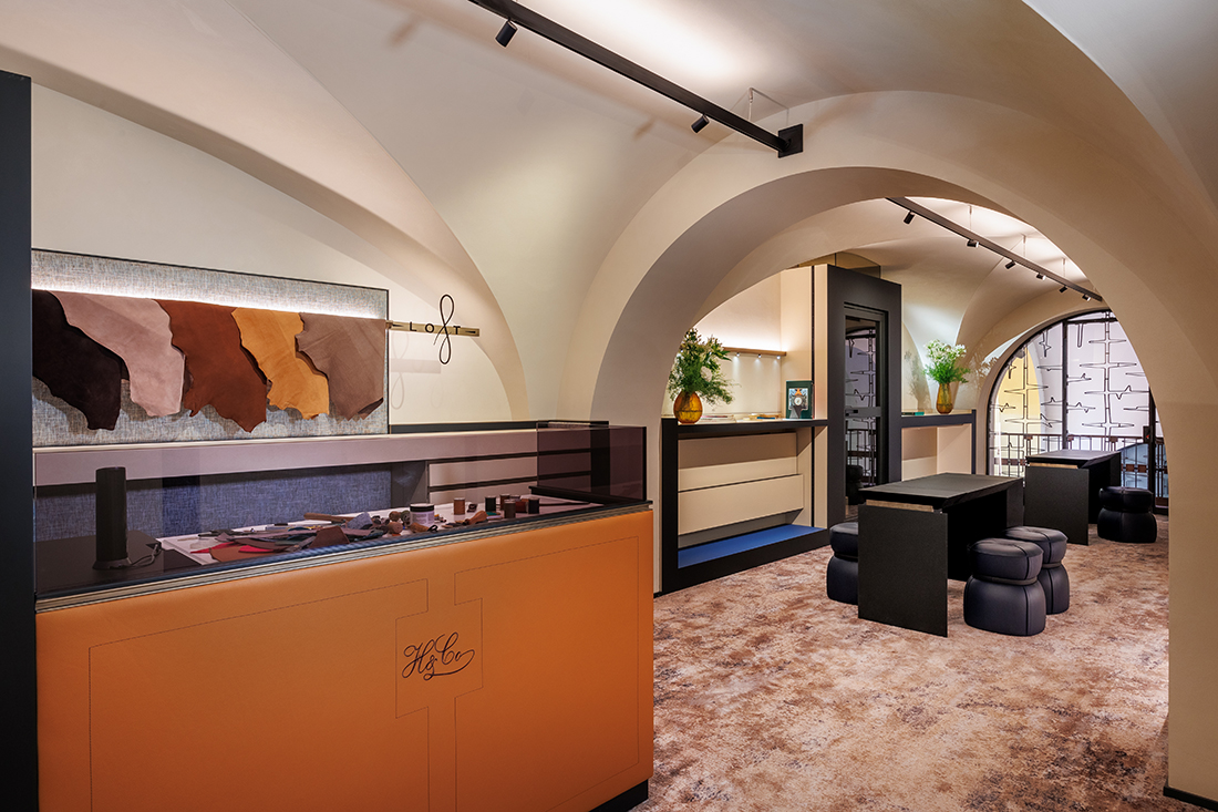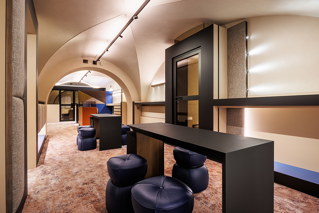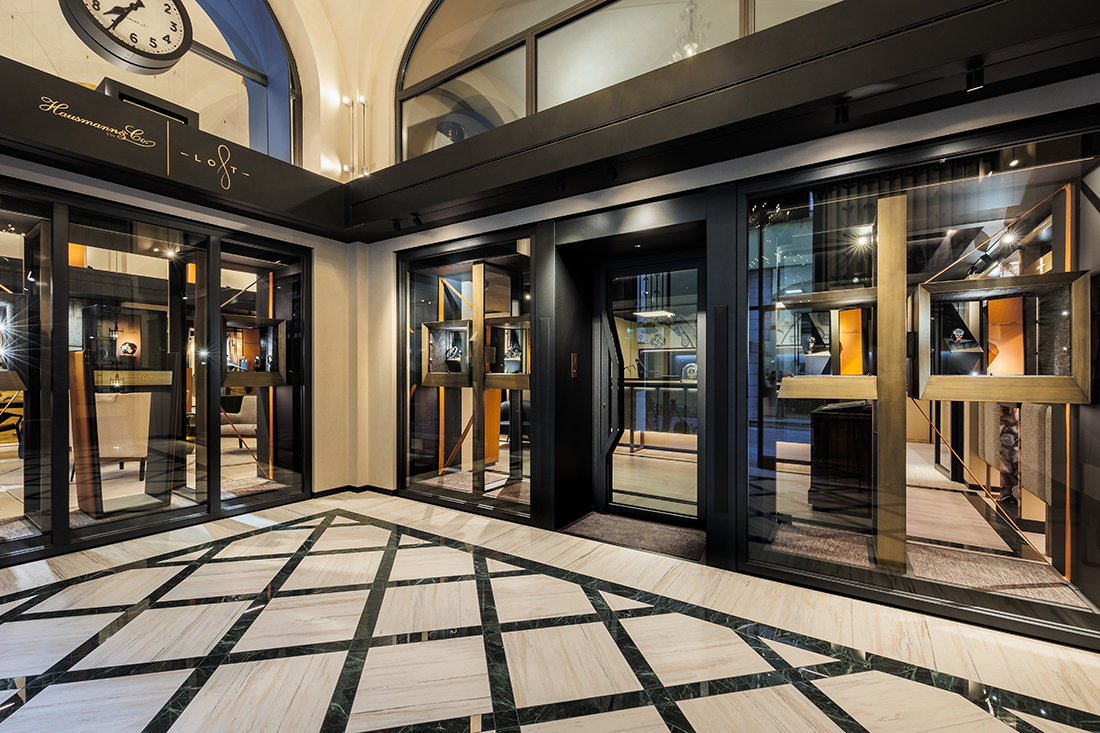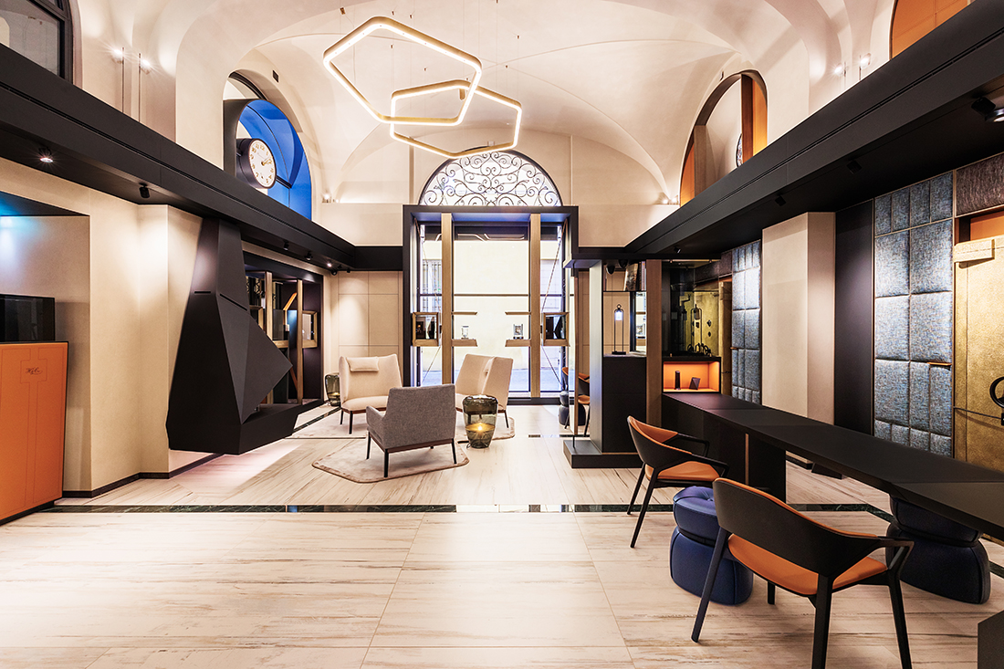 The design incorporates elements from the historic Hausmann & Co. shop on Via del Corso, such as the chandelier, twin clocks, and decorative carpet. The sales area embraces a cozy living room concept, featuring soft, inviting seating around a jewel-like fireplace. Custom-made tweed upholstery enhances the sound-absorbing ambiance, while a large black frame discreetly conceals the air conditioning, visually unifying the space.