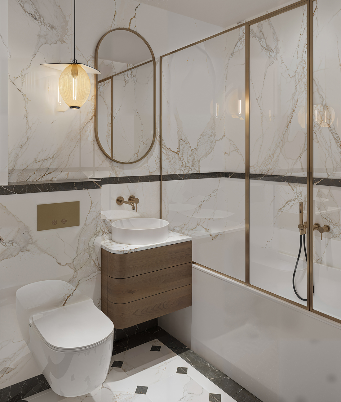 A restrained palette of natural materials, oak, marble, brass, and soft textiles, creates warmth and texture throughout the apartment. Custom shelving and carefully selected furniture pieces bring personality to the space, while maintaining a clear and cohesive visual identity. The project reflects our approach to design: honest materials, thoughtful composition, and interiors that feel sophisticated yet grounded and truly livable.