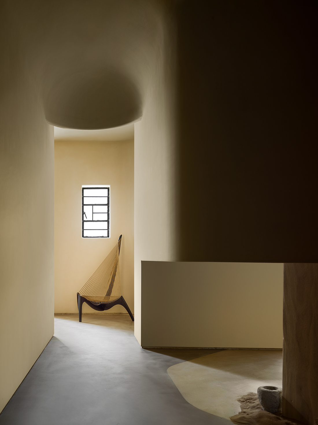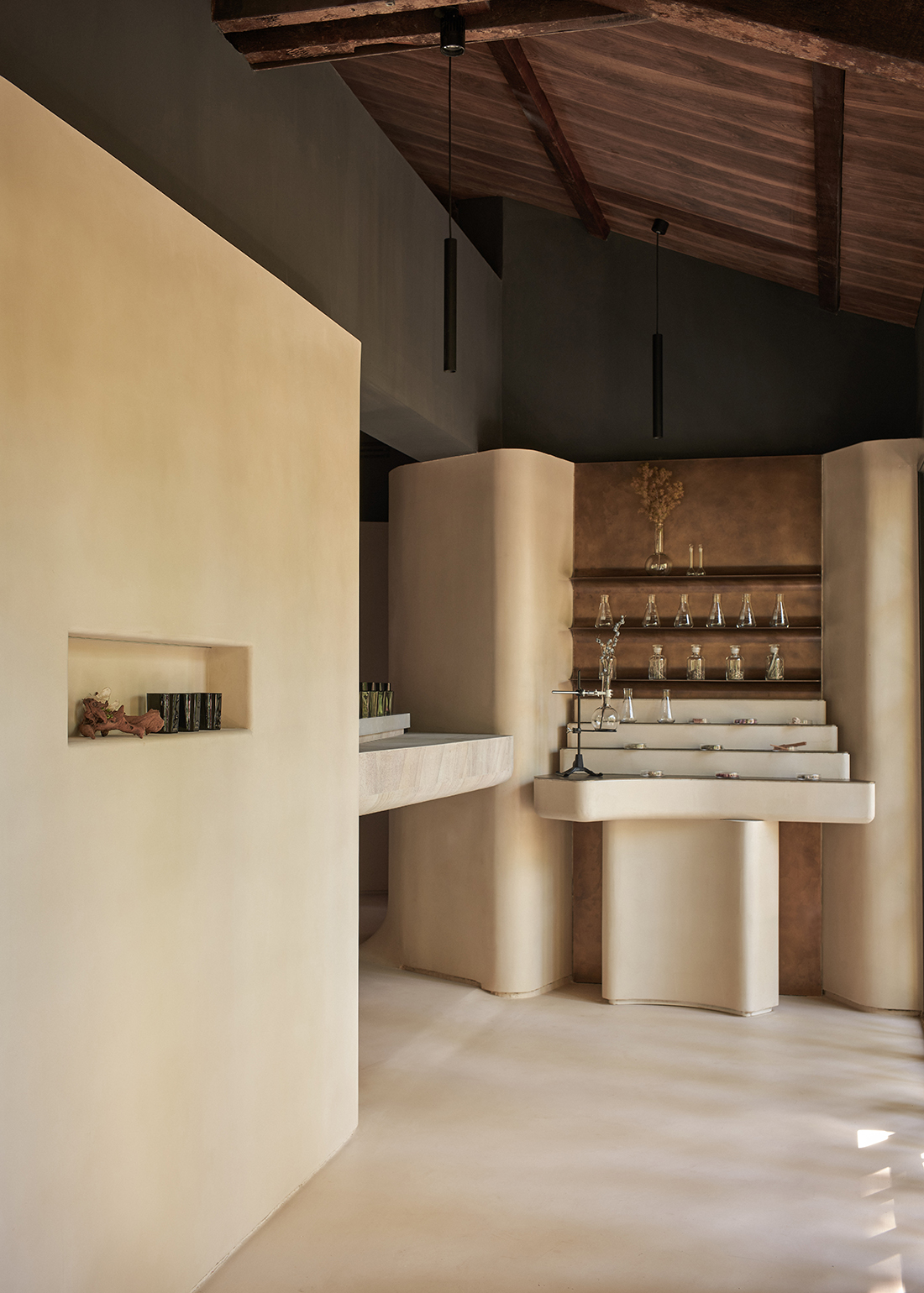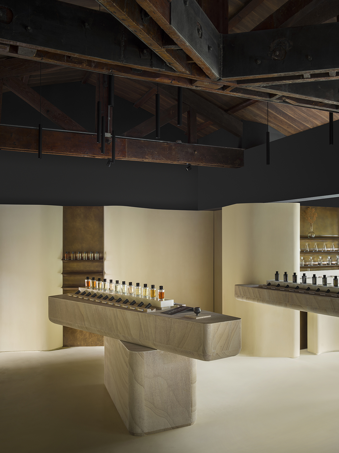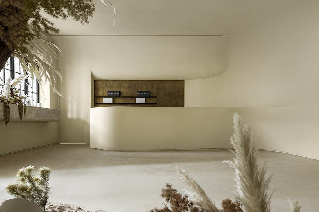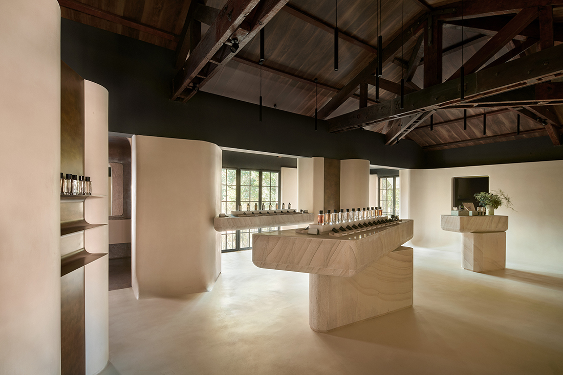 The entrance features a garden-style partition that invites exploration of the interplay between time and fragrance. Challenges in preserving historical features were met with a dynamic design approach, employing microcement for a seamless and tranquil finish. Thoughtful lighting and oxidized brass accents add depth, while the ground floor creates a cave-like ambiance. Restored timber trusses on the second floor embody the building’s history. Microcement highlights the walls, and polished natural sandstone slabs serve as display counter centerpieces. This design reflects a balance between humans, objects, and nature, ensuring the flagship store celebrates Shanghai’s heritage through an immersive, sensory experience.