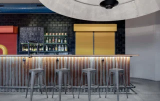 As Mochi Ramen unites two market stands in a single area crossing a market row, our idea was to create an area reflected along its axis which appears identical from either side. This gives access from two sides, offering two gardens in the hot seasons. 350 small window openings with double Plexiglas on each roller shutter scatter a mysterious light into the Mochi Ramen Bar and look like a magical lantern in the evening.