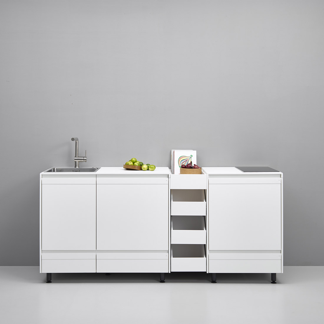 The system’s versatility stems from its independent modules, which allow users to customize their kitchen setup based on available space and desired functionality. Whether you need a compact, functional kitchen or a more expansive kitchen block, the Modular Kitchen System can be tailored to fit any wall width or niche. The design features two different cabinet sizes that can be seamlessly connected with customizable gap elements, ensuring a perfect fit in any space.