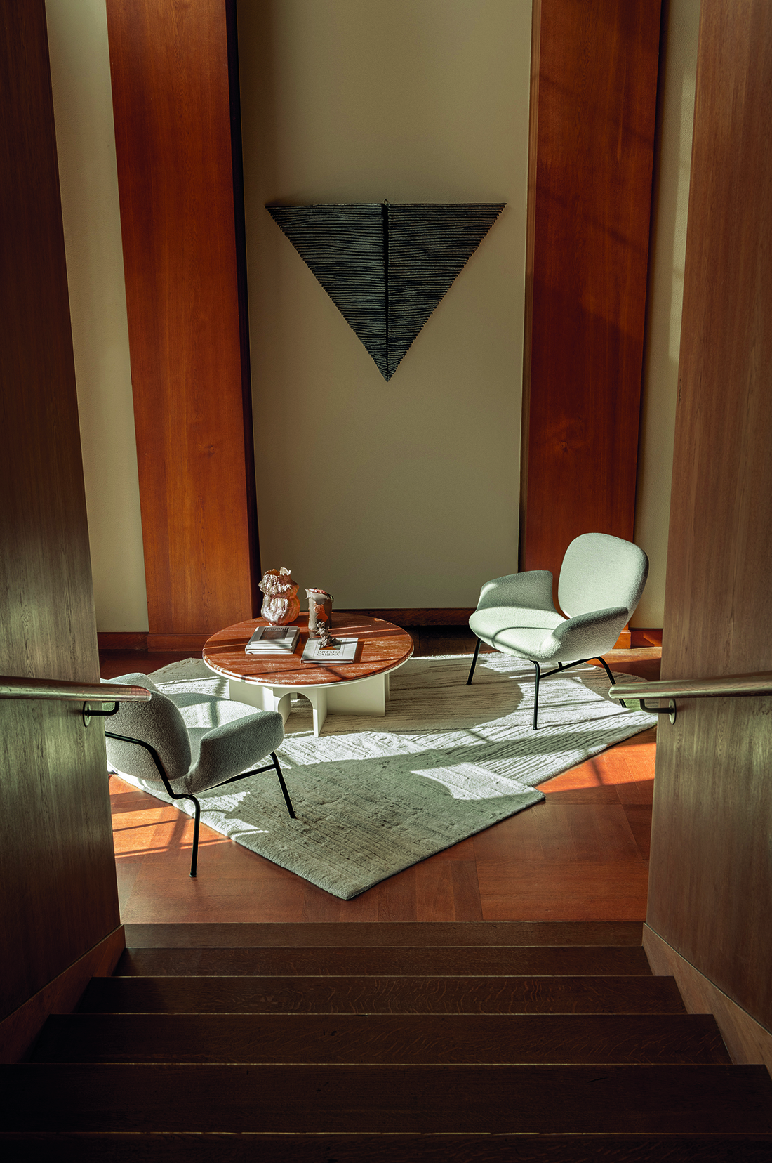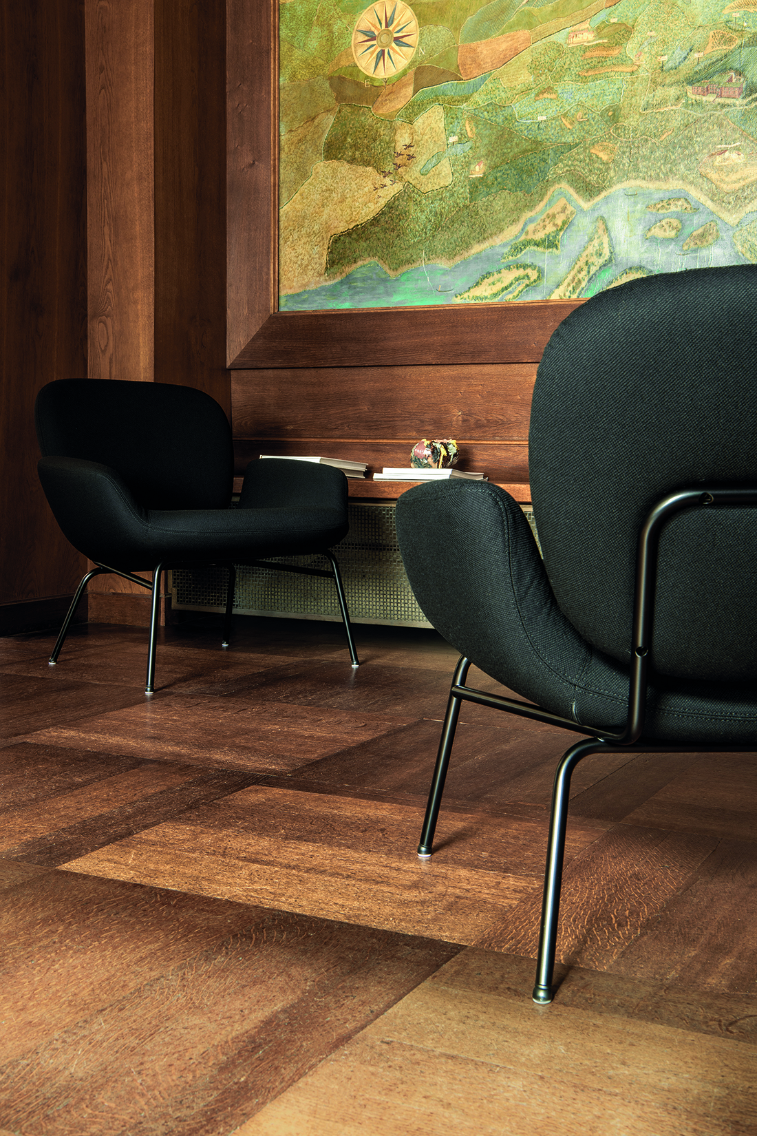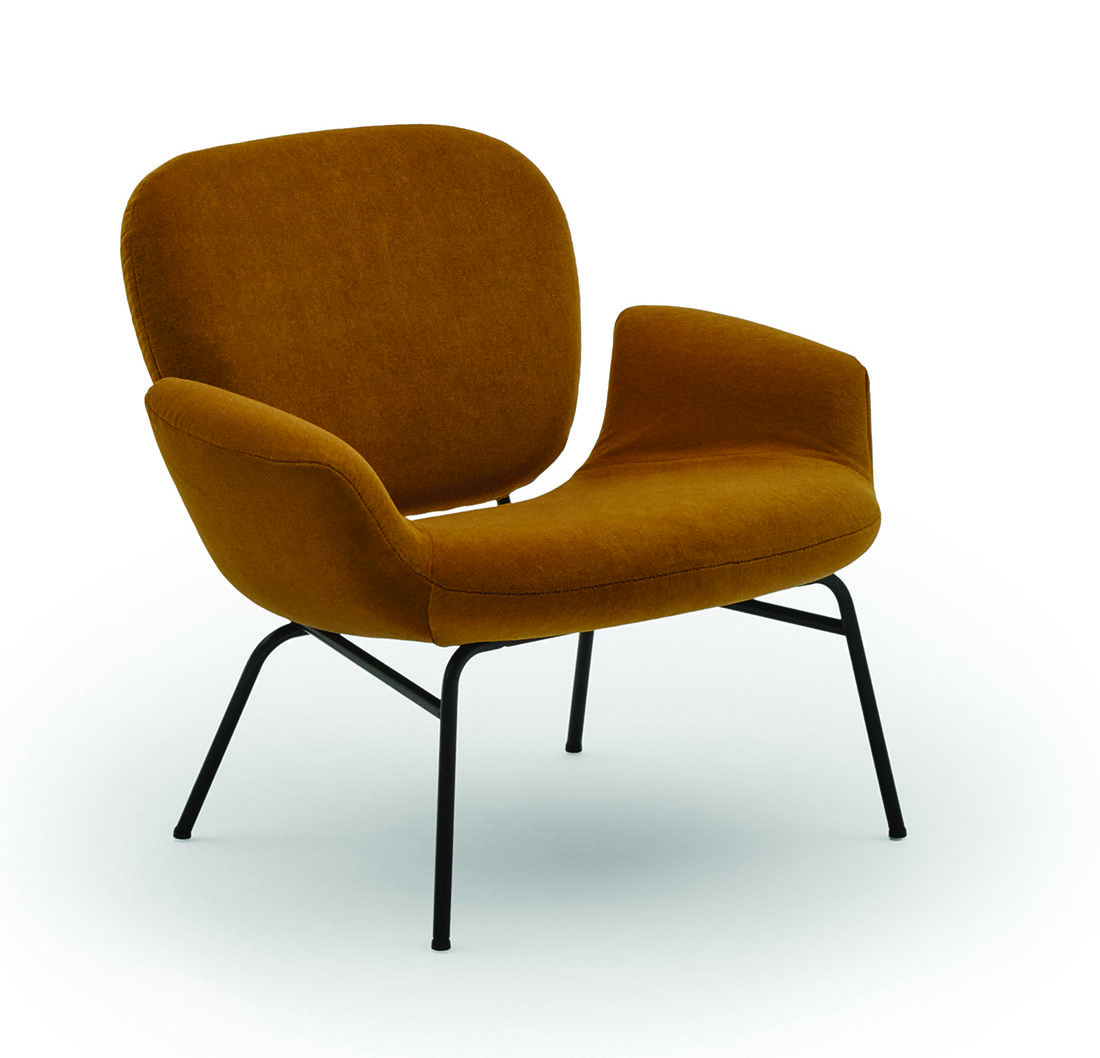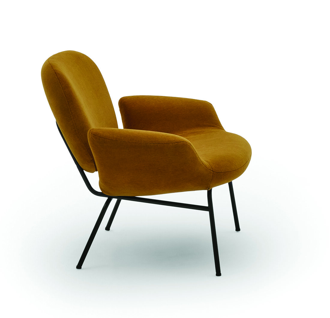 The molded foam seat and back cushions each possess an inviting softness, exemplified by the indentations formed where they are connected with the tubular metal frames. The lack of sharp corners, together with the gently curved forms of the cushions, inspired the name – Momo – which comes from the popular Japanese peach fruit, which is larger than its Western counterparts. While the upholstered cushions have a pleasing heft and volume, offering a superior seating experience, the overall design of the Momo chairs exhibits a certain lightness, making them highly furnishable: an attractive, comfortable, and useful addition to a wide range of interior situations.