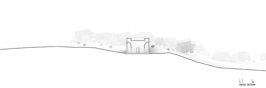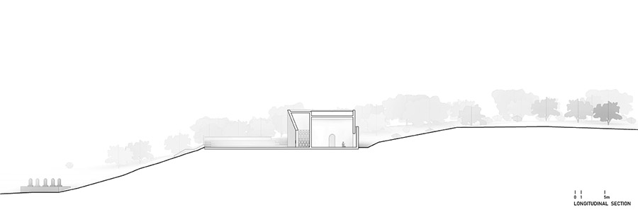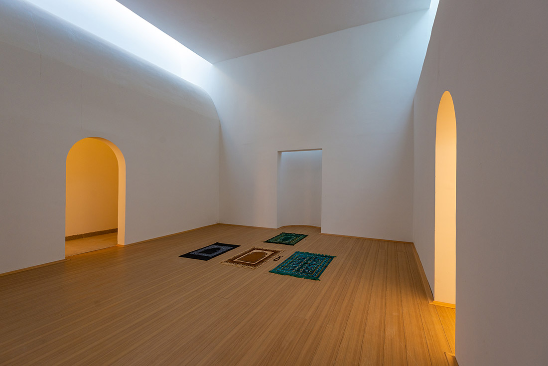 The interior space of the building, beyond the essential facilities for Islamic rituals, is shaped to create a universal meditation space. The longitudinal walls of the main prayer hall curve at the top to allow sunlight to penetrate through hidden zenithal windows positioned above the corridors. This design creates an environment where worshipers are illuminated by sunlight without any visible opening to the outside, giving the prayer hall a sense of universality and divinity.