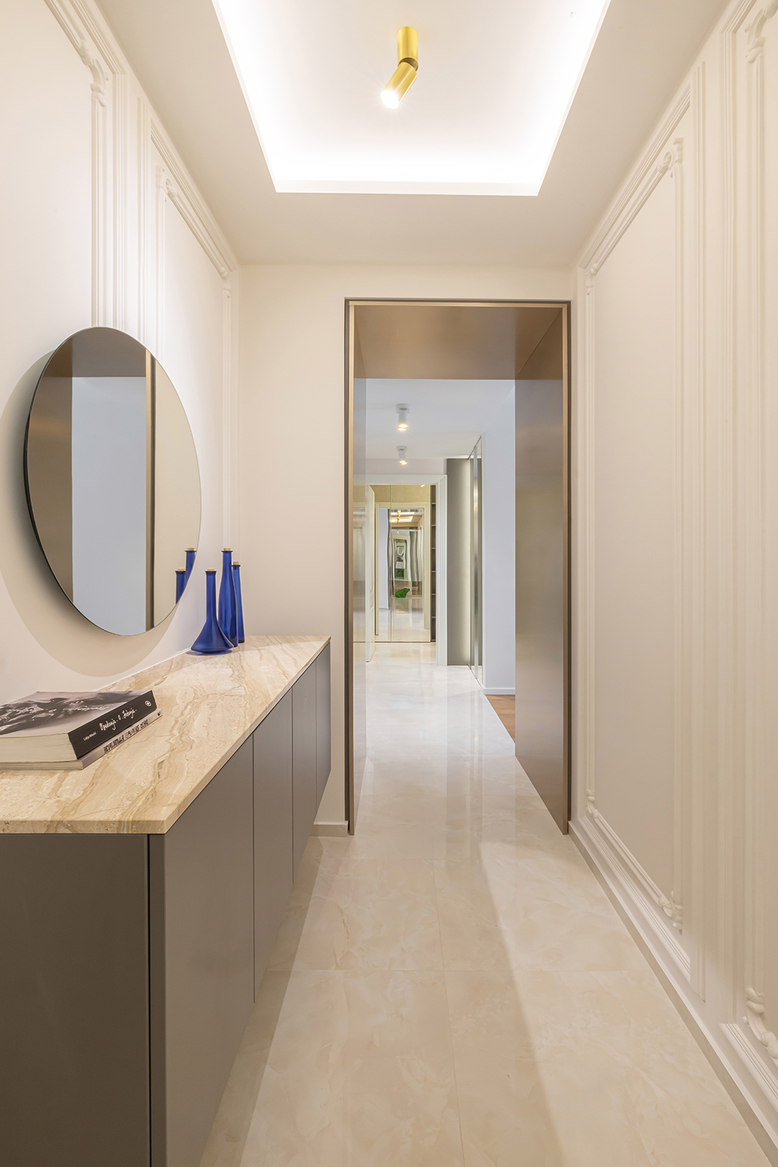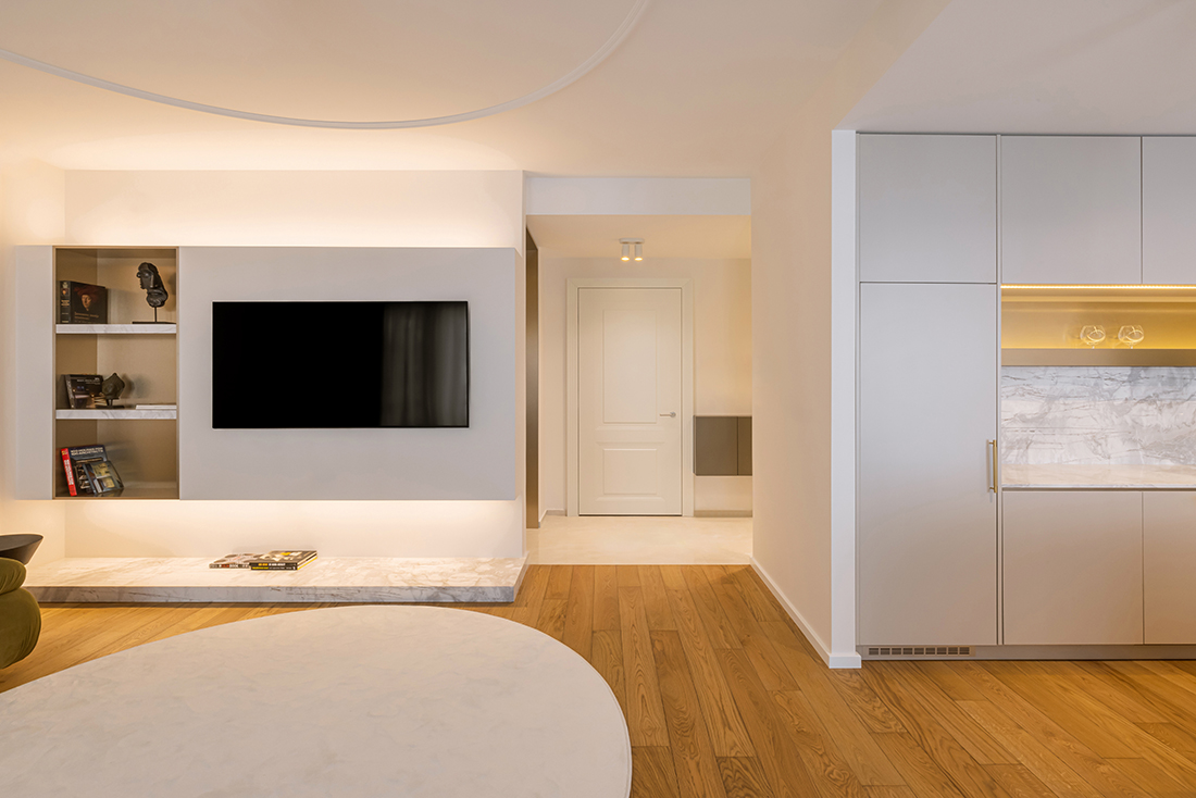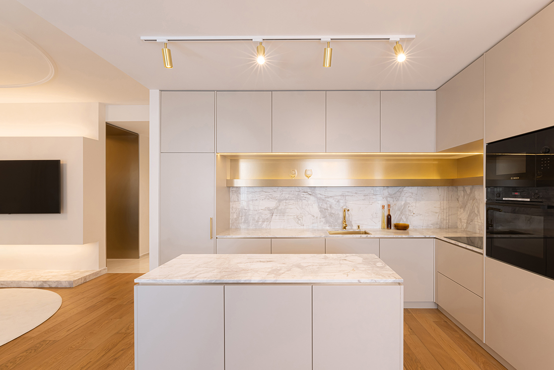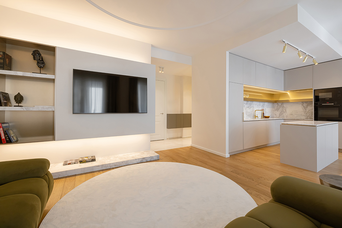 While the apartment’s installations were already in place, a significant adjustment was made in the new children’s room, where the electrical installation layout was modified. The interior is characterized by neutral white and beige tones, complemented by natural materials such as marble and MDF with a golden metallic finish. Thoughtful lighting design, incorporating both direct and ambient sources, enhances the sense of spaciousness through reflections and dynamic interplay with mirrors.