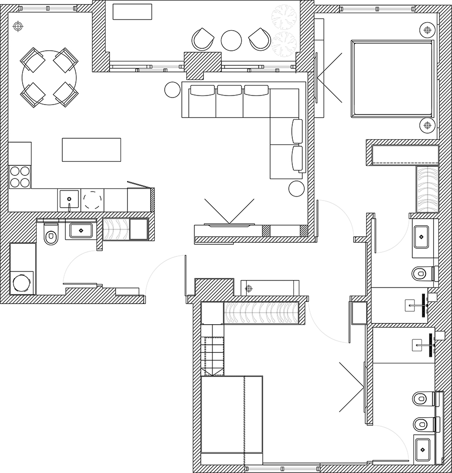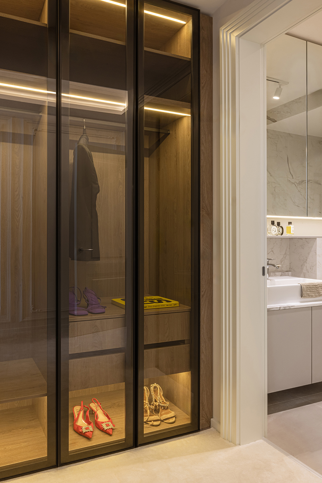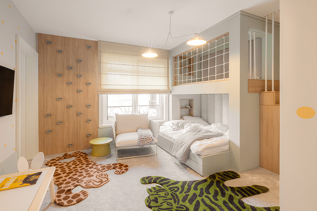 While the apartment’s installations were already in place, a significant adjustment was made in the new children’s room, where the electrical installation layout was modified. The interior is characterized by neutral white and beige tones, complemented by natural materials such as marble and MDF with a golden metallic finish. Thoughtful lighting design, incorporating both direct and ambient sources, enhances the sense of spaciousness through reflections and dynamic interplay with mirrors.