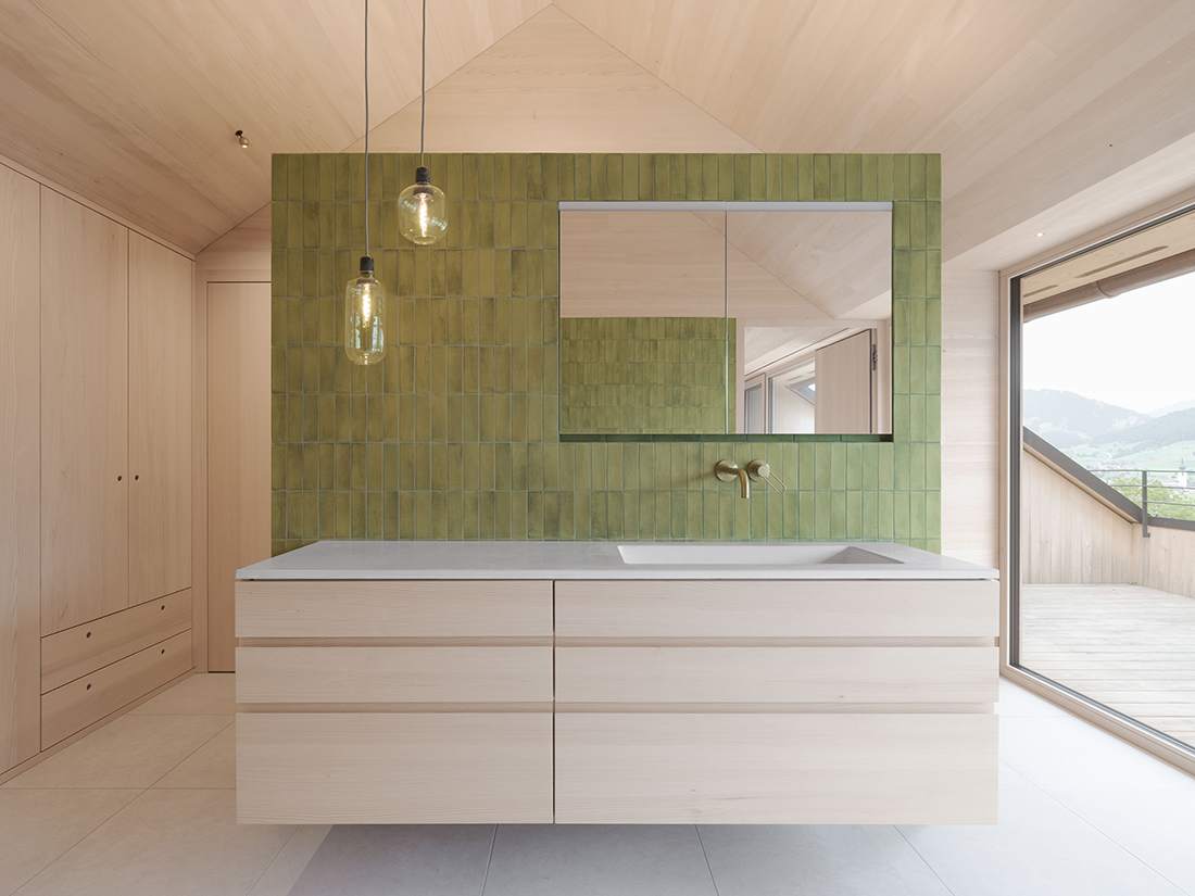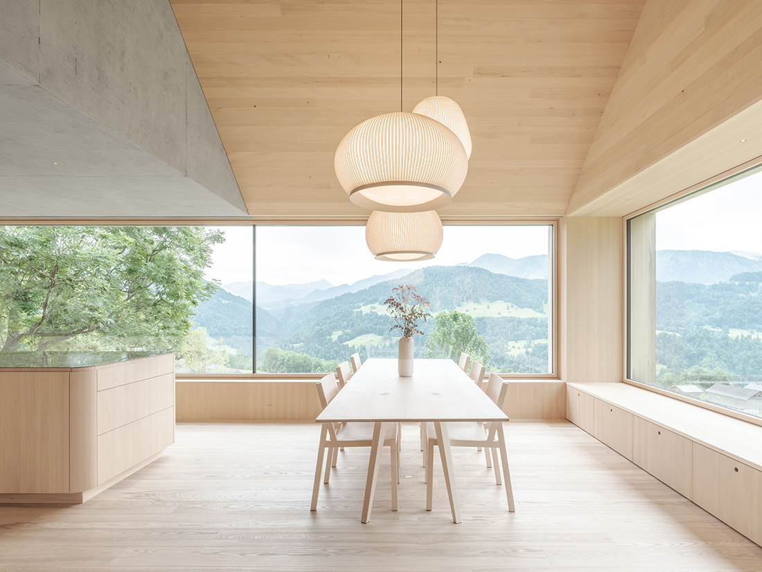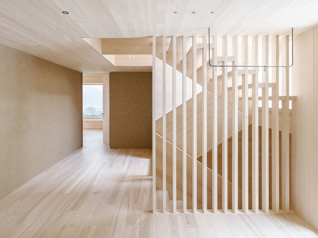 The base floor was constructed in exposed concrete. On the south side, small windows in the basement are reminiscent of classic stable windows. The two upper floors are fitted with a classic, floor-to-ceiling canopy. The interior is dominated by local silver fir for almost all surfaces and furniture. Only one exposed concrete wall in the living area provides a striking contrast to the wood. Generous glazing frames the picturesque mountain landscape. The family currently uses the ground floor and upper floor. When the children grow up or start their own families, the living space can be expanded by converting the currently undeveloped basement area. The barn between the old and new wings can also be used for residential purposes at a later date. With only minimal effort, the entire building can be adapted to different living situations. It offers space for up to 3–4 residential units without the need for any changes to the existing new building – in keeping with the traditional, multi-generational house as we know it from old farms. All wooden elements in the interior, the entire façade, and all structural timber come from the company’s own forest.
