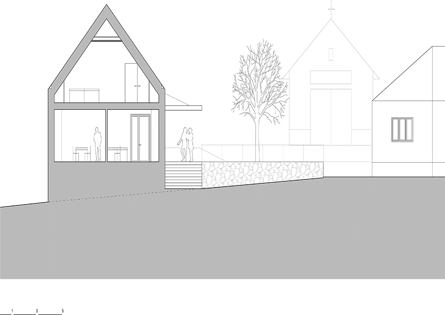 Beyond the house itself, the demolition of the original building and the repositioning of the new structure created a much-needed public space. In synergy with the surrounding buildings, this transformation established a new village center.