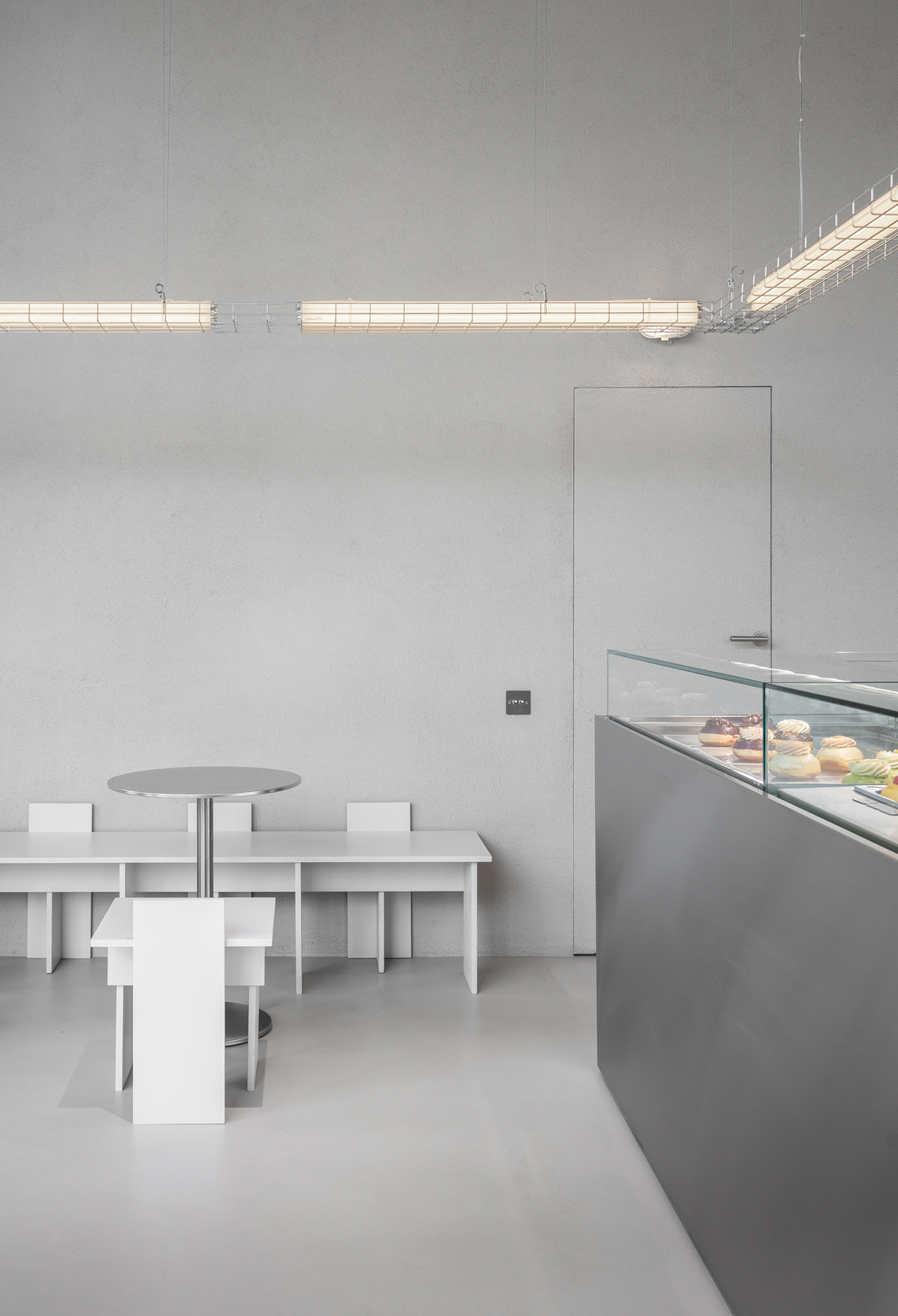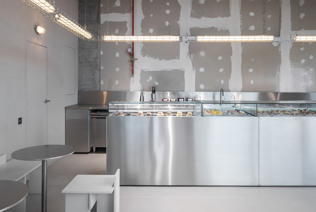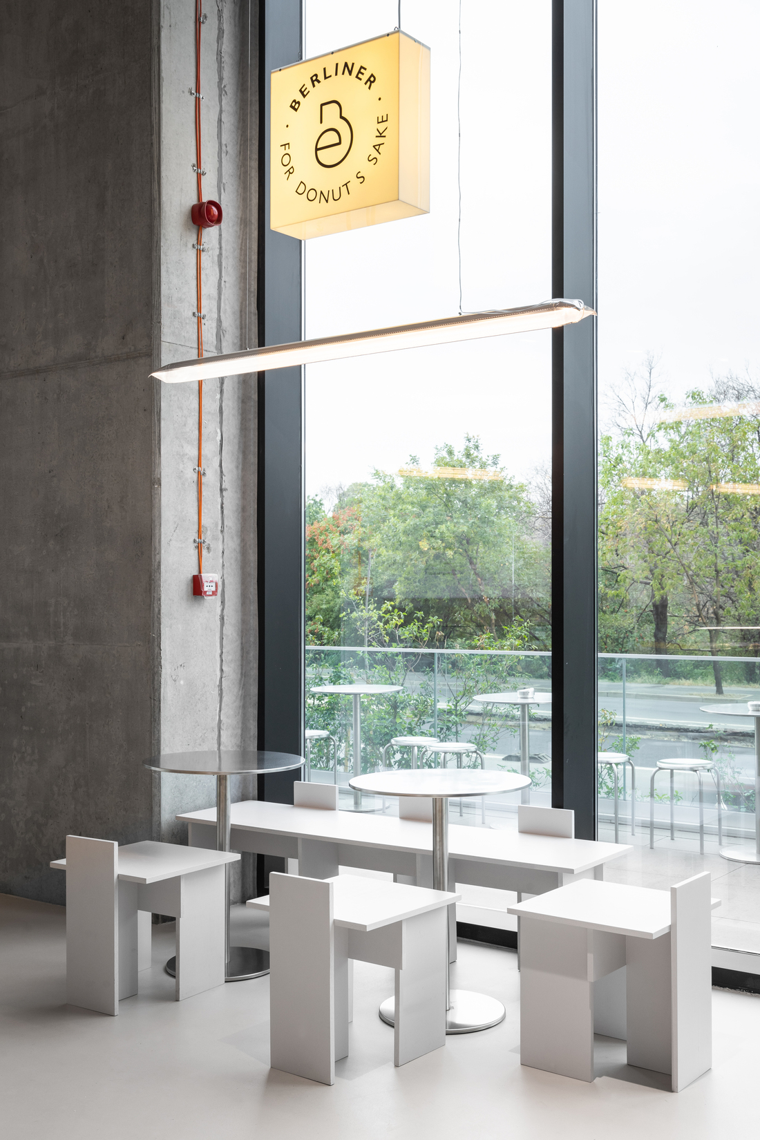 BERLINER DONUTS is a coffee and donuts shop on the ground floor of the new One development, on Barbu Văcărescu Street. Near Verdi Park, the building has become a growing landmark for local residents. Our design approach aimed to achieve maximum impact with minimal interventions and resources. We focused on optimizing existing elements found on site rather than introducing complex solutions. By assessing what was already in place, we streamlined efforts, reduced costs, and minimized disruption. A central concept was elevating materials typically hidden in the background—technical components were brought forward as defining features. Drywall panels became the main chromatic base, their neutrality framing other textures. The imperfect central wall contrasts the geometric furniture, creating balance. Our process was playful, blending intentional design with found elements, allowing for a dialogue between control and spontaneity.