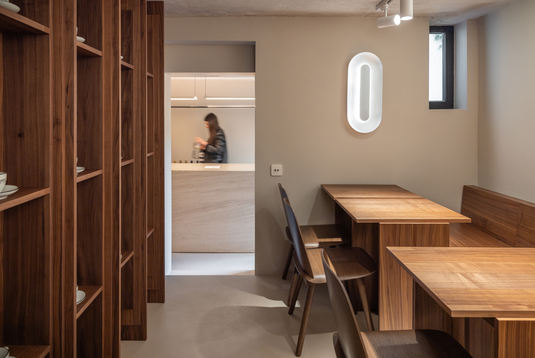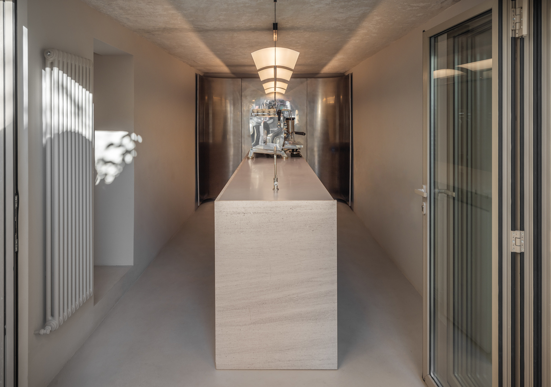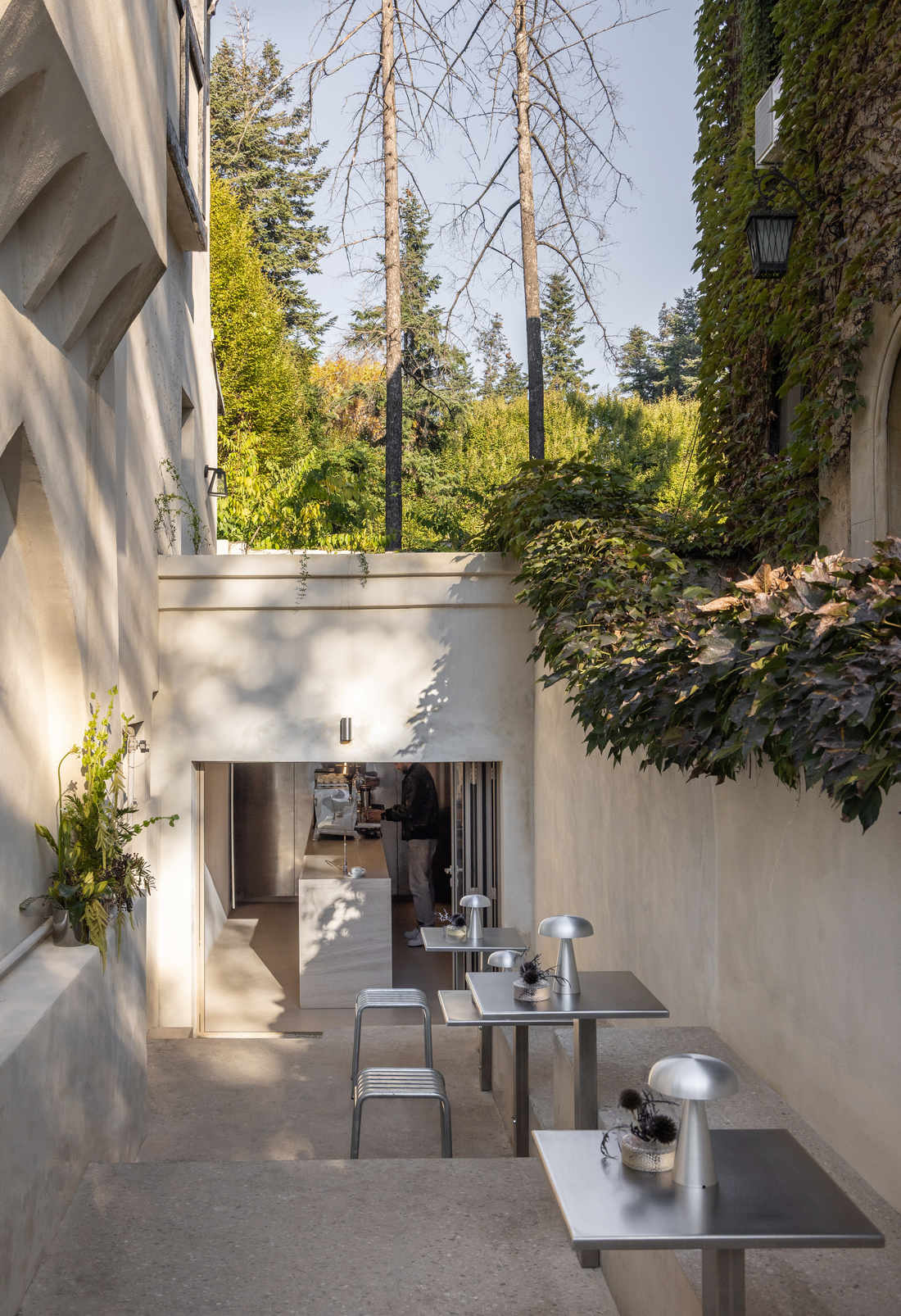The architectural elements that highlight the historical character of the location are influenced by its eclectic style. In designing CHARIOT CAFE, we aimed to emphasize these features through a subtle approach that keeps them central while ensuring coherence. The two interior spaces shape distinct narratives. The bar room conveys permanence through sculptural forms carved in unified geometry and materiality. In contrast, the “library” offers a disciplined retreat, with walnut furniture creating intimacy. We exposed the original ceiling by stripping plaster, adding texture and authenticity. This set the base for our palette: microcement floors, lime-washed walls, limestone surfaces, and Corian in soft beige tones. The bar connects to the street via a glass façade, complemented outside by concrete steps and minimal built-ins, forming a plaza-like threshold. A curved stainless steel centerpiece reflects the room subtly, while the second space deepens the sense of calm and introspection.