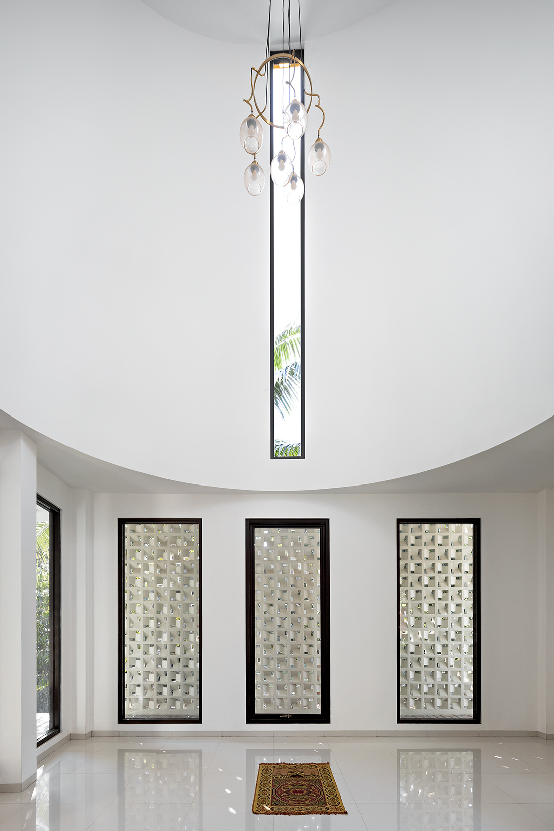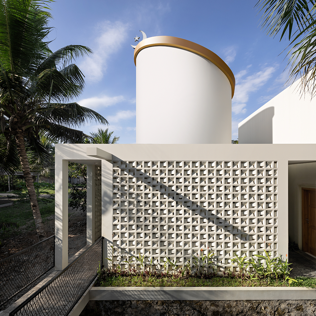The elevated prayer hall is crowned by a cylindrical dome with a narrow, vertical slit through which light descends like a celestial beam, symbolizing the divine presence of Allah. The height of the dome recalls a minaret, while the slit defines the Qibla direction, guiding worshippers toward Mecca. The color and material palette reinforces this spiritual narrative: the white façade expresses purity and transcendence, contrasting with lush greenery, while a golden ring atop the dome signifies divine light and majesty.