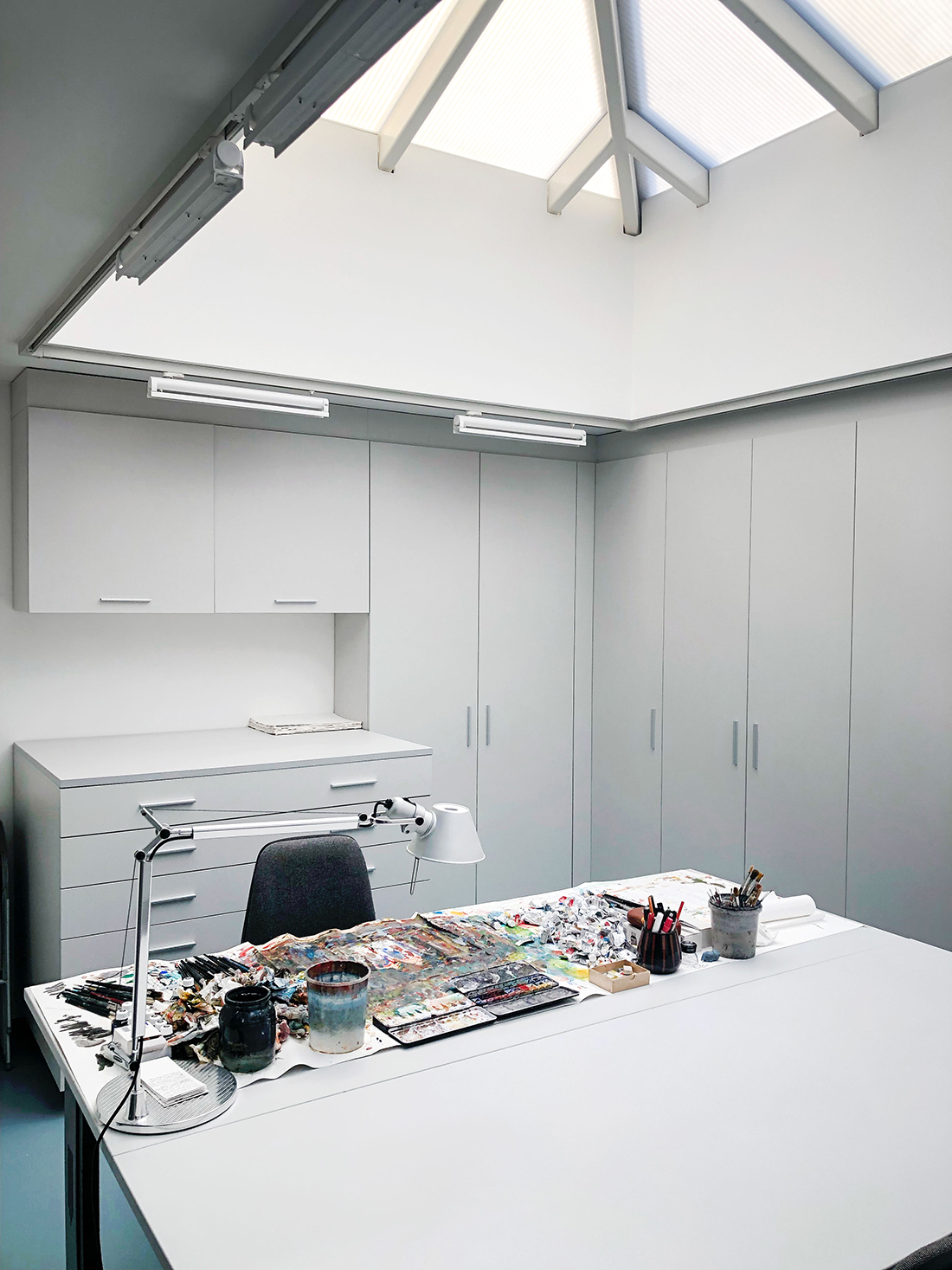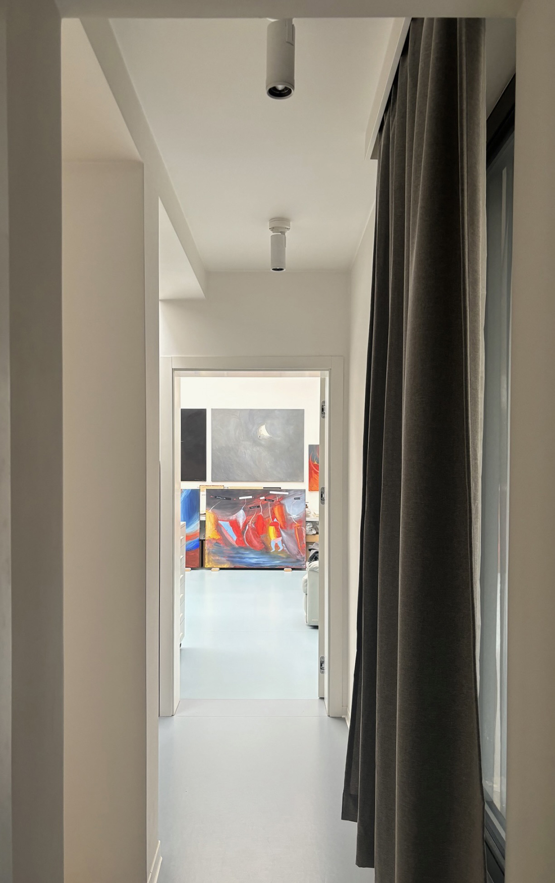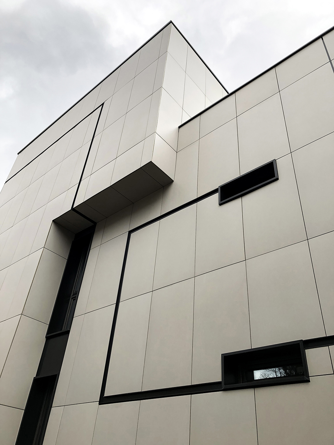 The two houses are seamlessly connected, functioning as one cohesive home while offering individual creative spaces within an intimate, shared family environment (1 house + 1 house = 1 home). The façades are minimalist in design, with volumes deliberately defined by solid, uninterrupted surfaces. The linear reveals break up the façades, linking the windows and transforming them into abstract elements that change with the light of day and the seasons. This “living” geometry reflects the owners’ creative lives and their connection to contemporary global art.