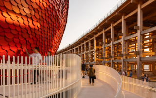 Commissioned by the Singapore Tourism Board, the Singapore Pavilion, The Dream Sphere, is a 17-metre-tall sphere clad in 17.000 recycled aluminum discs.