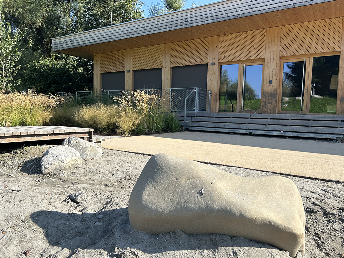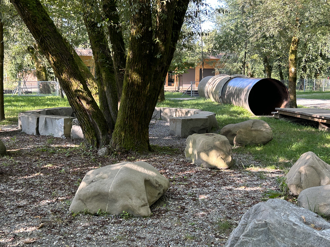 The kindergarten’s activity area is seamlessly integrated into the overall design. Starting from the kindergarten, a wooden walkway leads into the second zone, encouraging children’s spatial and self-awareness with features such as a sound tube, rocky terrain, hollows, a hollow path, and playful bushes. This area is already accessible to the public.