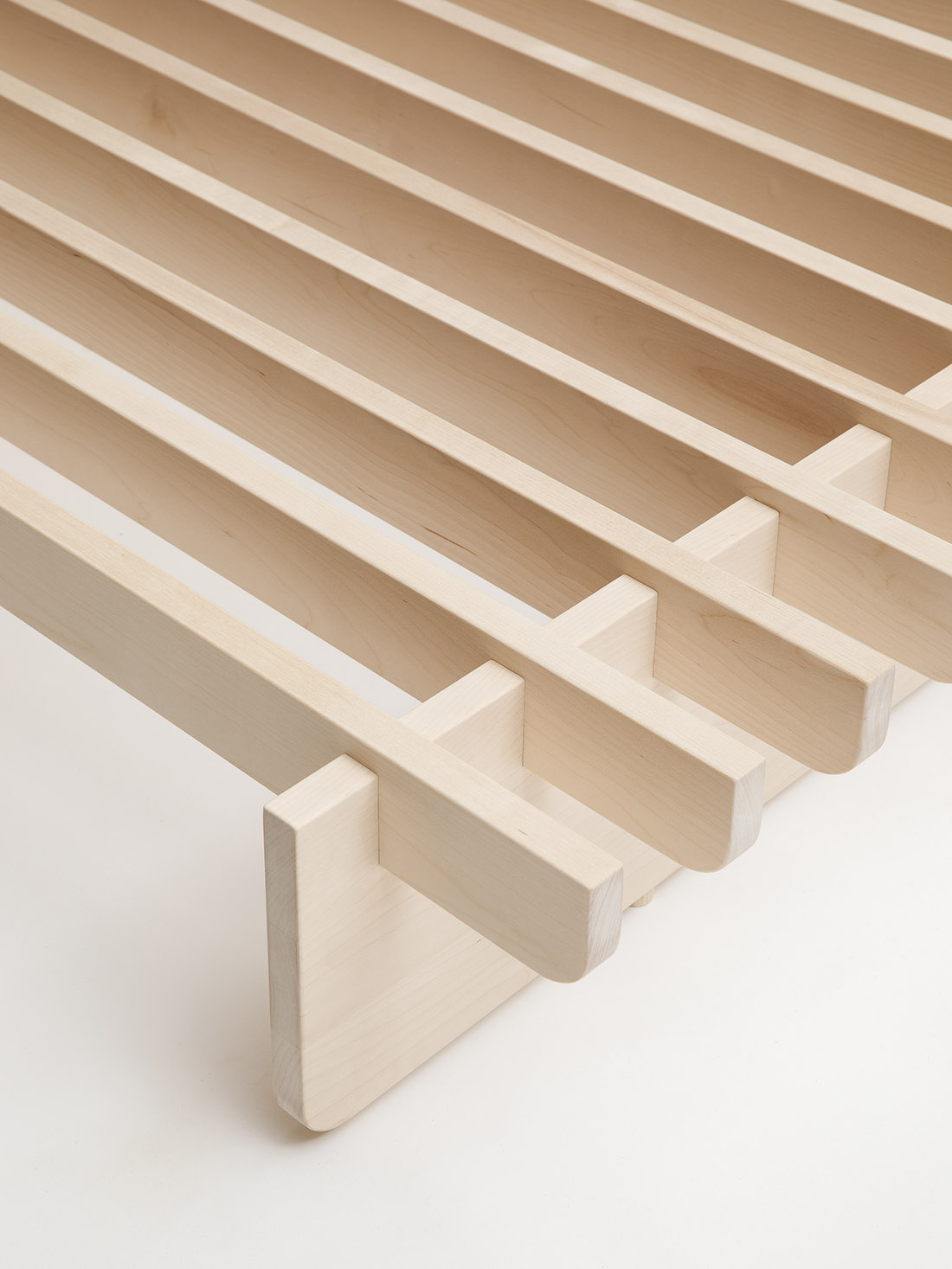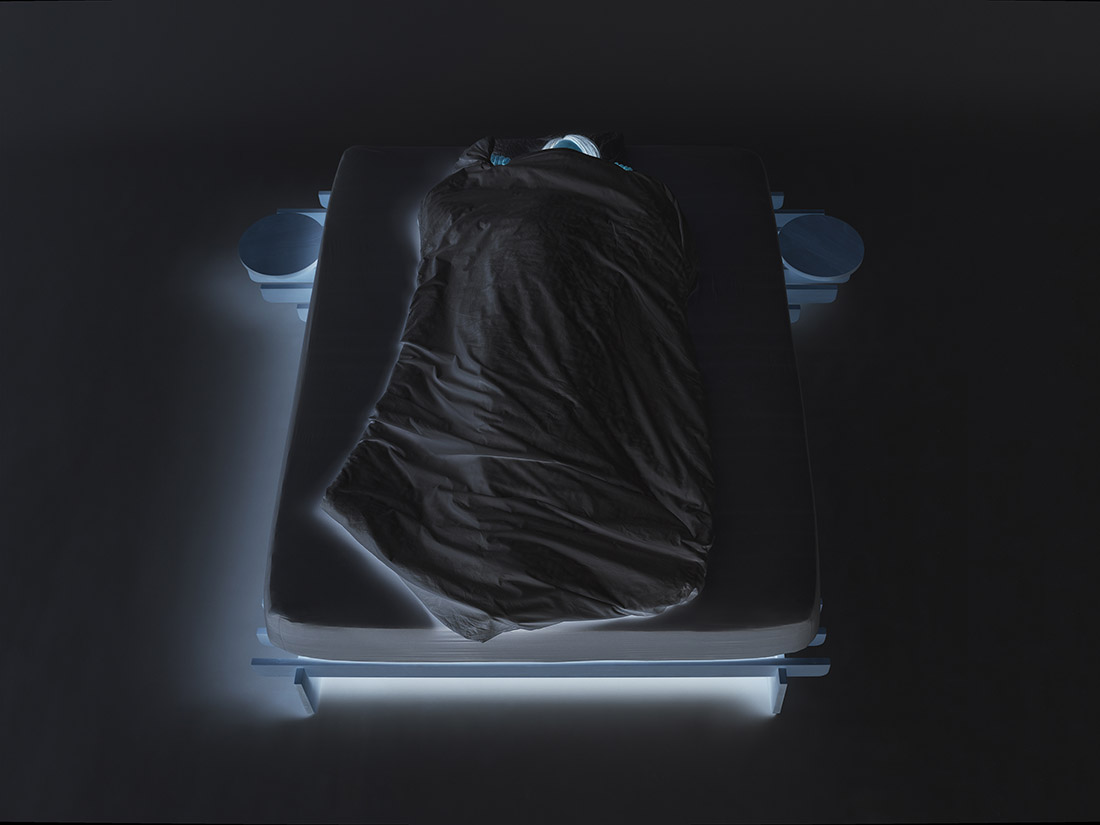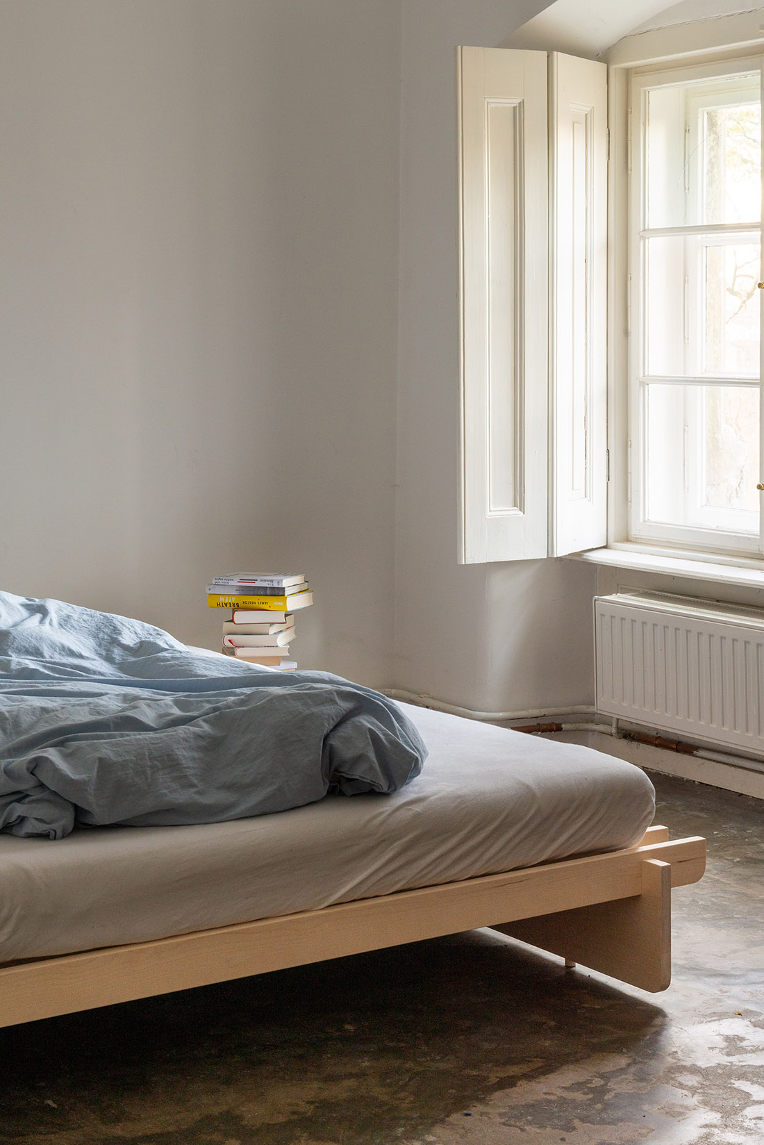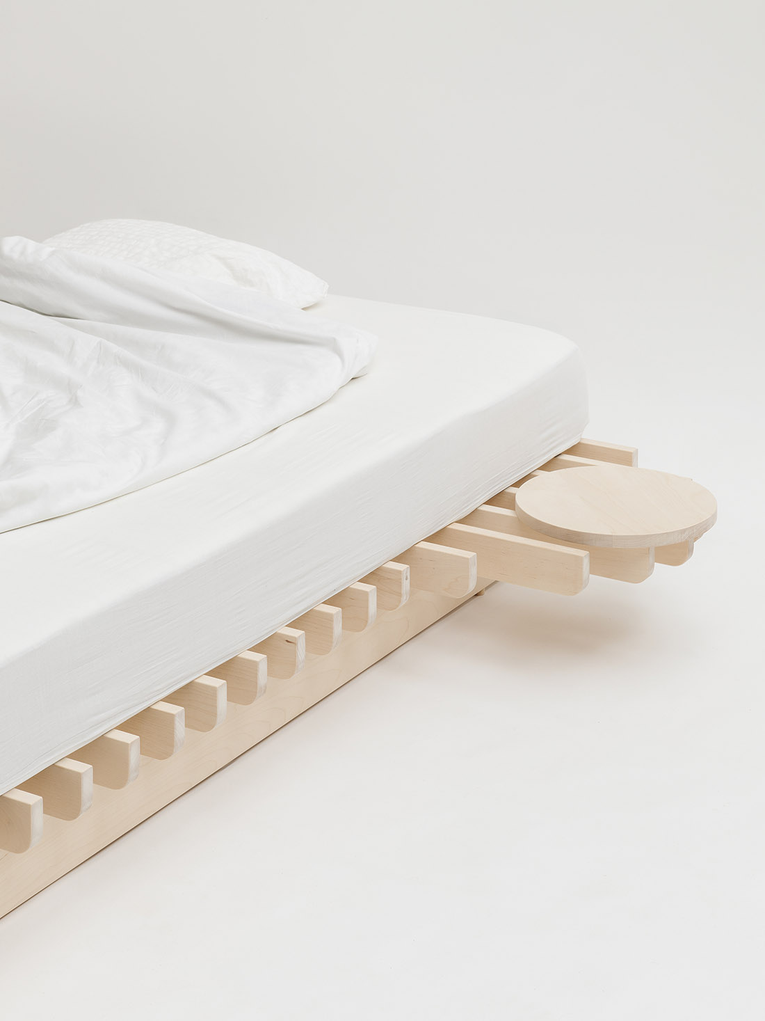 The bed is reduced to its essential elements: sleeping, lying, being, loving, and, of course, reading. Whether it truly appears as a bed is in the eye of the beholder. It consists of a few boards assembled quickly, designed simply for rest.