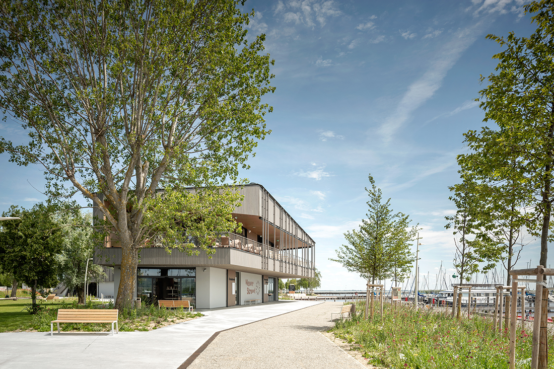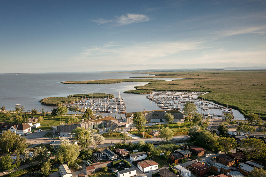 The core design concept is to bring the lake to the building, rather than the building to the lake. As a result, the central marina building visually recedes into the landscape, framing the breathtaking natural scenery. By bending the two-story structure and breaking up its volume with strategic interruptions, the design creates a dynamic, multifaceted composition with numerous vantage points overlooking the lake and expansive reed beds.