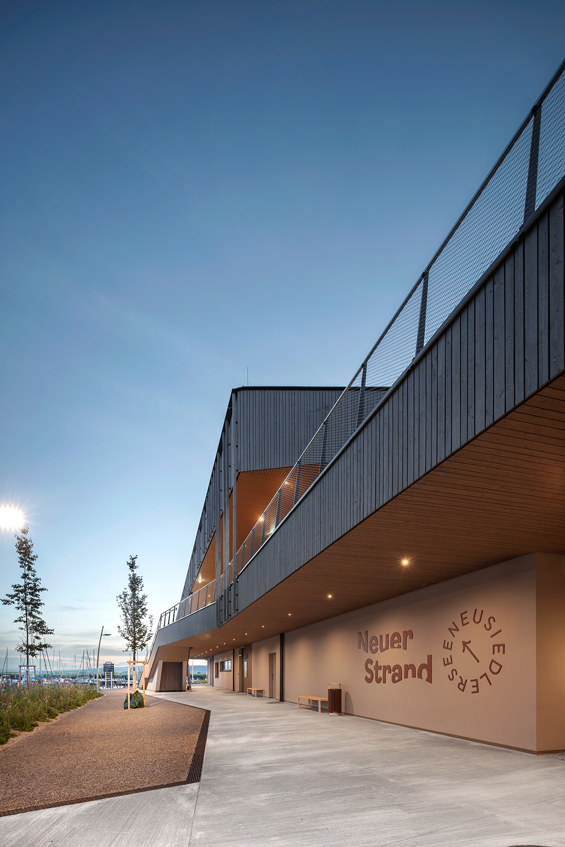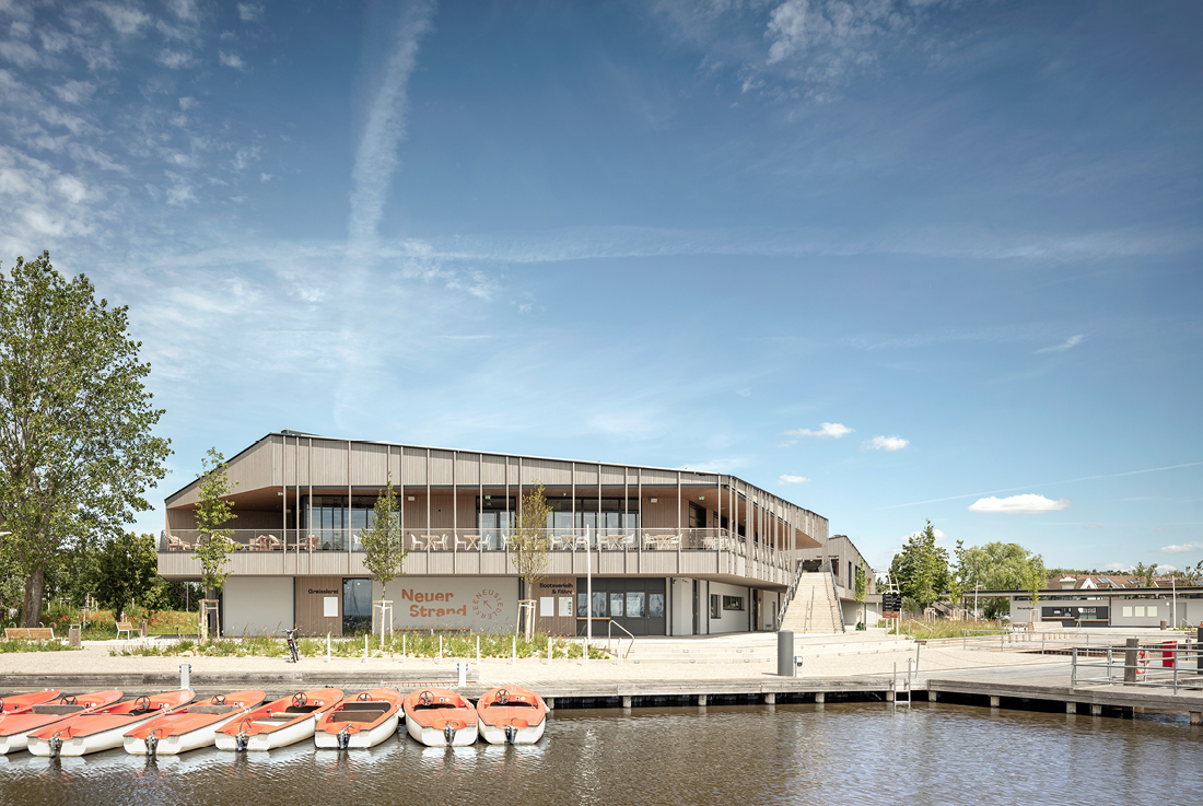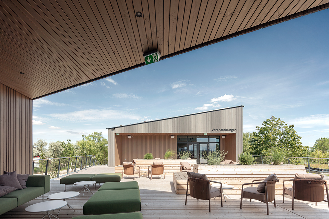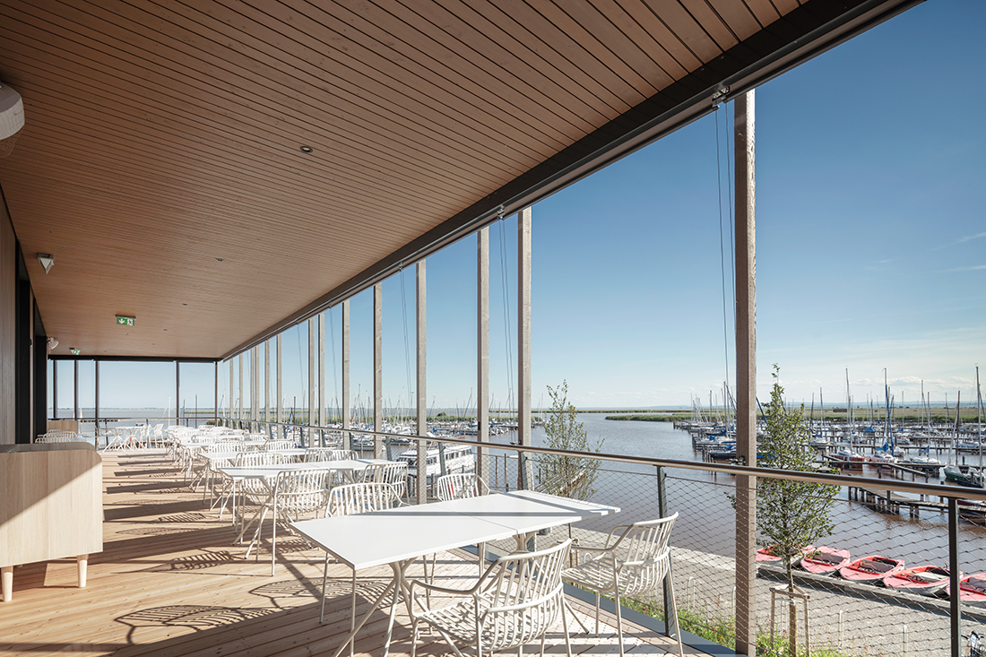 The ground floor and stair cores are constructed using solid materials, while the upper floor and roof are made from prefabricated timber elements. The upper level houses a 160-seat restaurant and an event hall for up to 130 guests. Positioned above the reed beds, the elevated structure offers unparalleled views of the lake, enhancing the connection between architecture and nature.